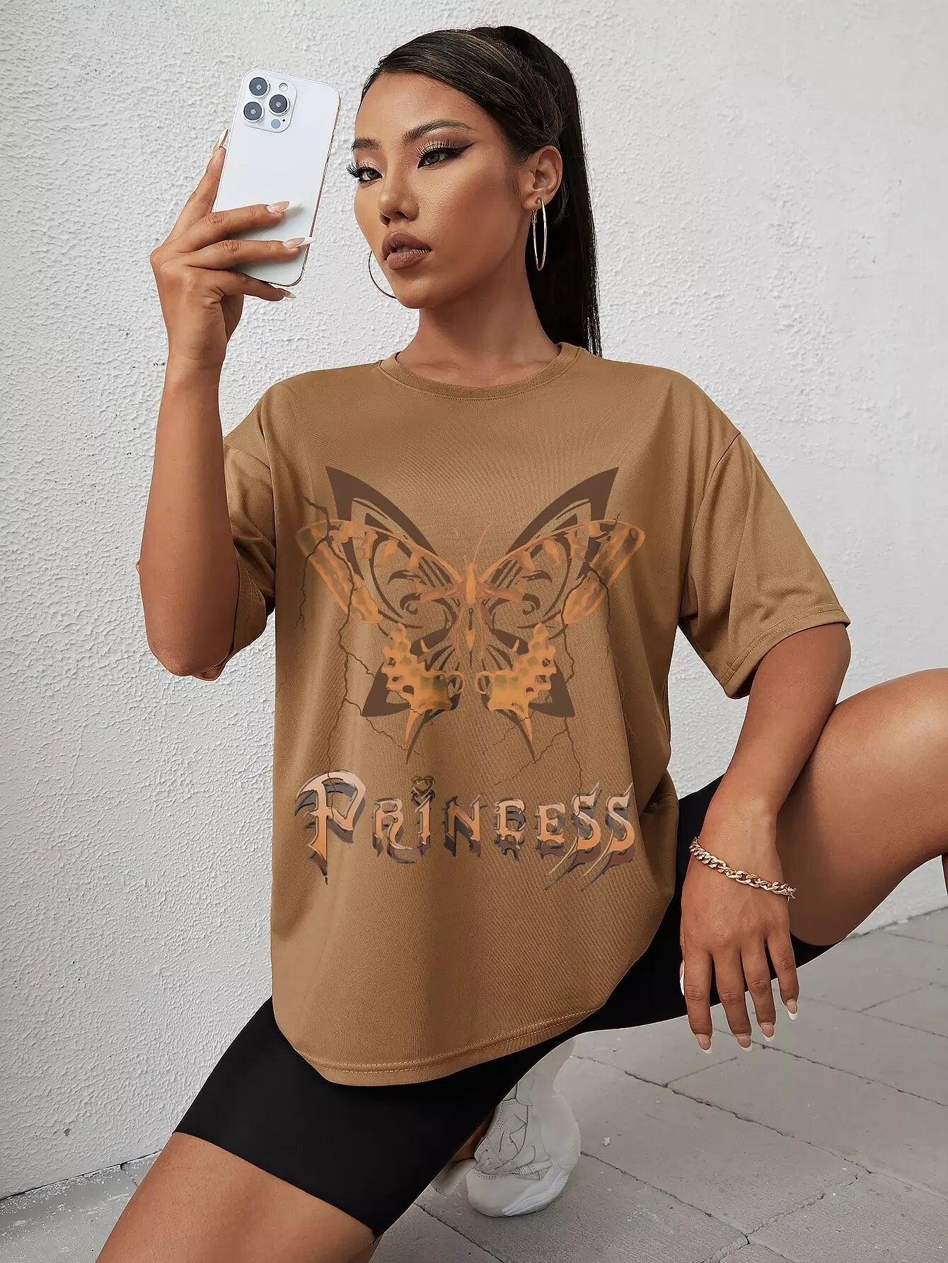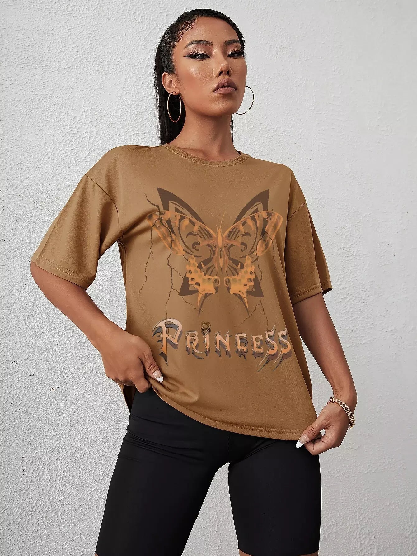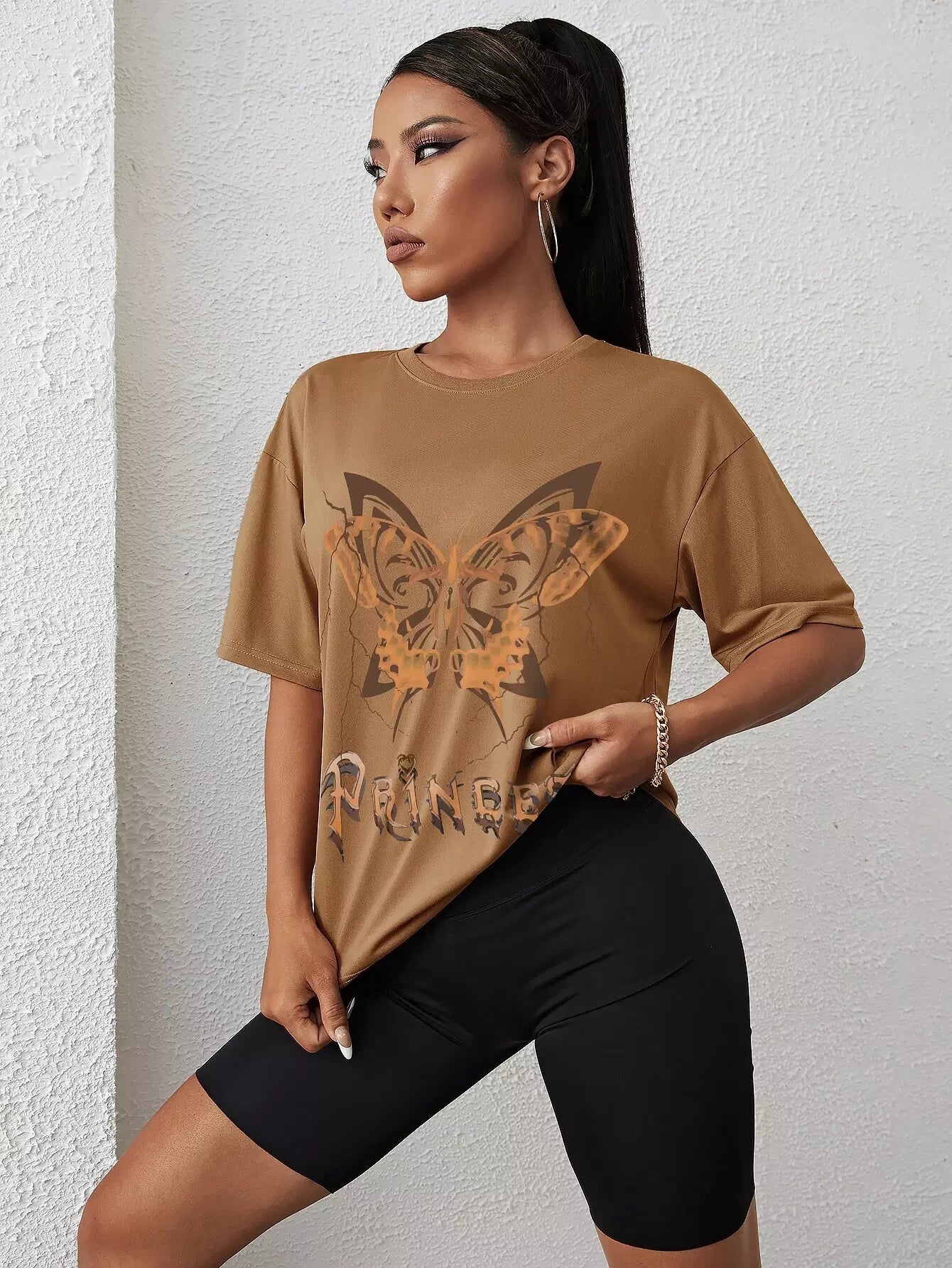 تي شيرت منسدل الكتف برسمة فراشة ورسمة حرف