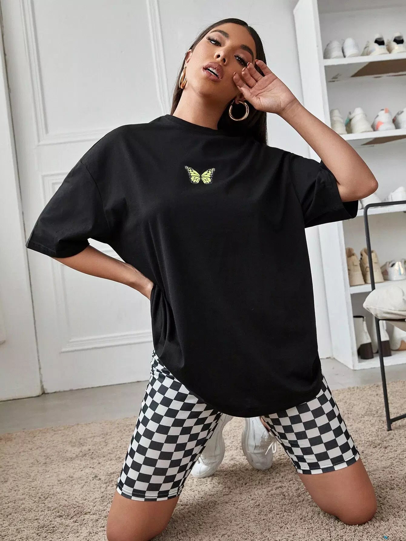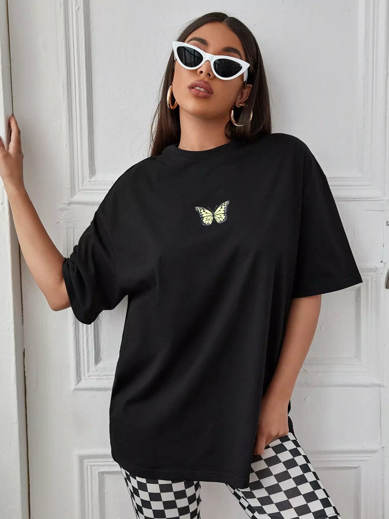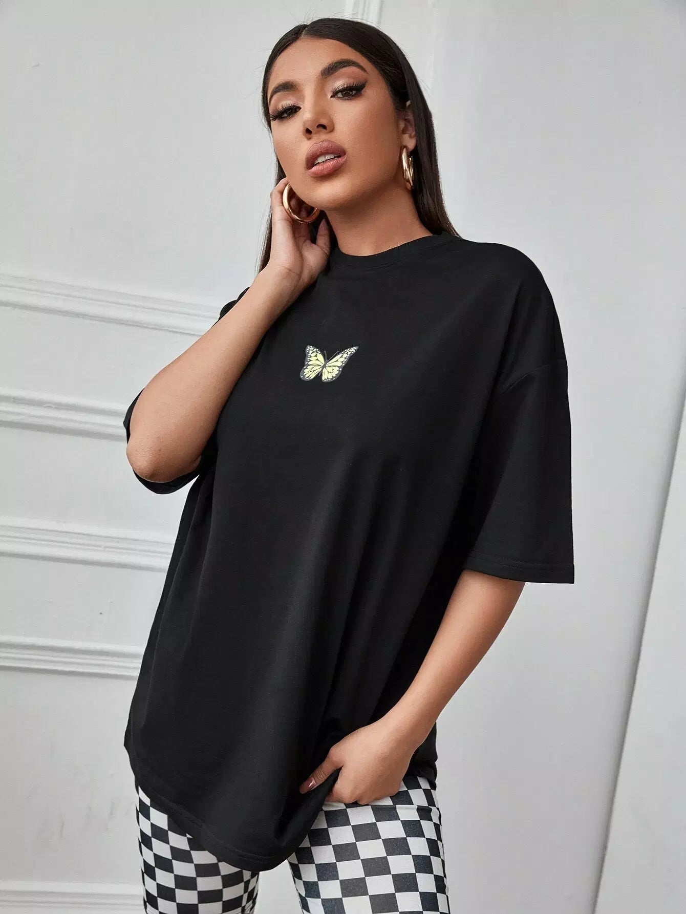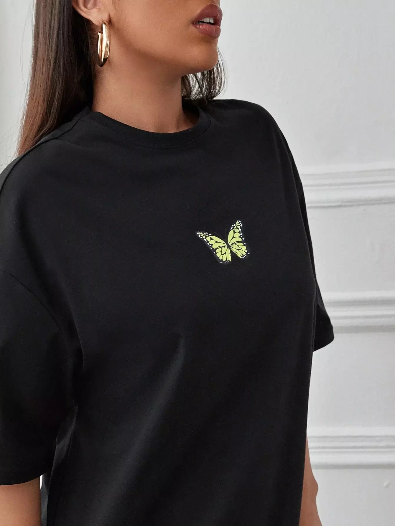 تي شيرت منسدل الكتف بطبعة فراشة كبير الحجم