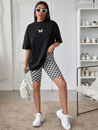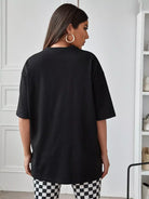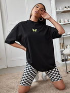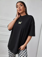 للنساء - تي شيرت كبير الحجم بطباعة فراشة وأكتاف منسدلة