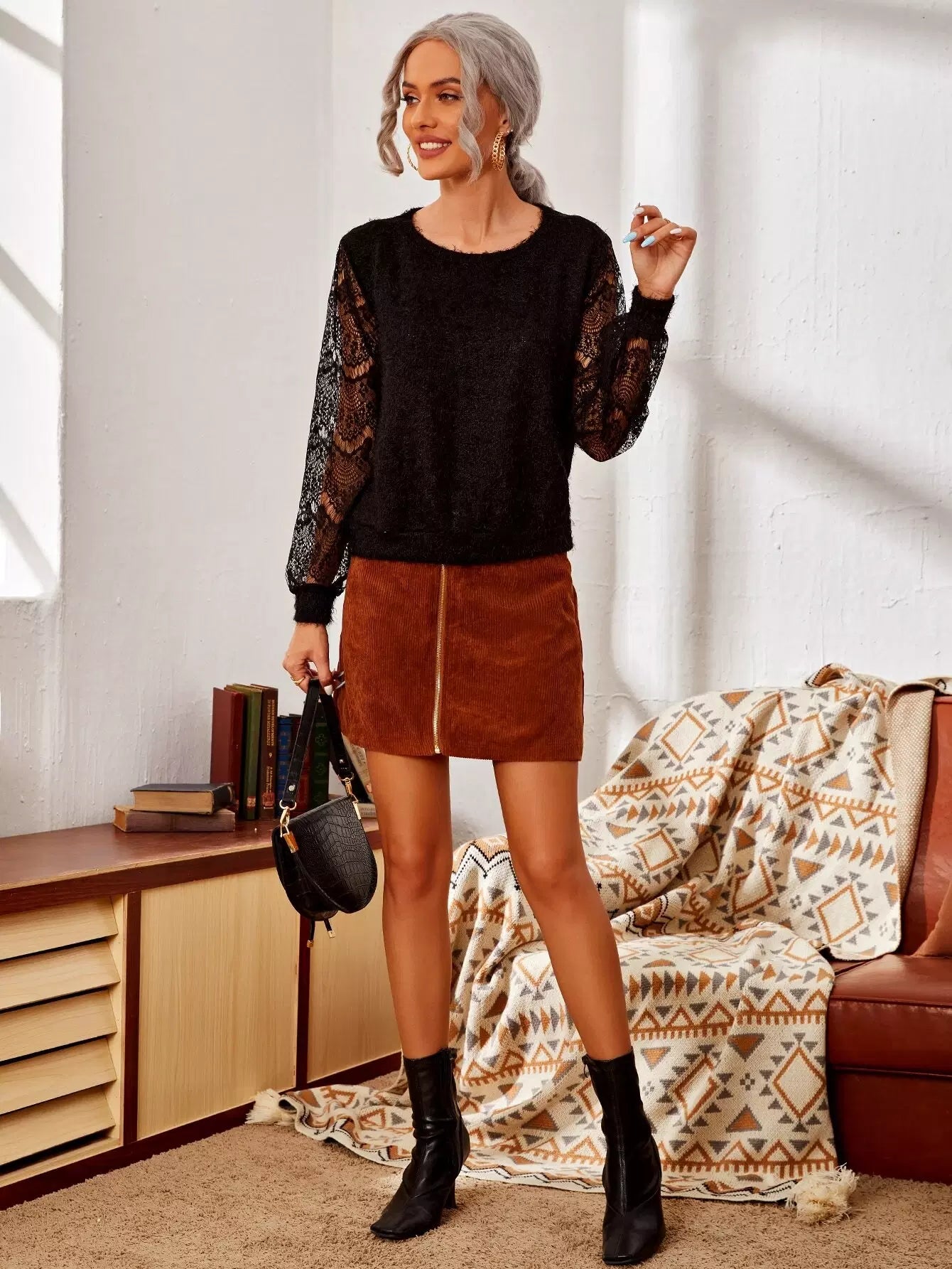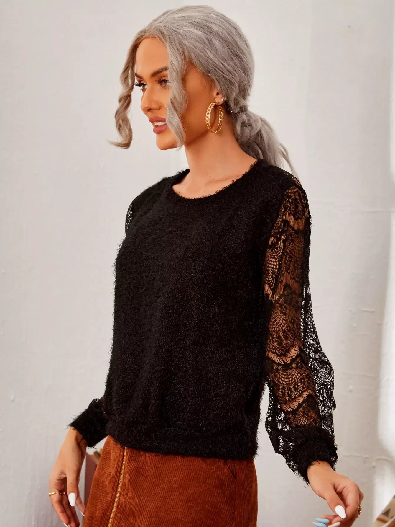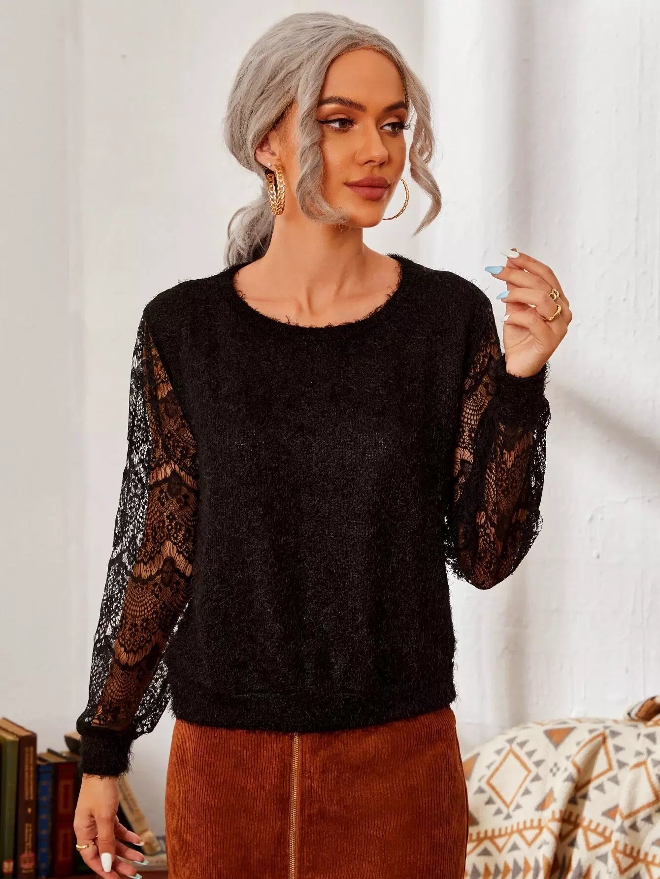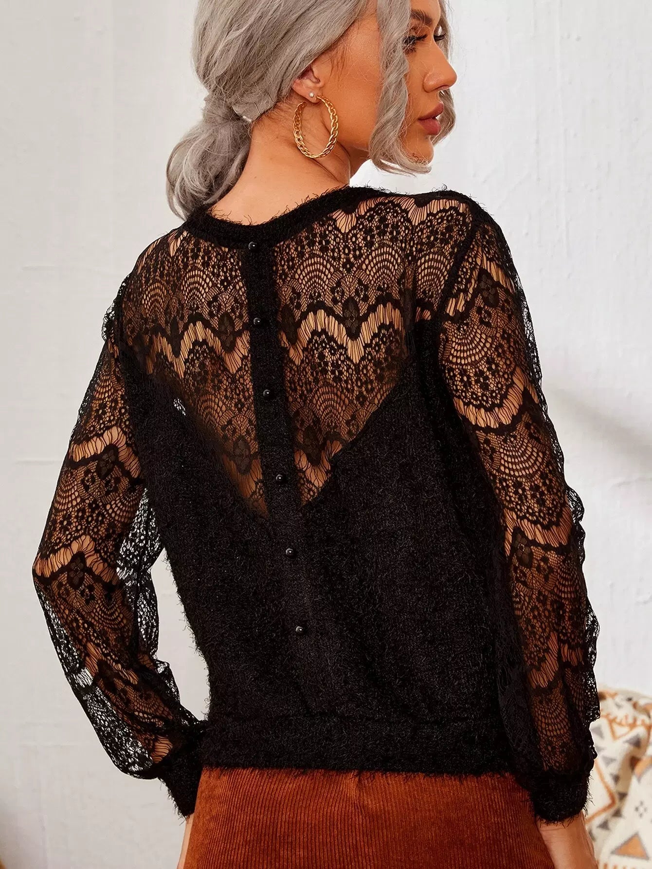تي شيرت بأزرار من الدانتيل من الخلف