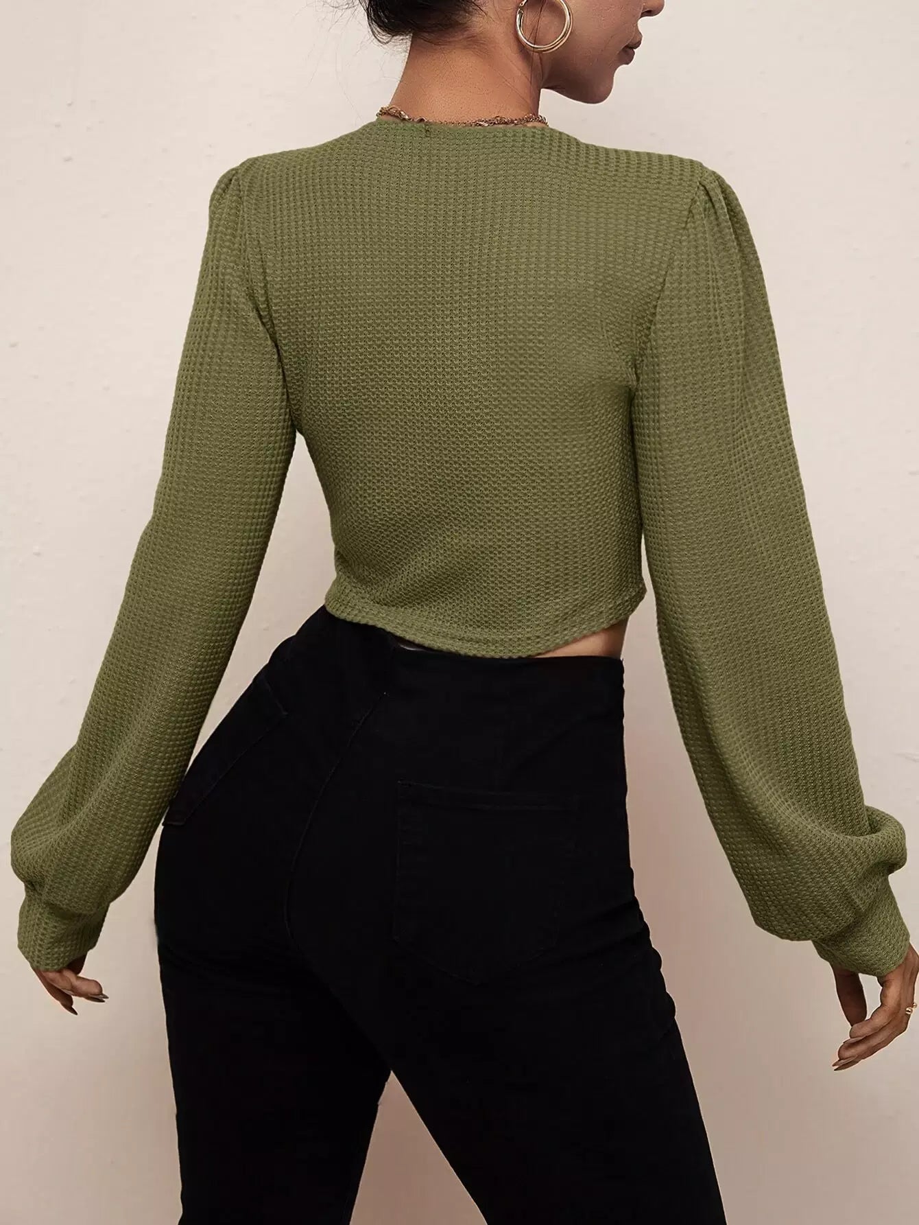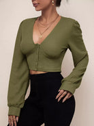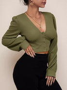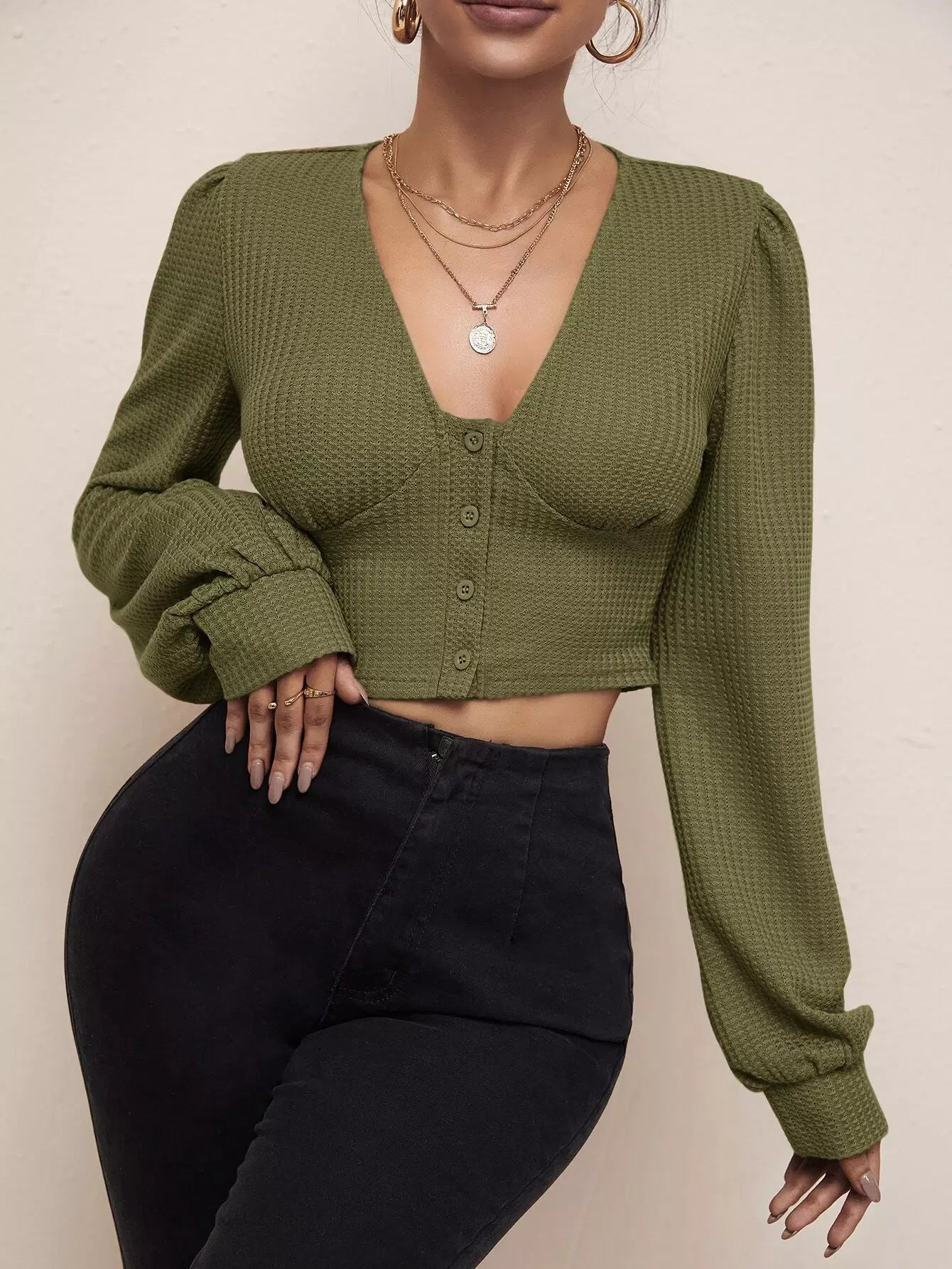 بلوزة بفتحة رقبة على شكل حرف V وأزرار أمامية