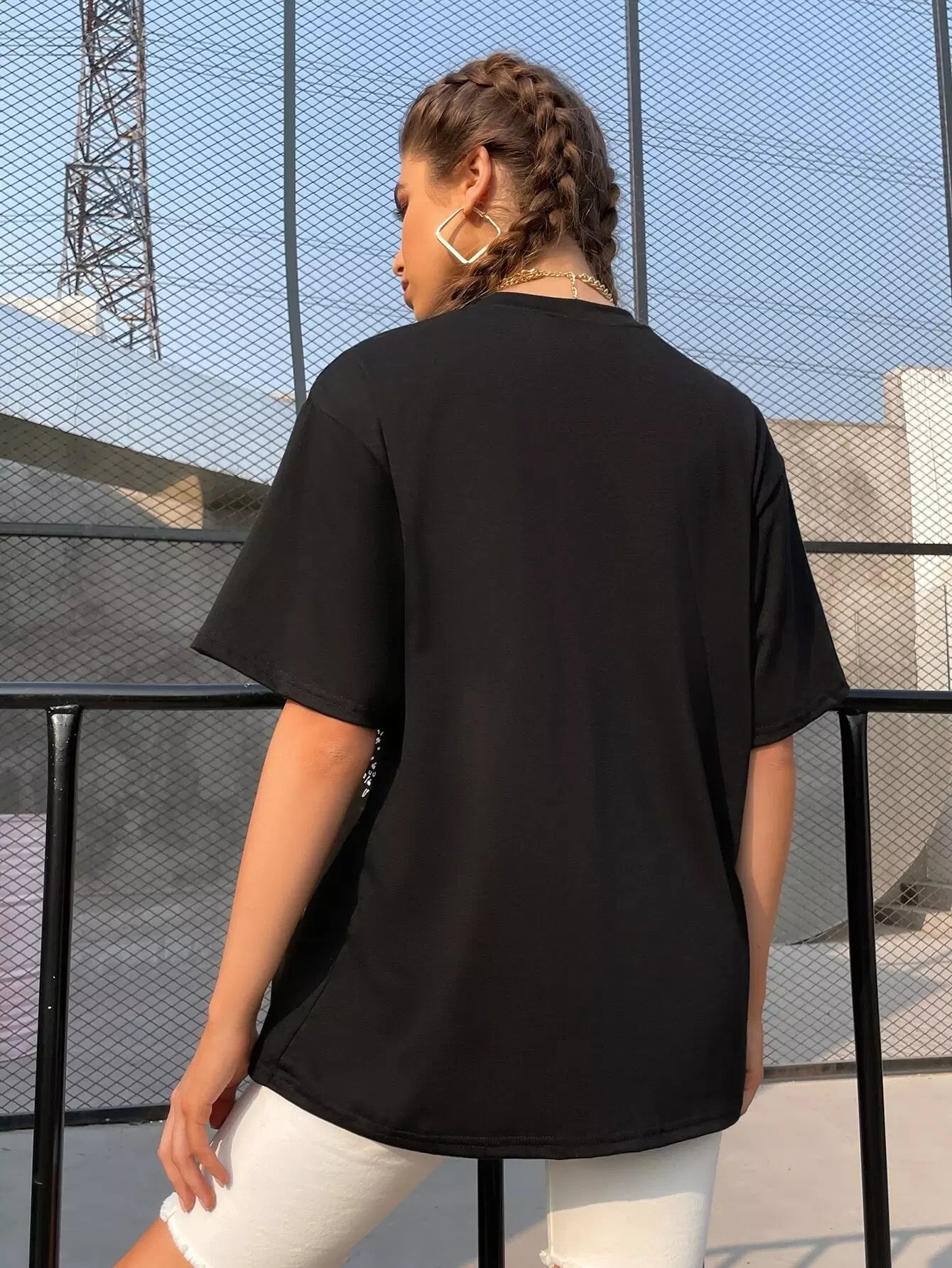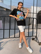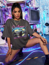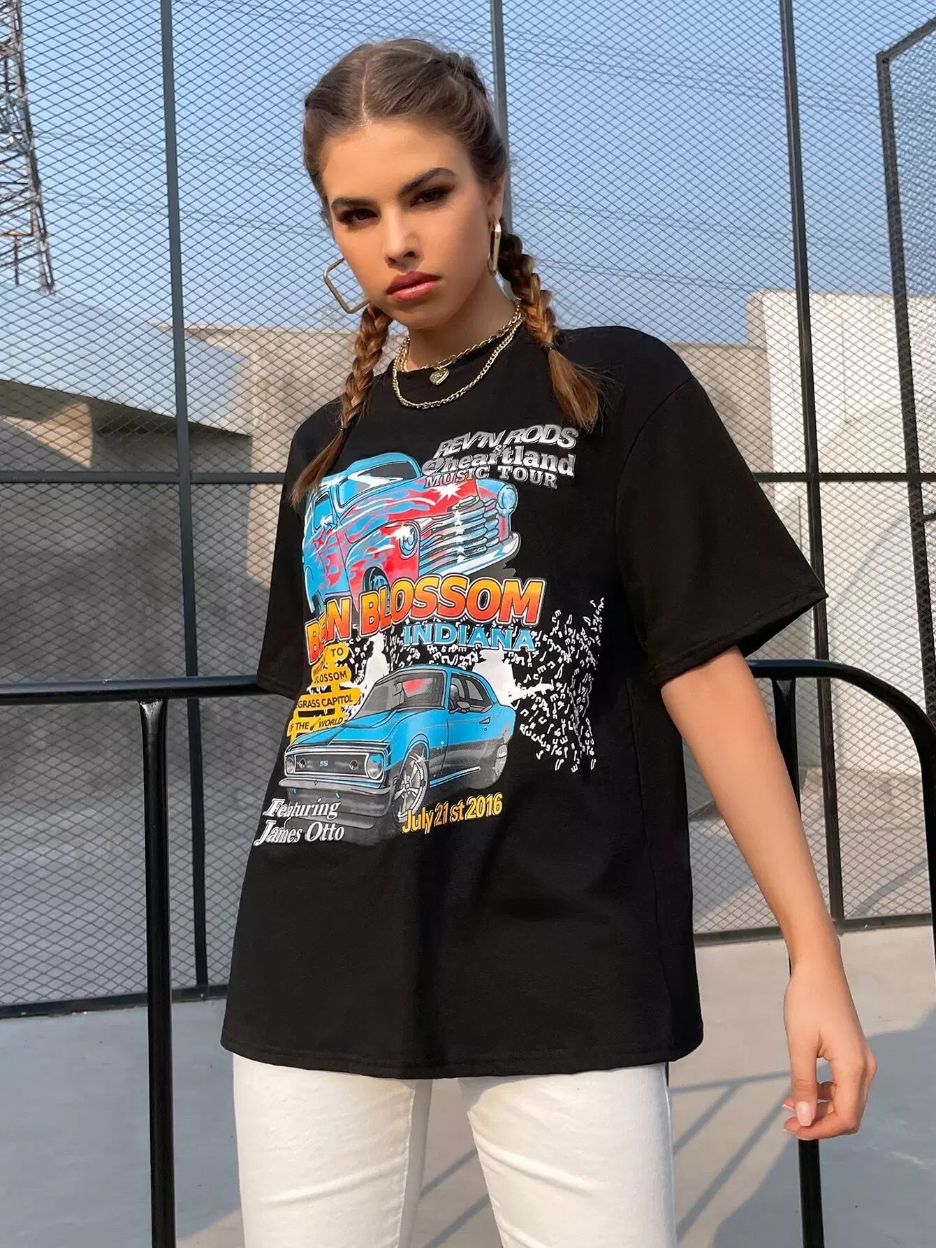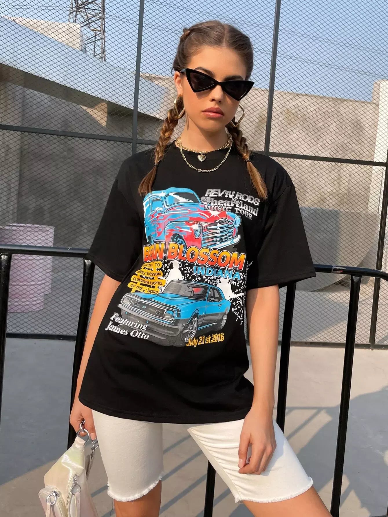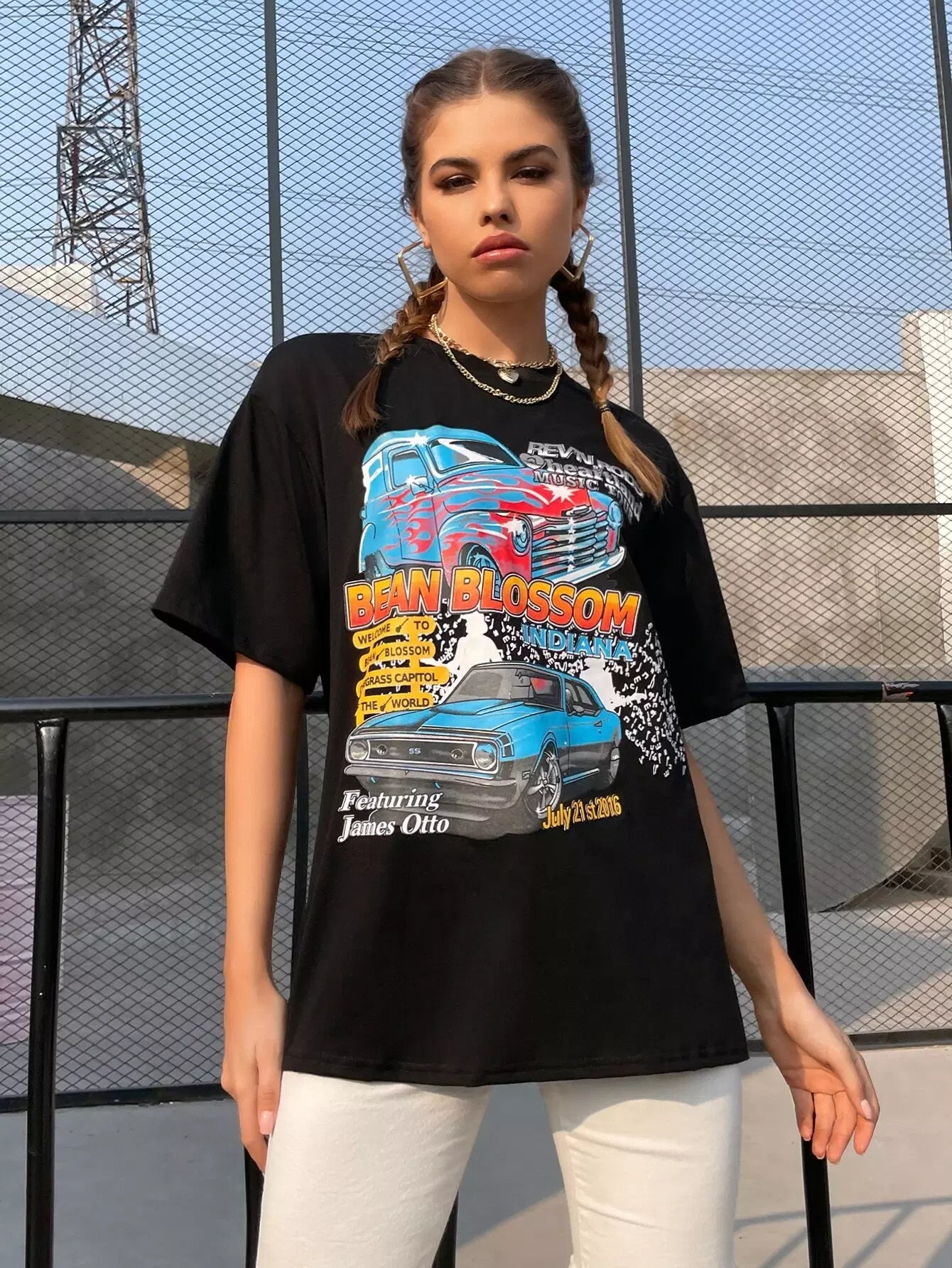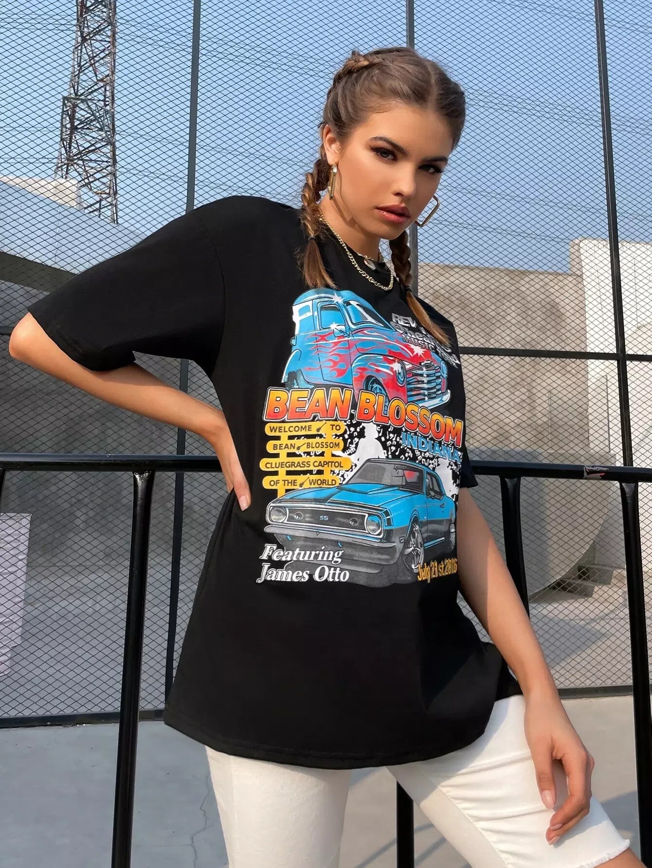 تي شيرت منسدل الكتف برسمة سيارة وحرف