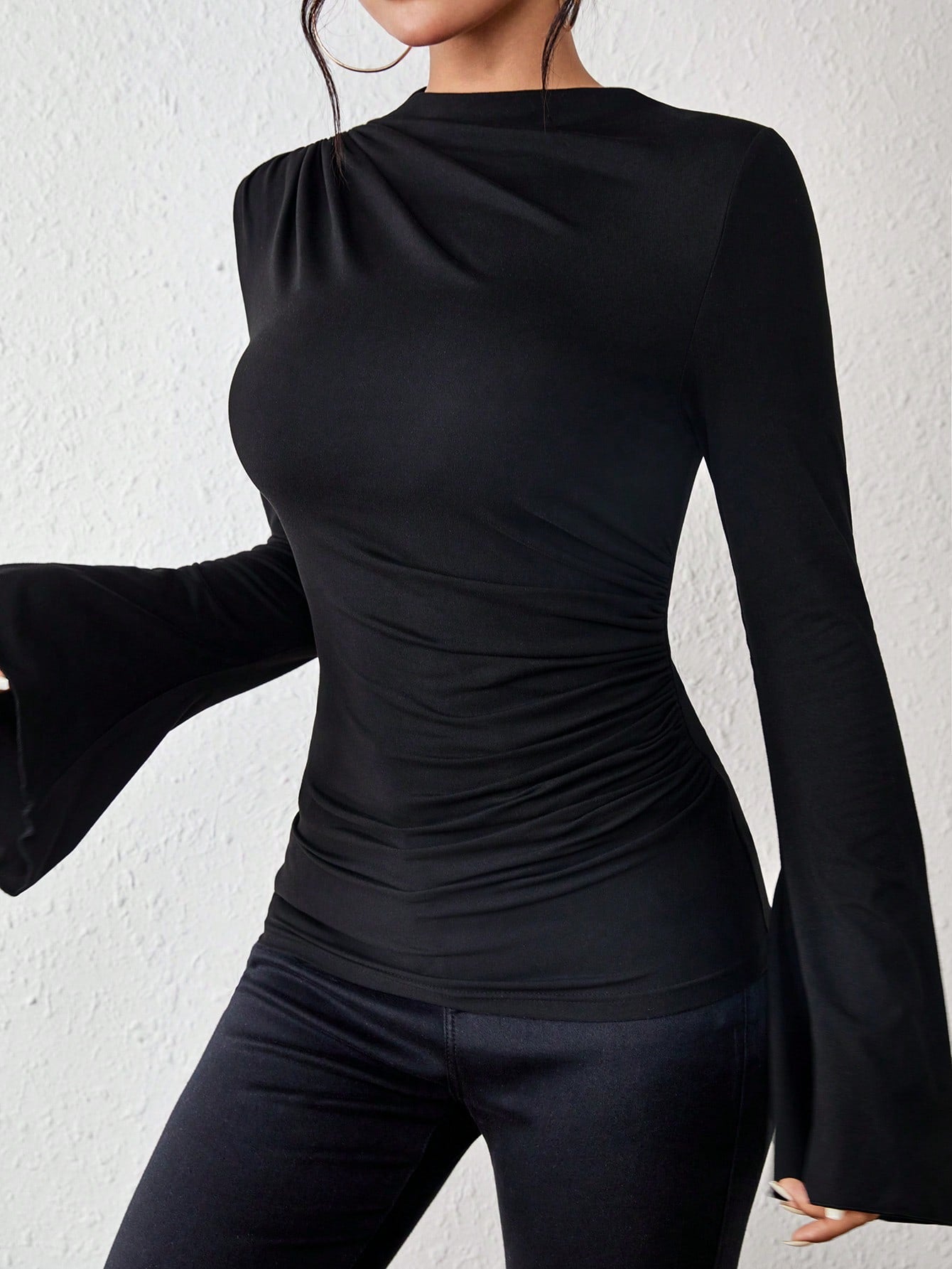 women Chiquease Solid Ruched Front Flare Sleeve Tee Fall Cloth For Women