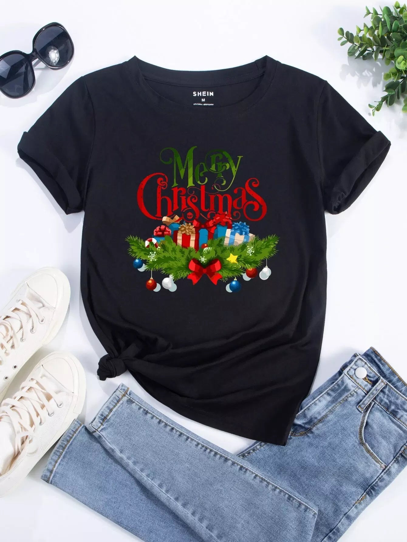 تي شيرت برقبة مستديرة مطبوع عليه طبعة عيد الميلاد