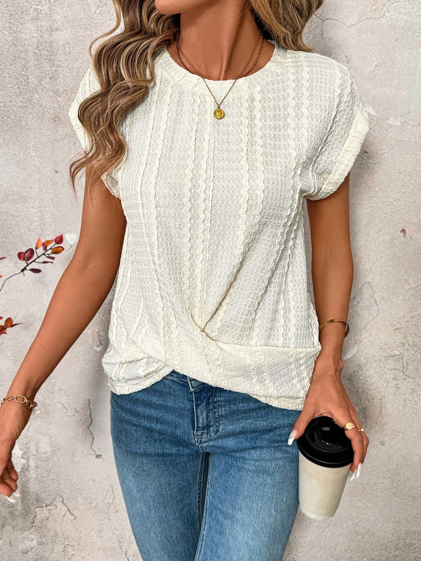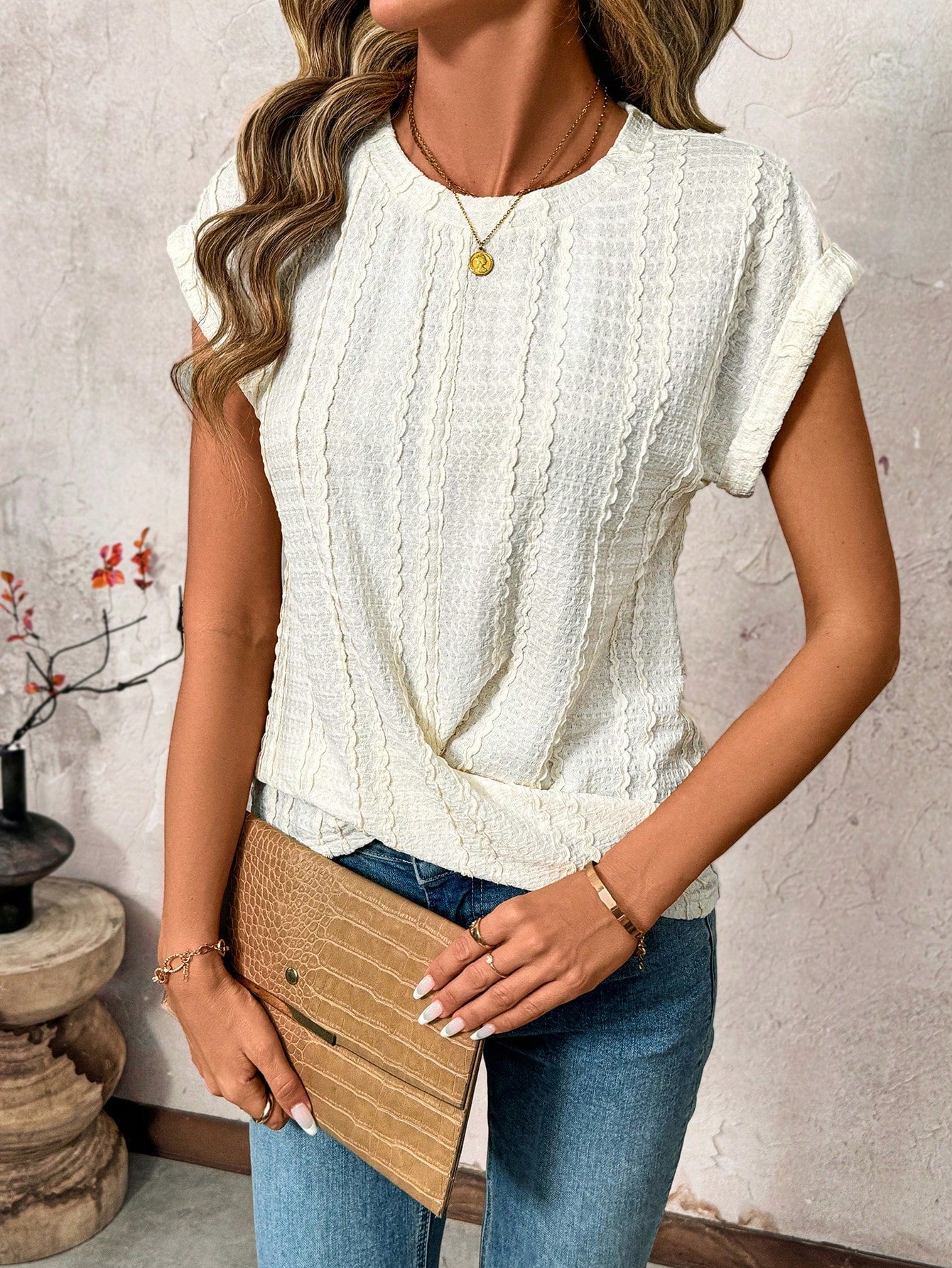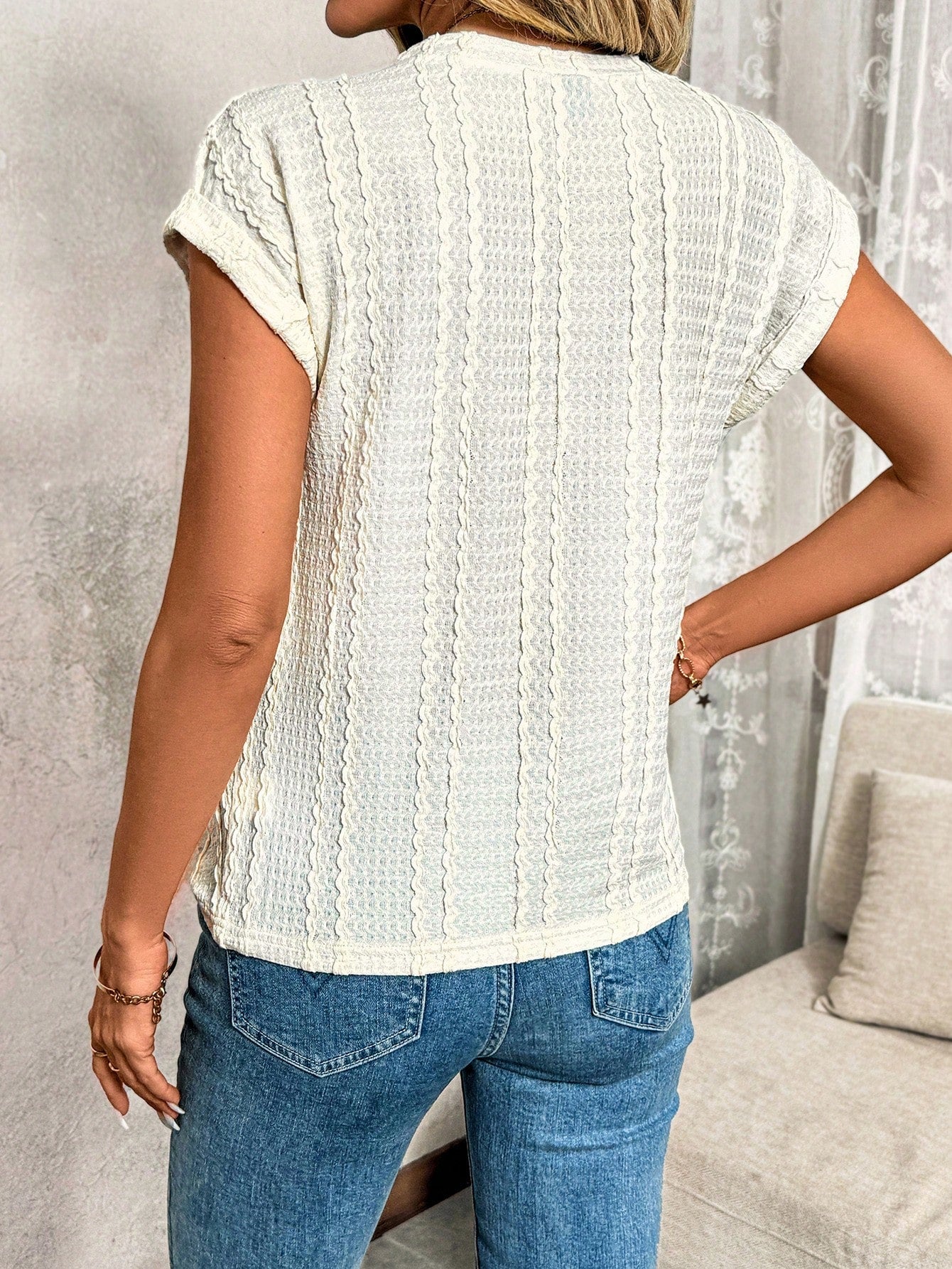 Clasi Ivory Vertical Striped Textured Knit Bodycon Round Neck Short Sleeve Women T-Shirt Summer Outfits