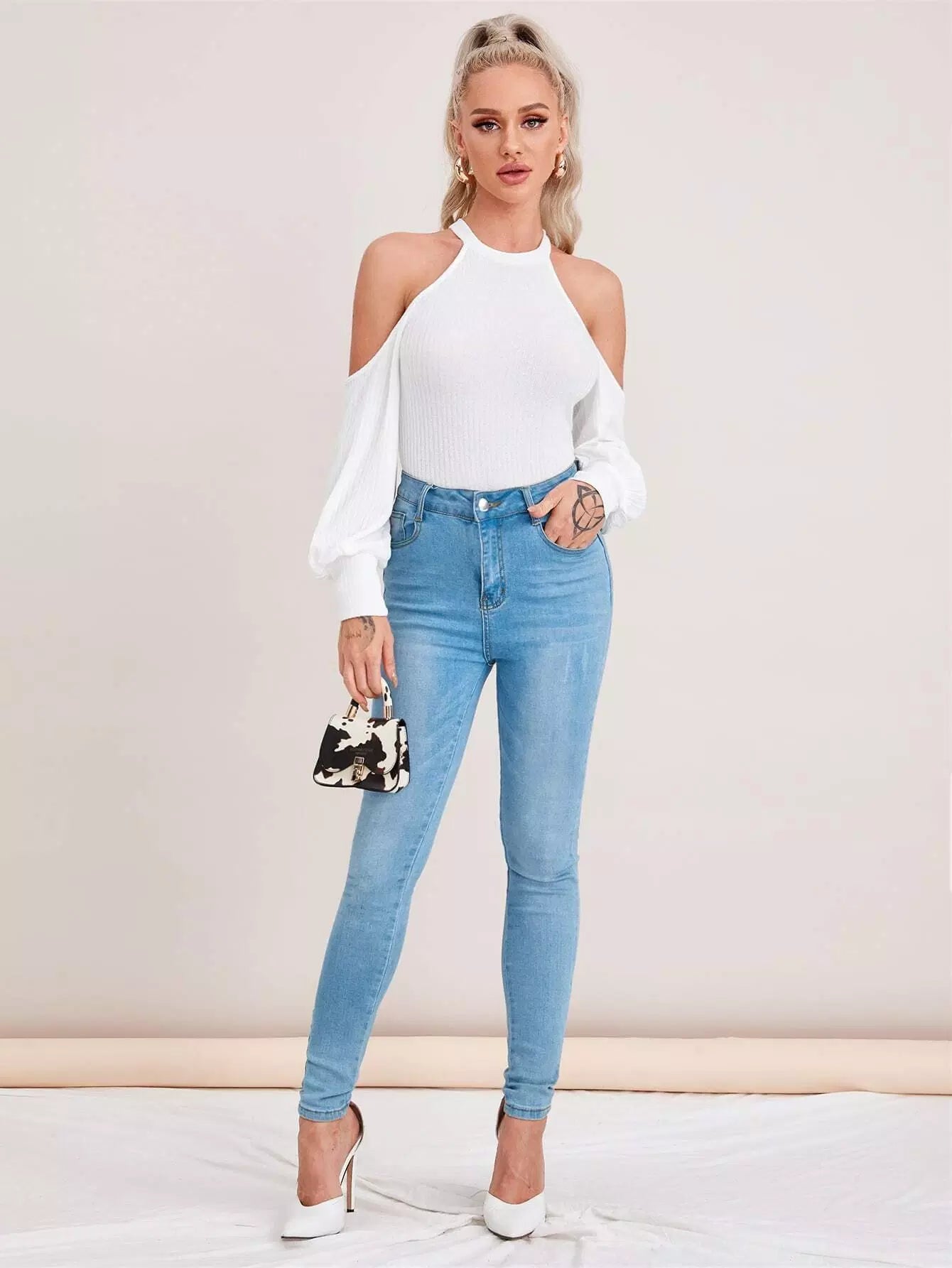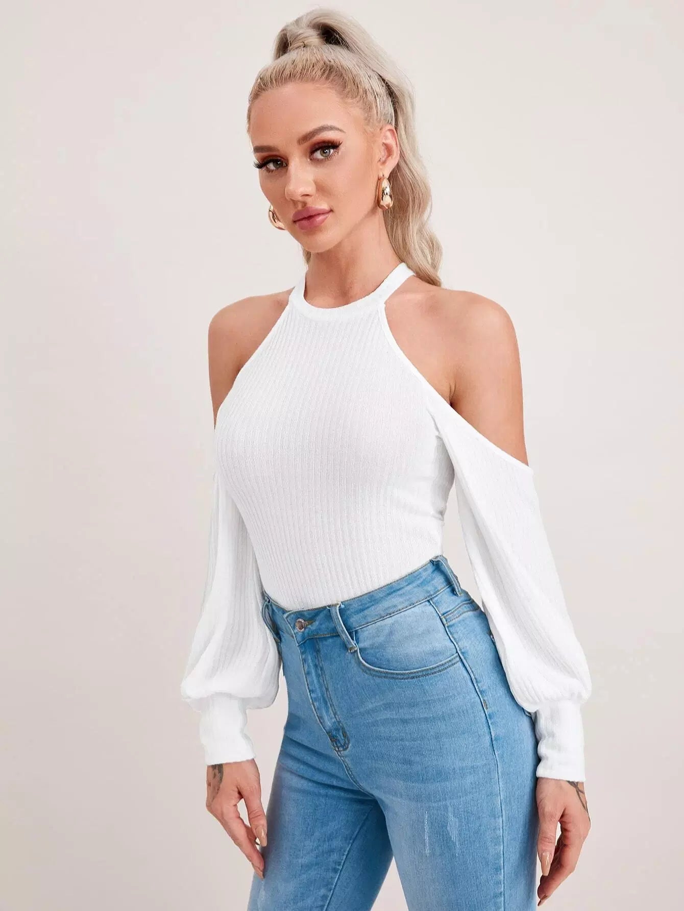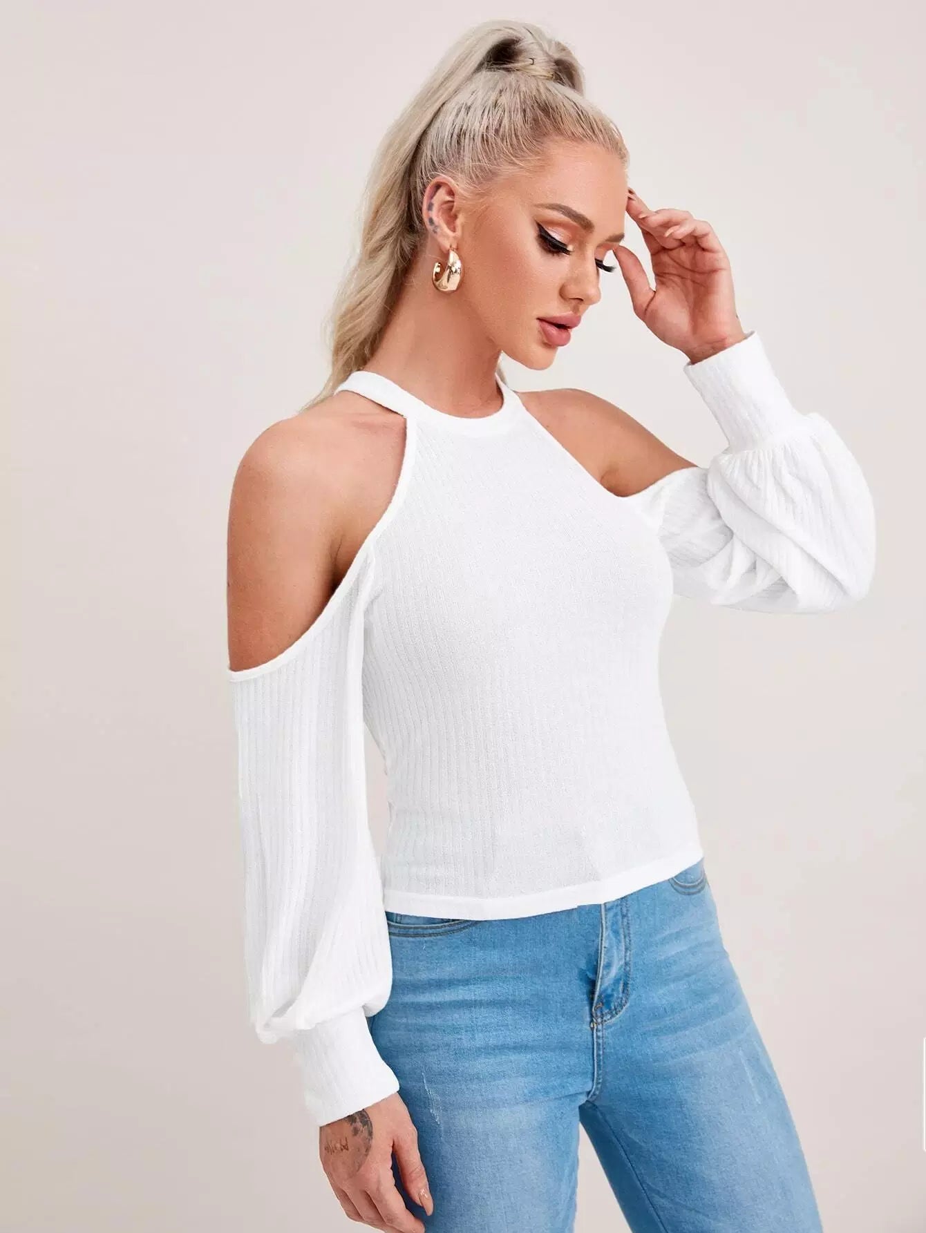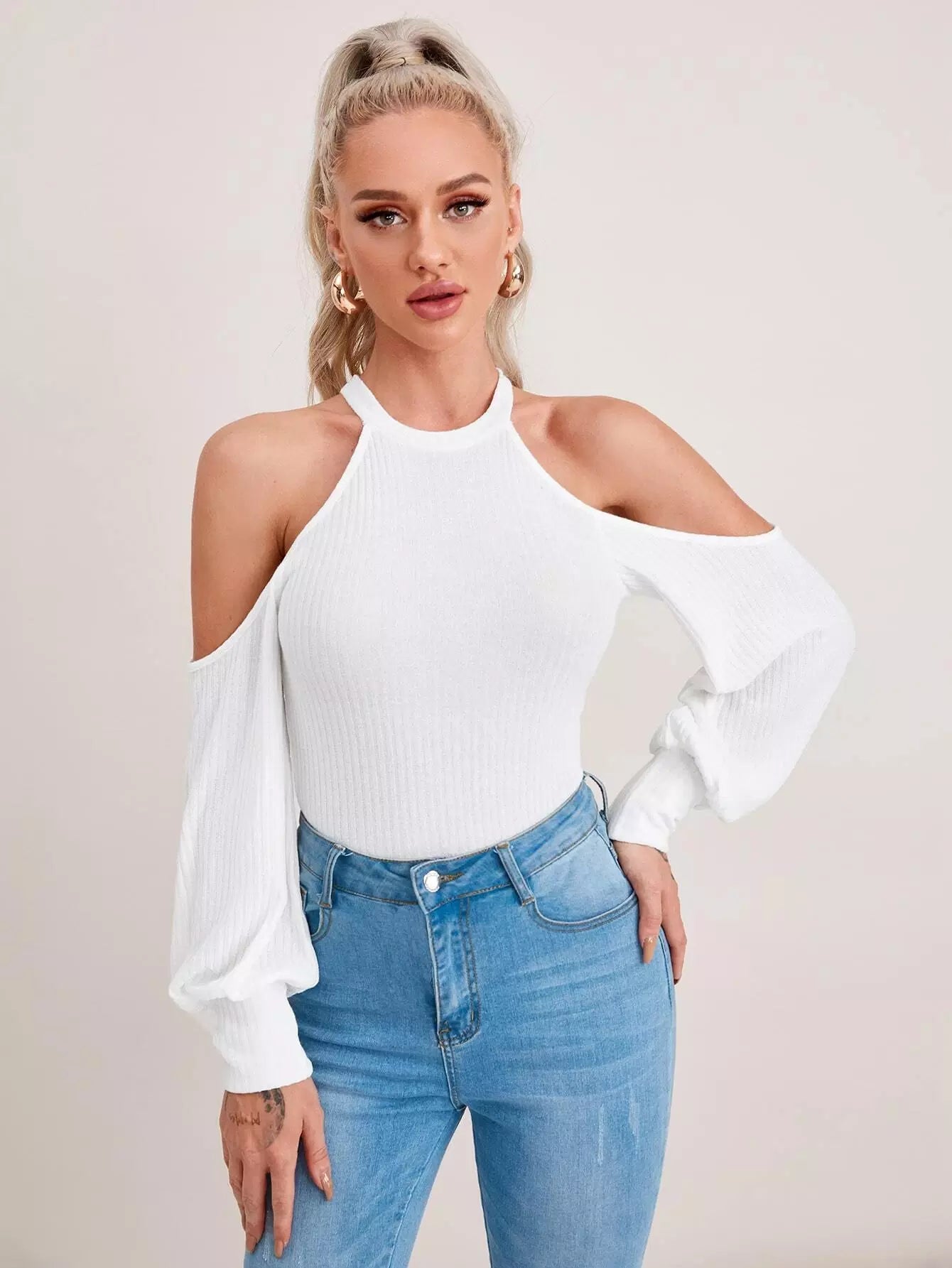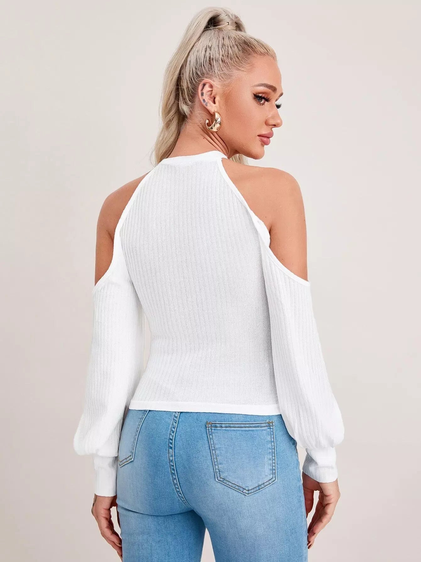 تي شيرت بحياكة على الأكتاف باردة ومحبوكة على شكل ضلع