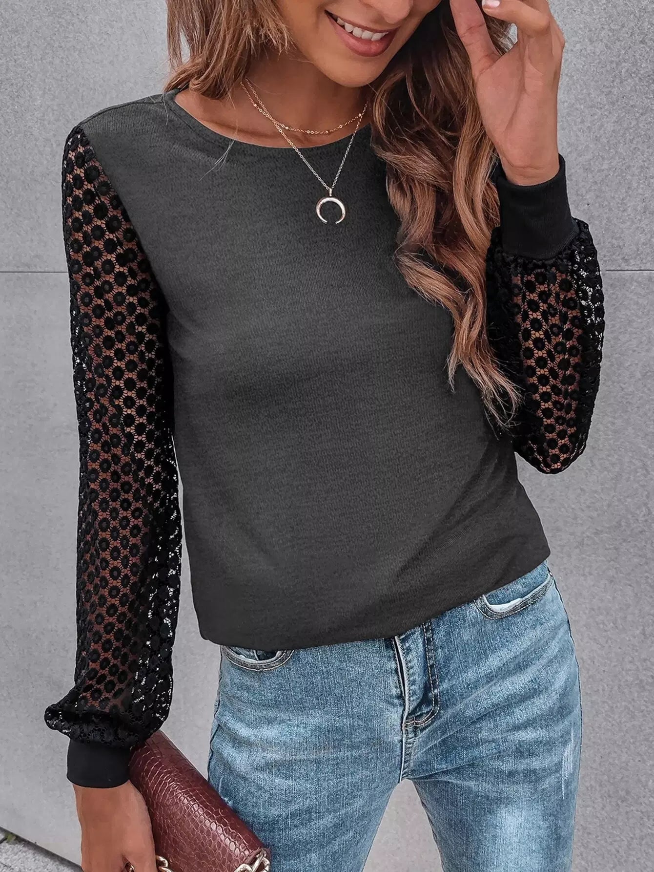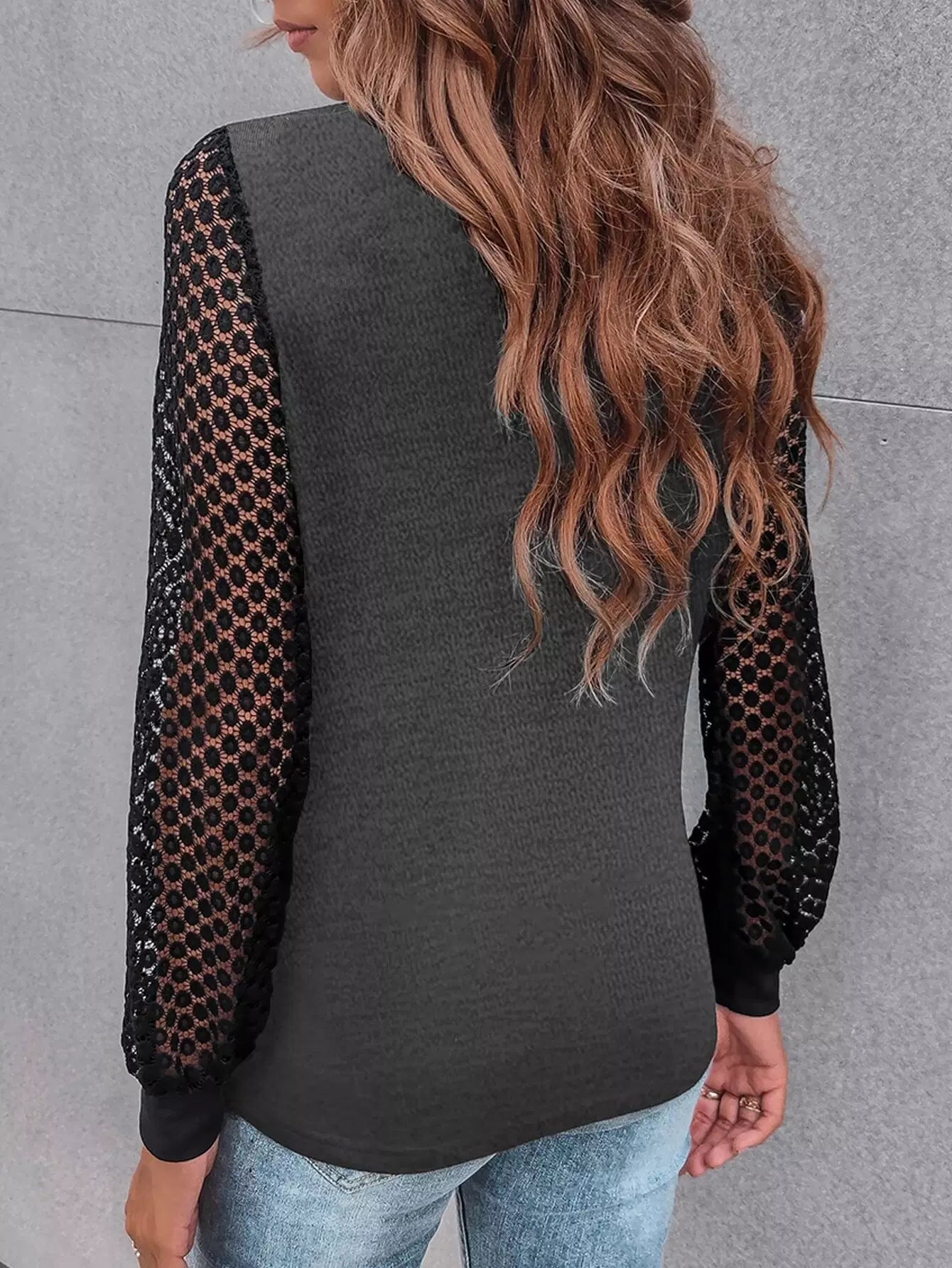 تي شيرت بأكمام من الدانتيل المخرّم بلون مغاير