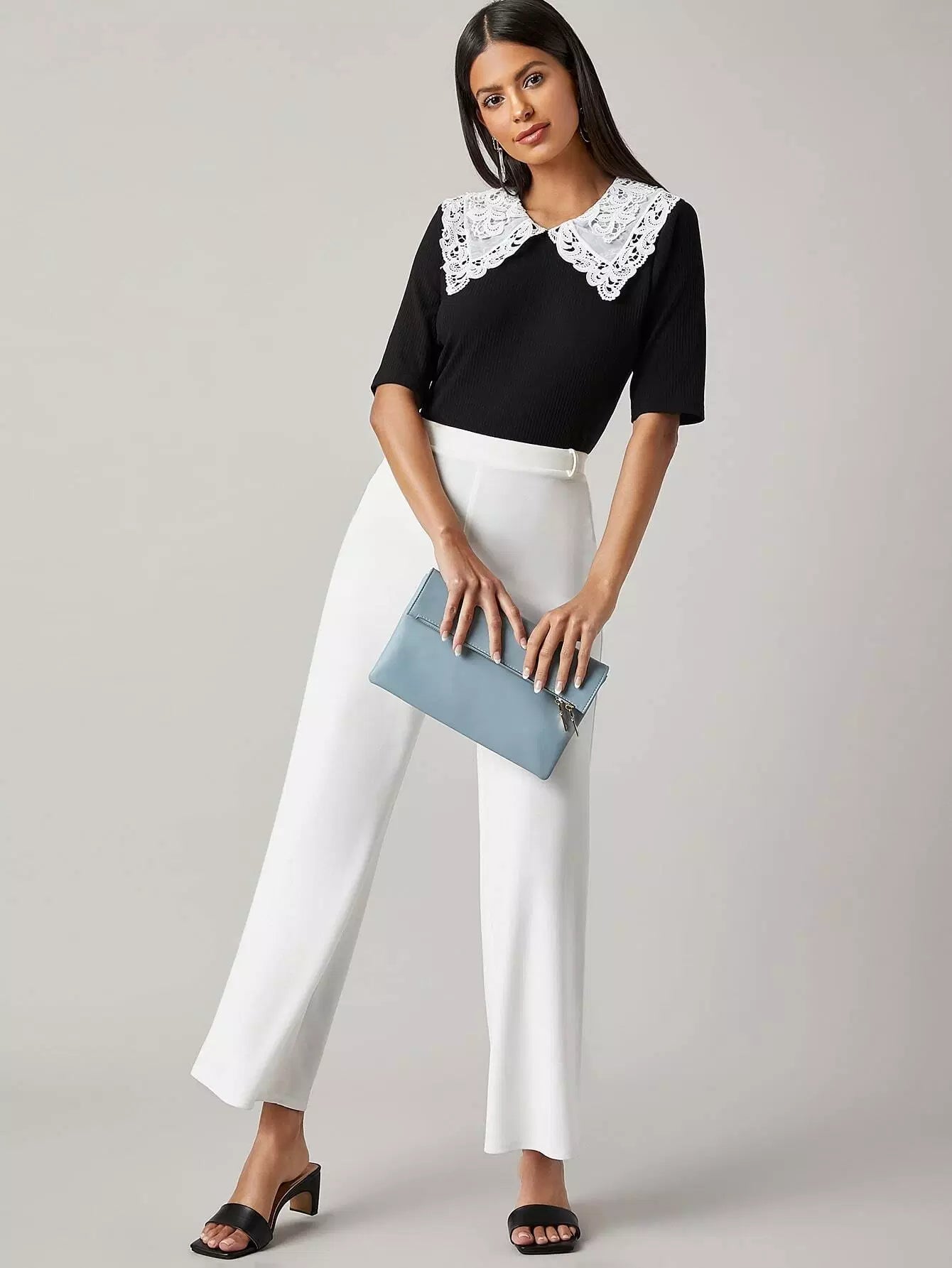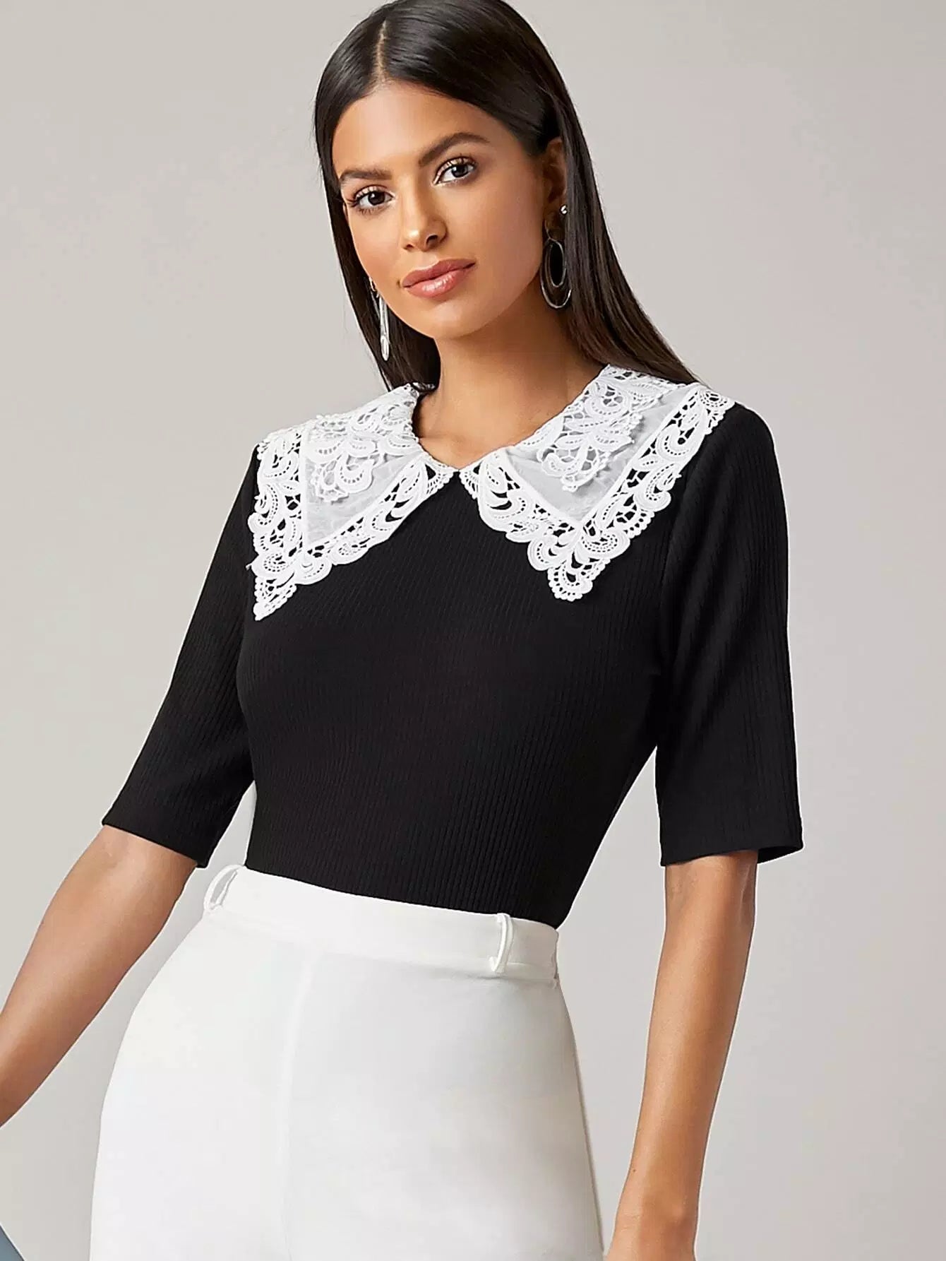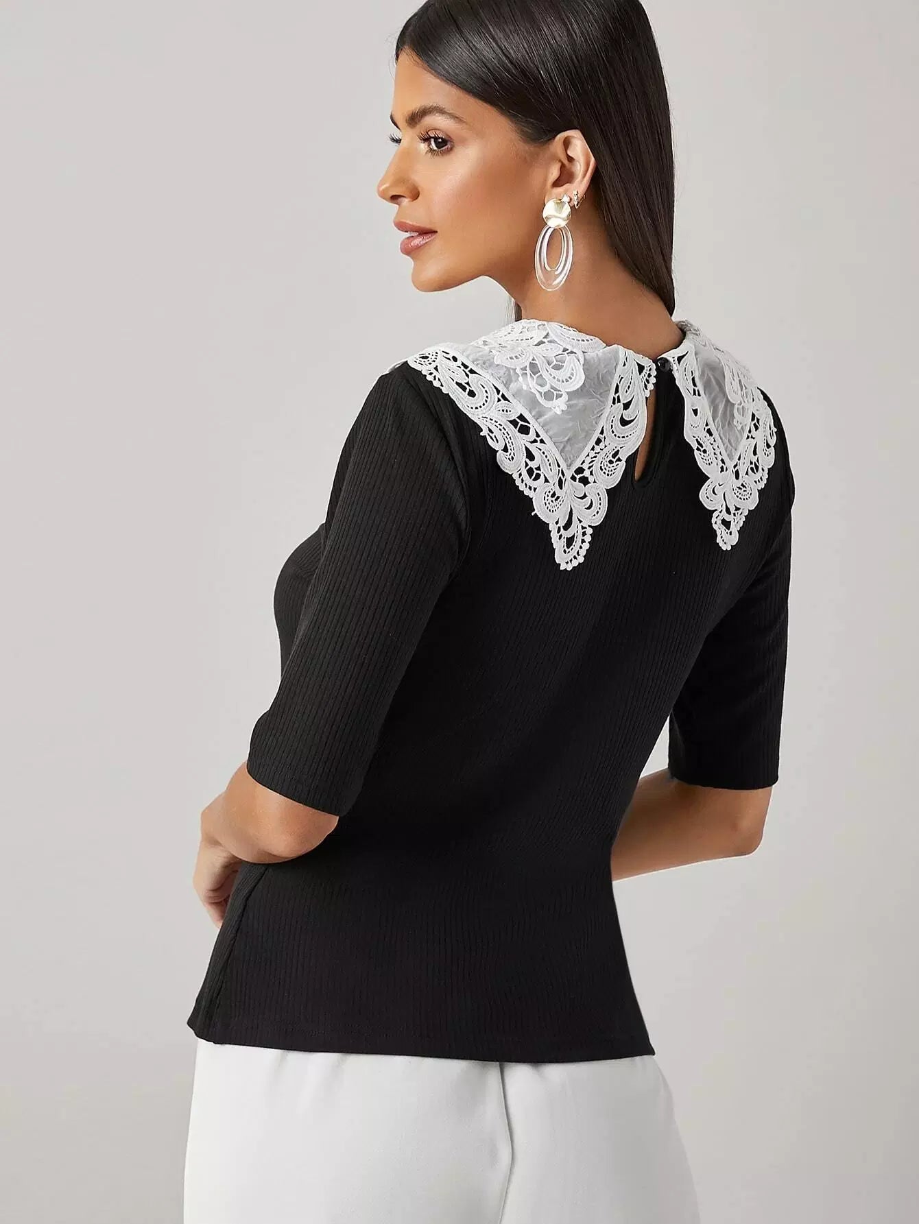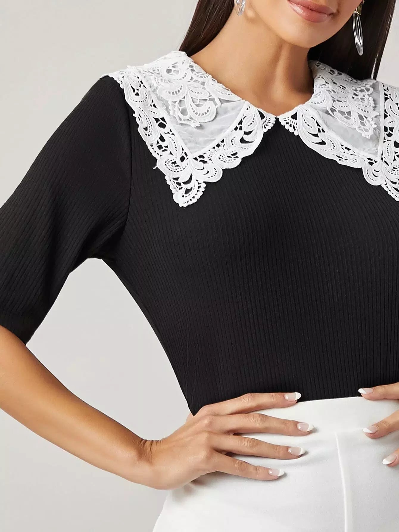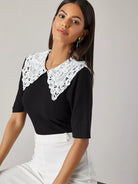 بلوزة محبوكة من الدانتيل المخرم بياقة من الدانتيل المخرم بلون مغاير