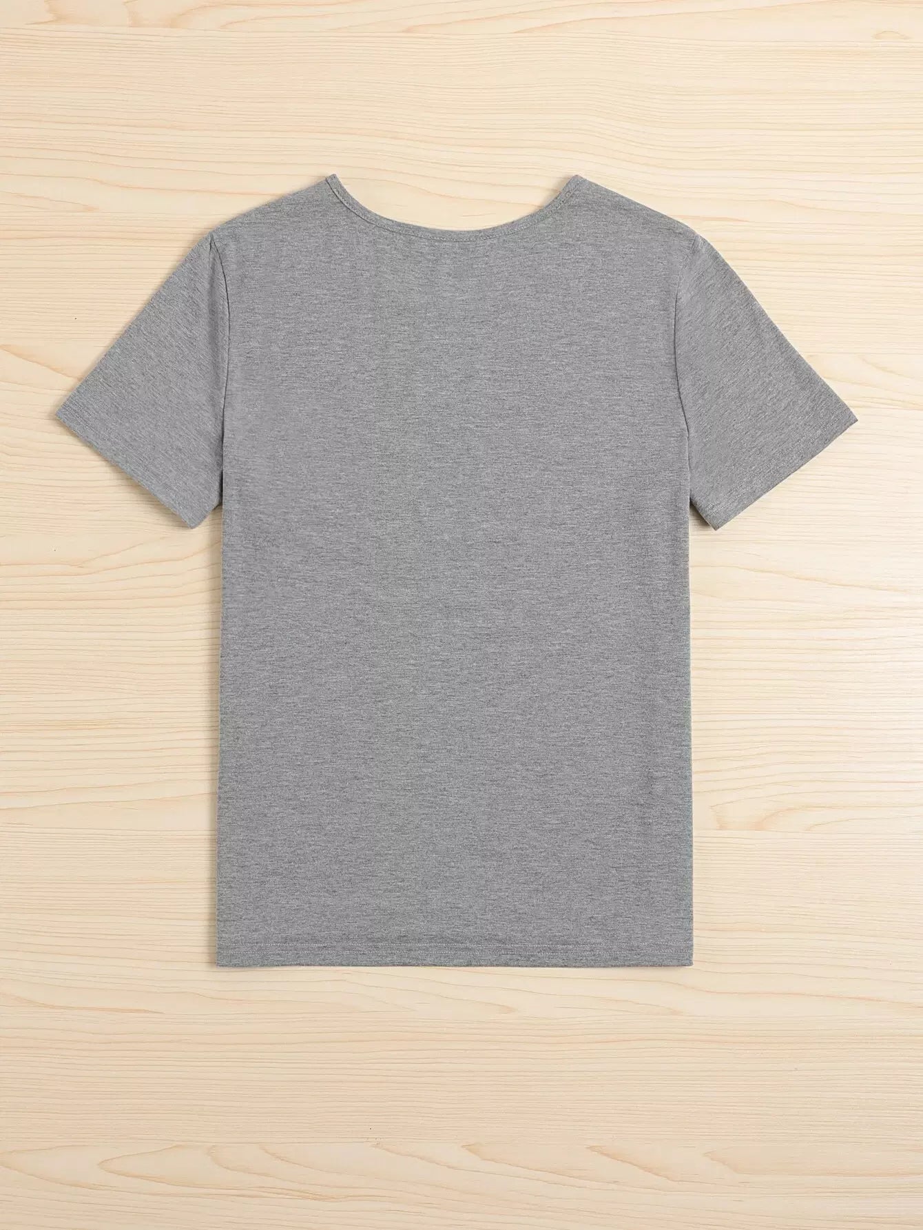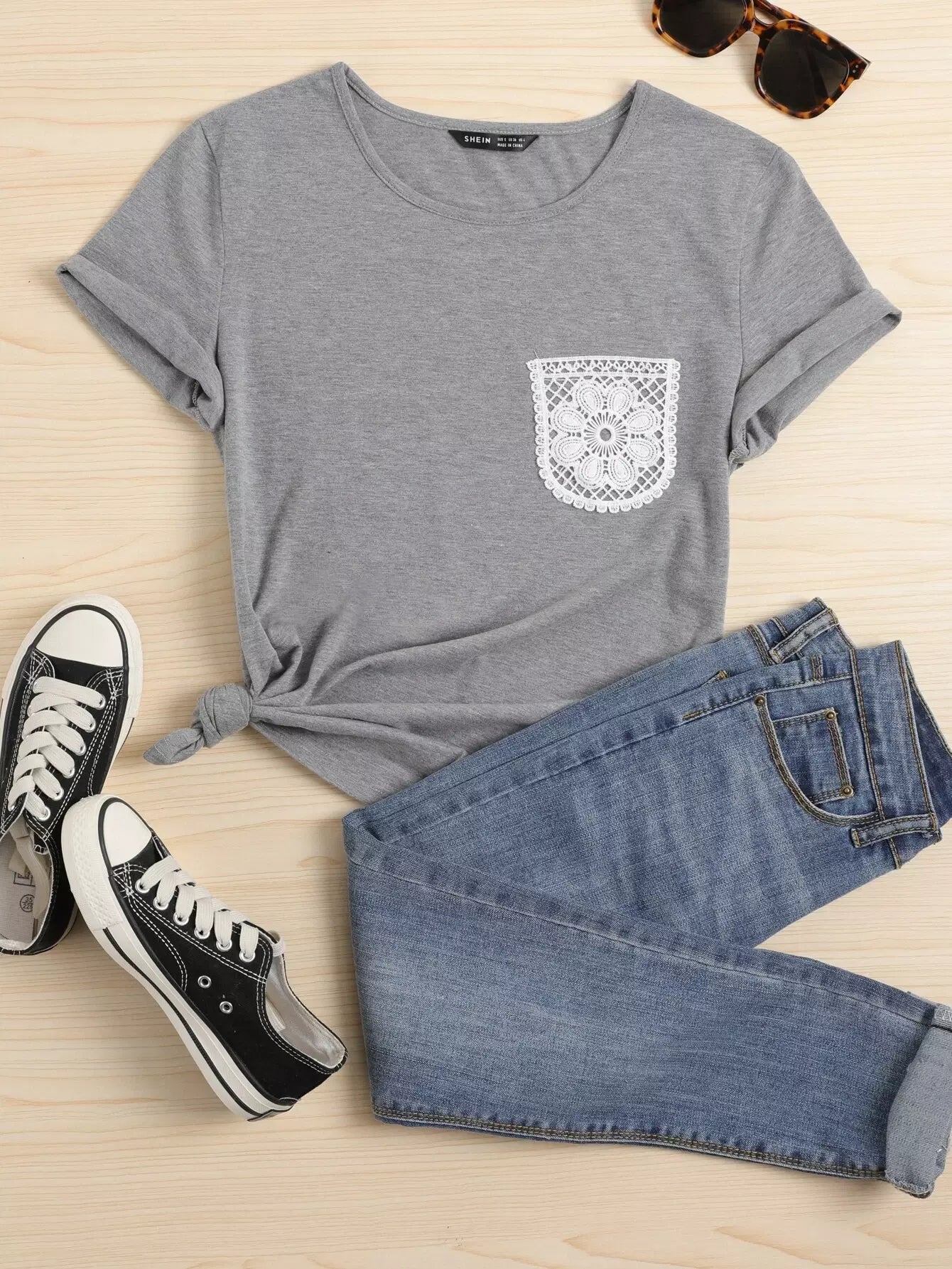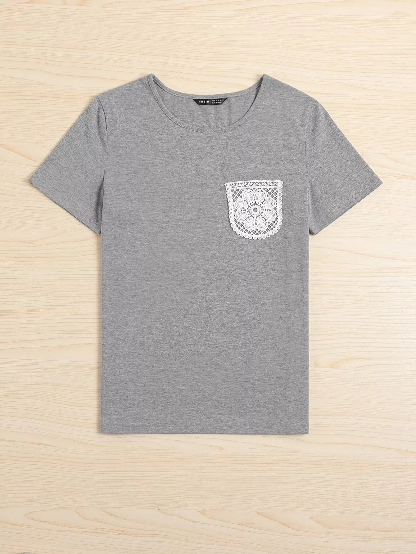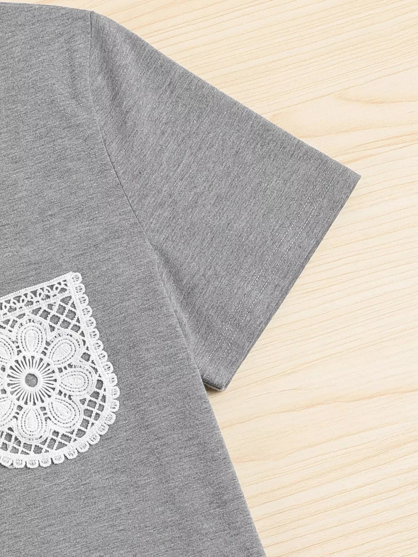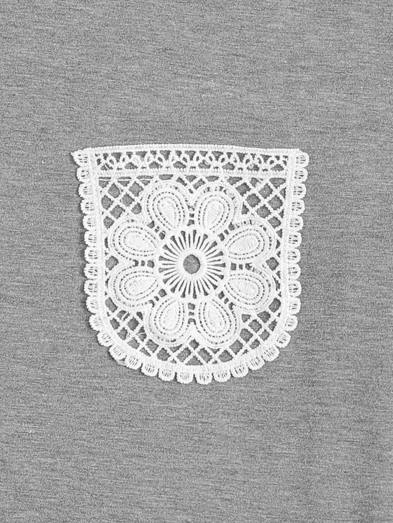 تي شيرت بأكمام قصيرة من الدانتيل المخرم بلون مغاير