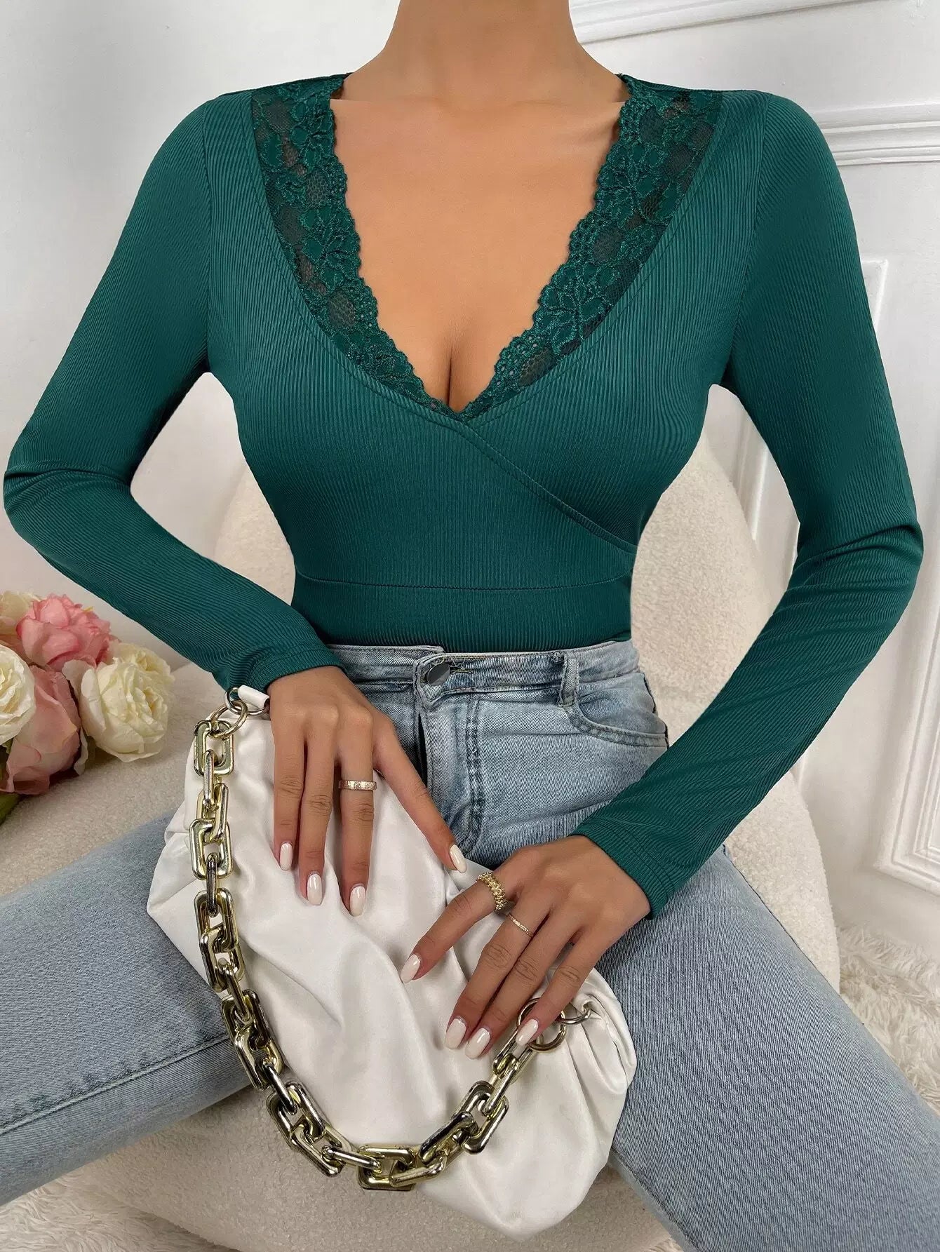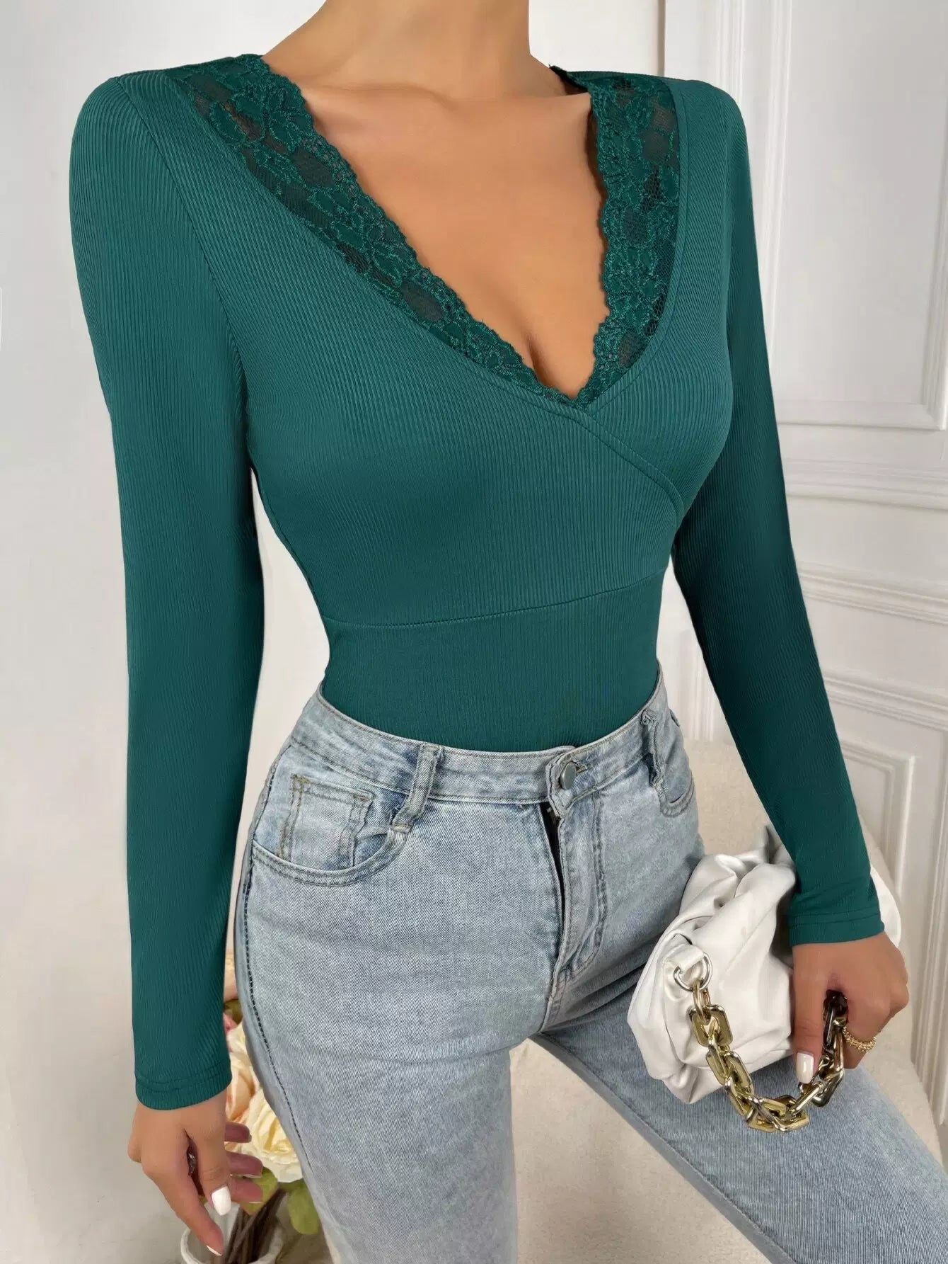 تيشيرت ضيق من الدانتيل المخرم بلون مغاير