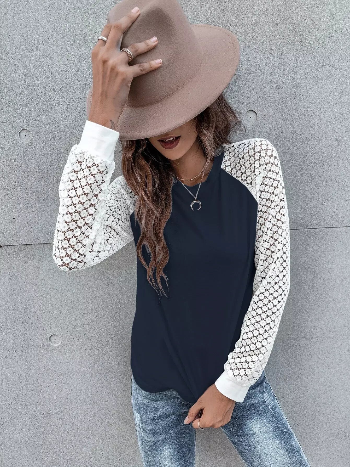 تي شيرت بأكمام من الدانتيل بلون مغاير بأربطة متباينة