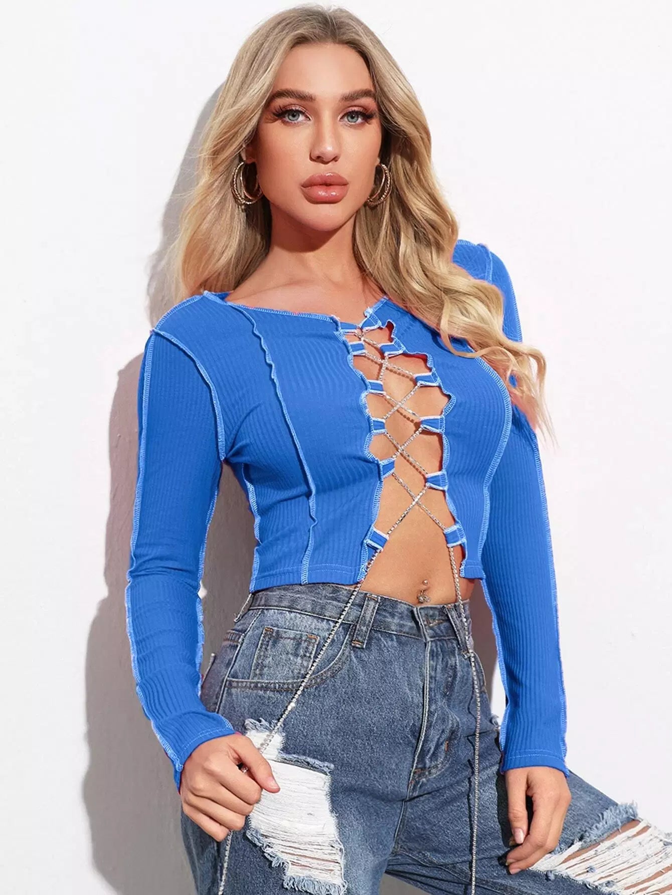 بلوزة قصيرة من الأمام بأربطة أمامية من الأمام بدرزات متباينة من حجر الراين