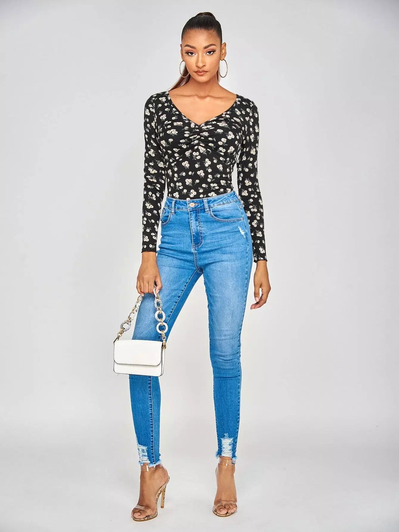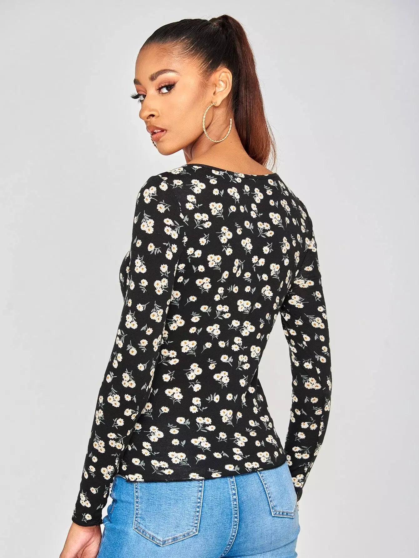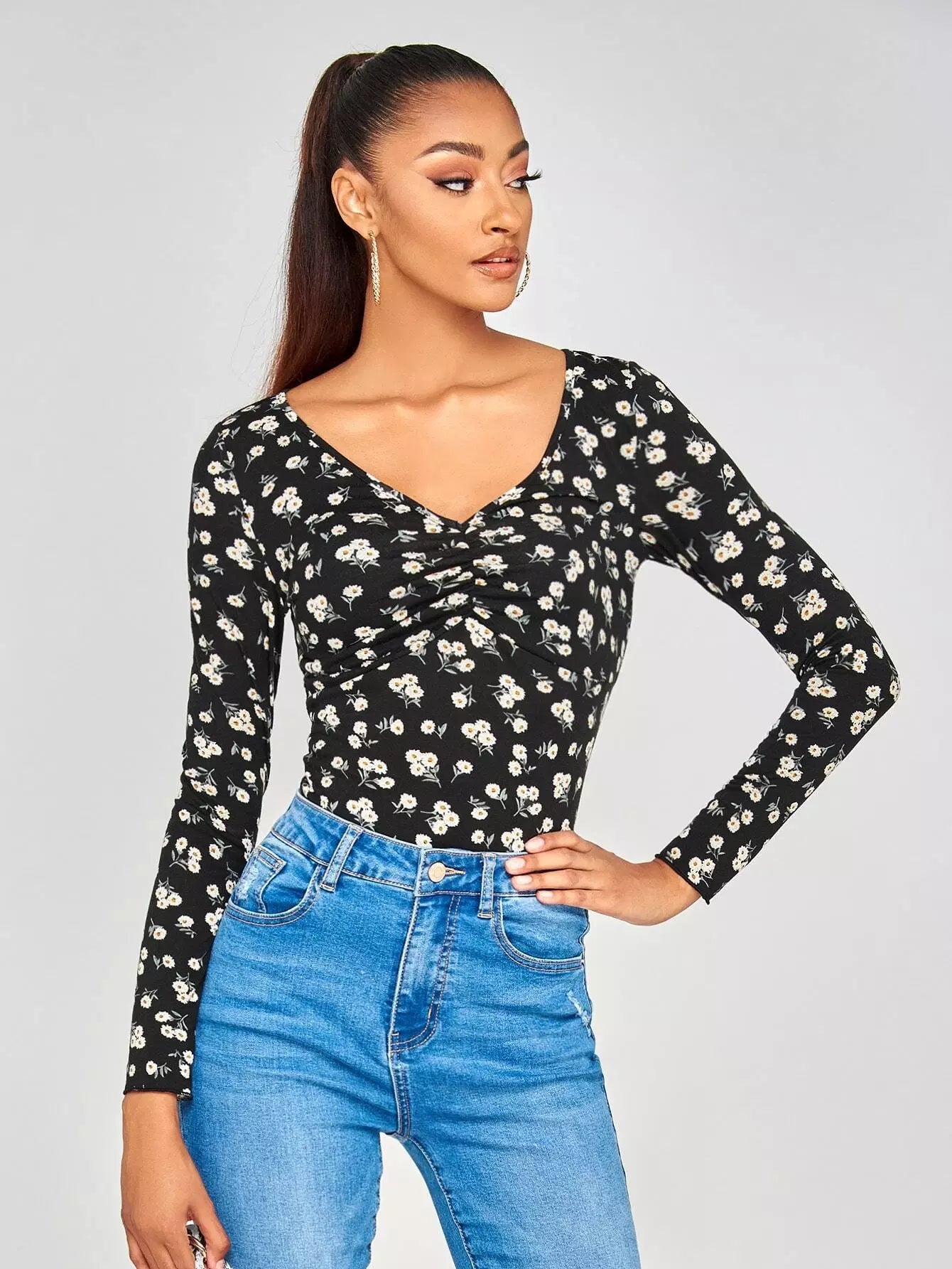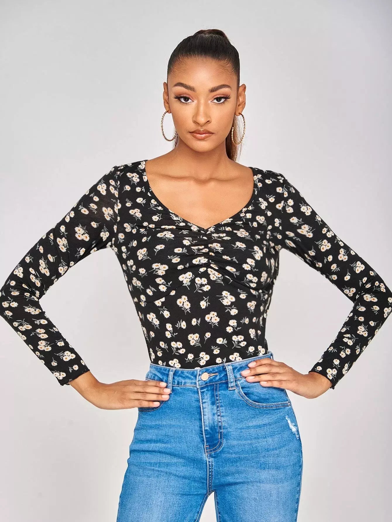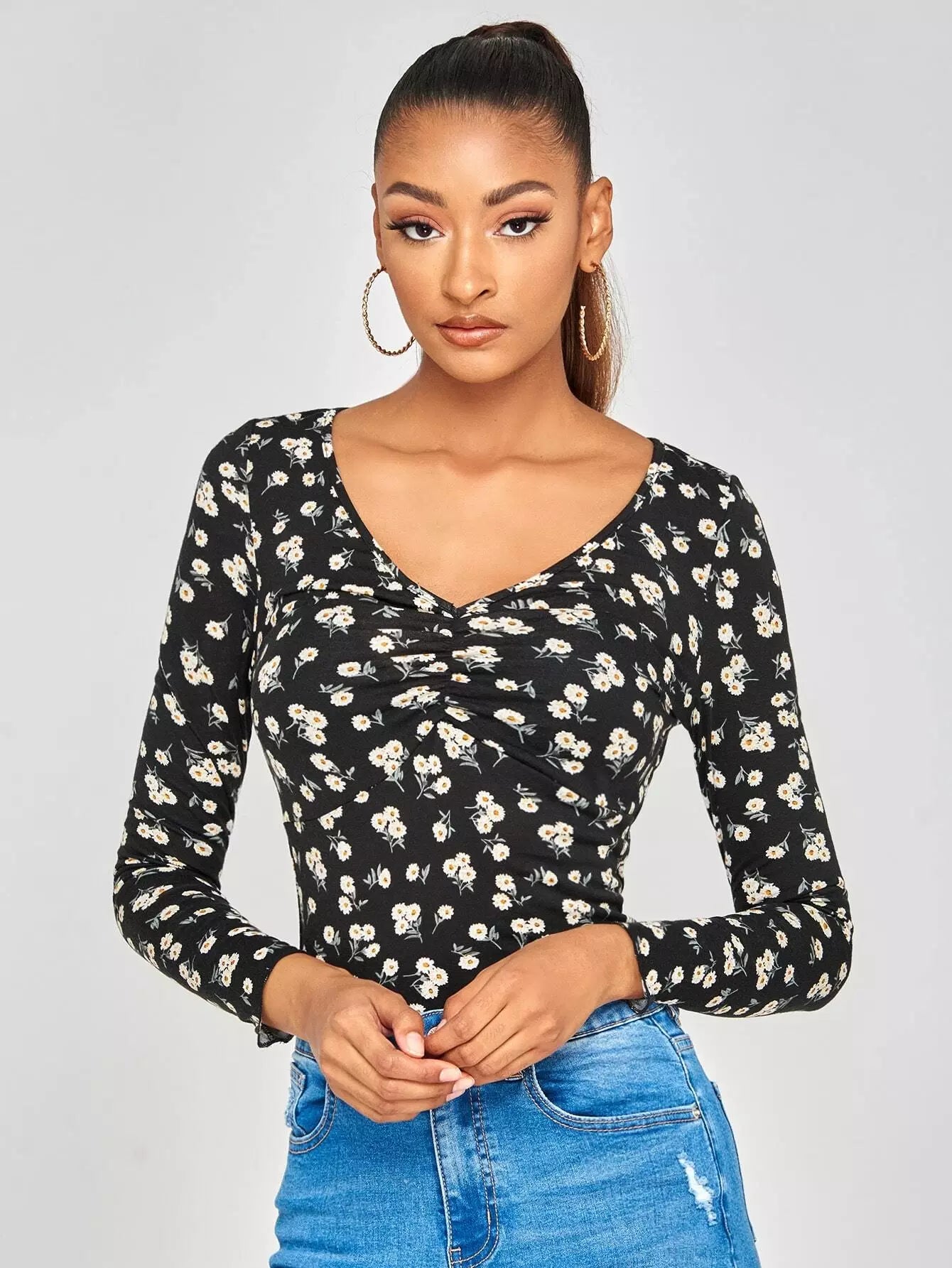 تي شيرت بطبعة زهور صغيرة مكشكشة على الصدر