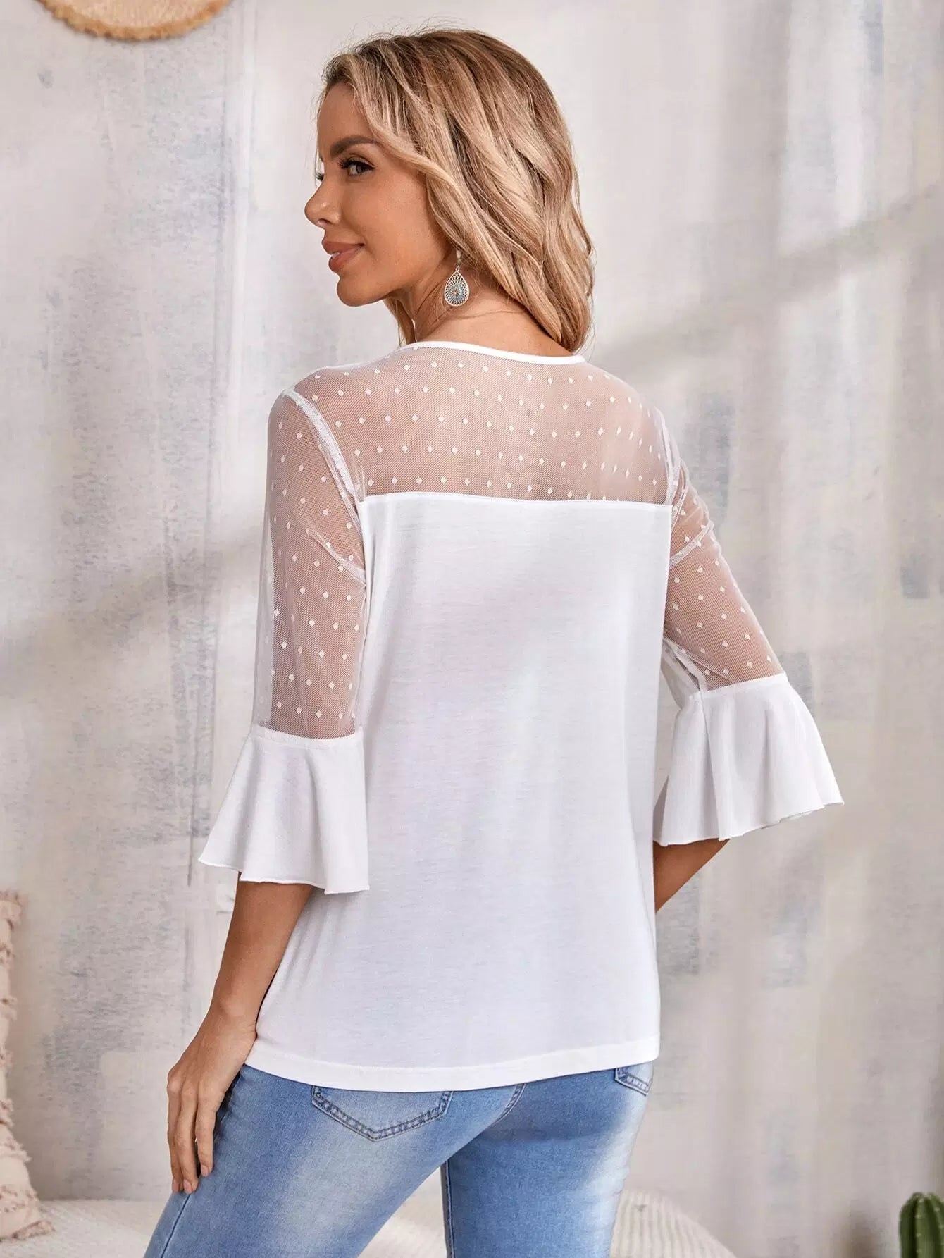 تي شيرت بأكمام من الدانتيل المخرّم المخرّم الدانتيل المنفوش