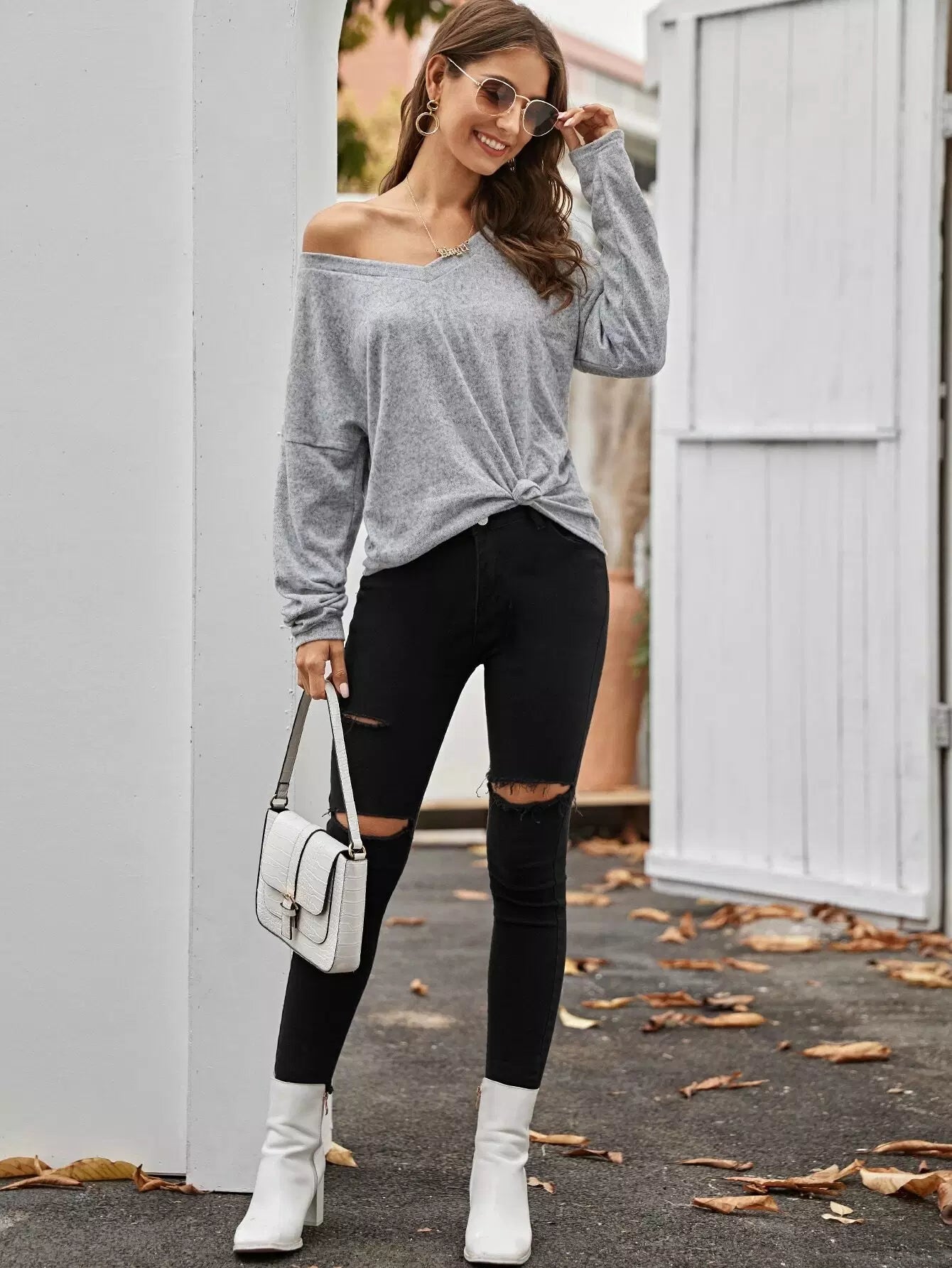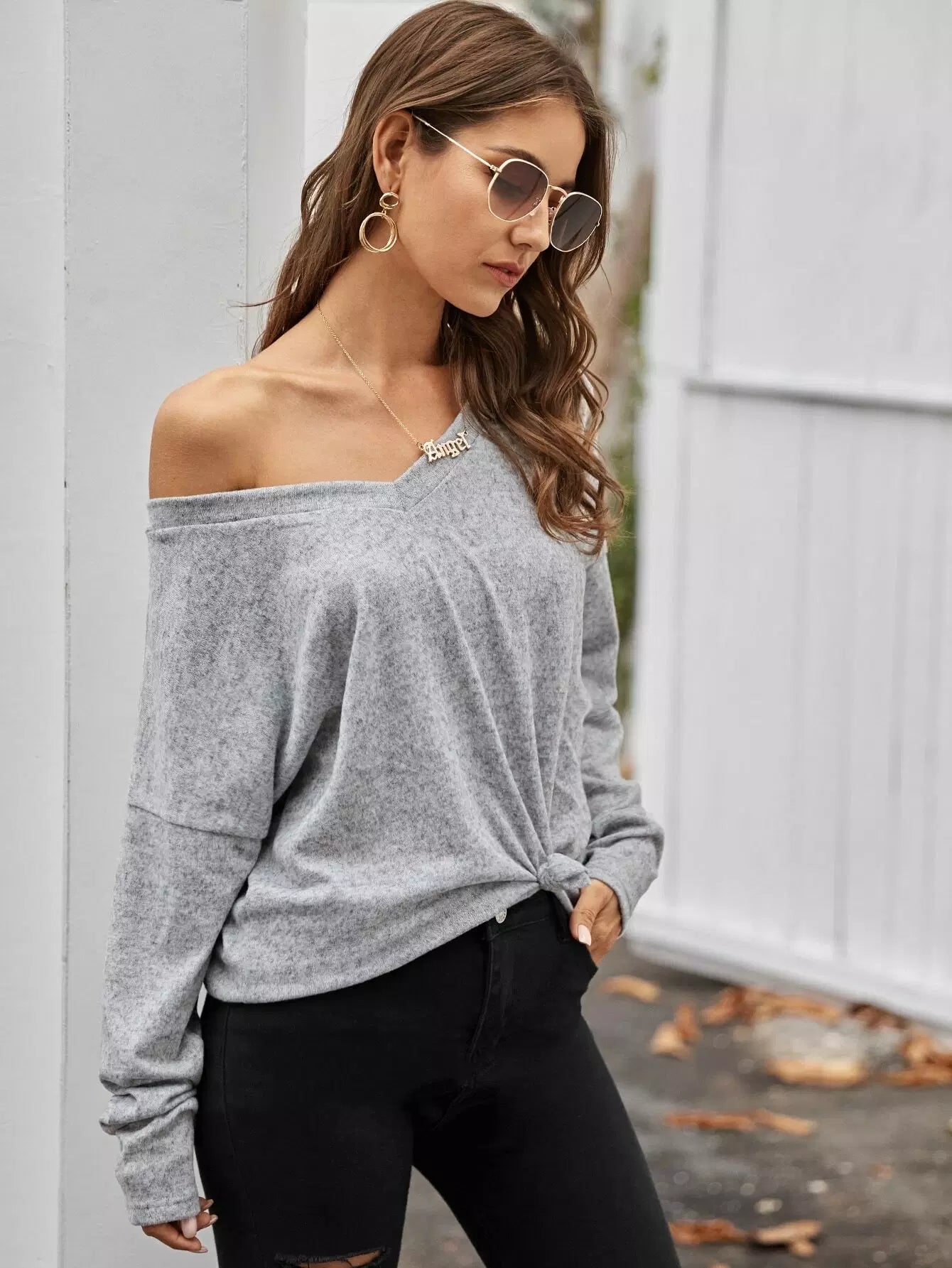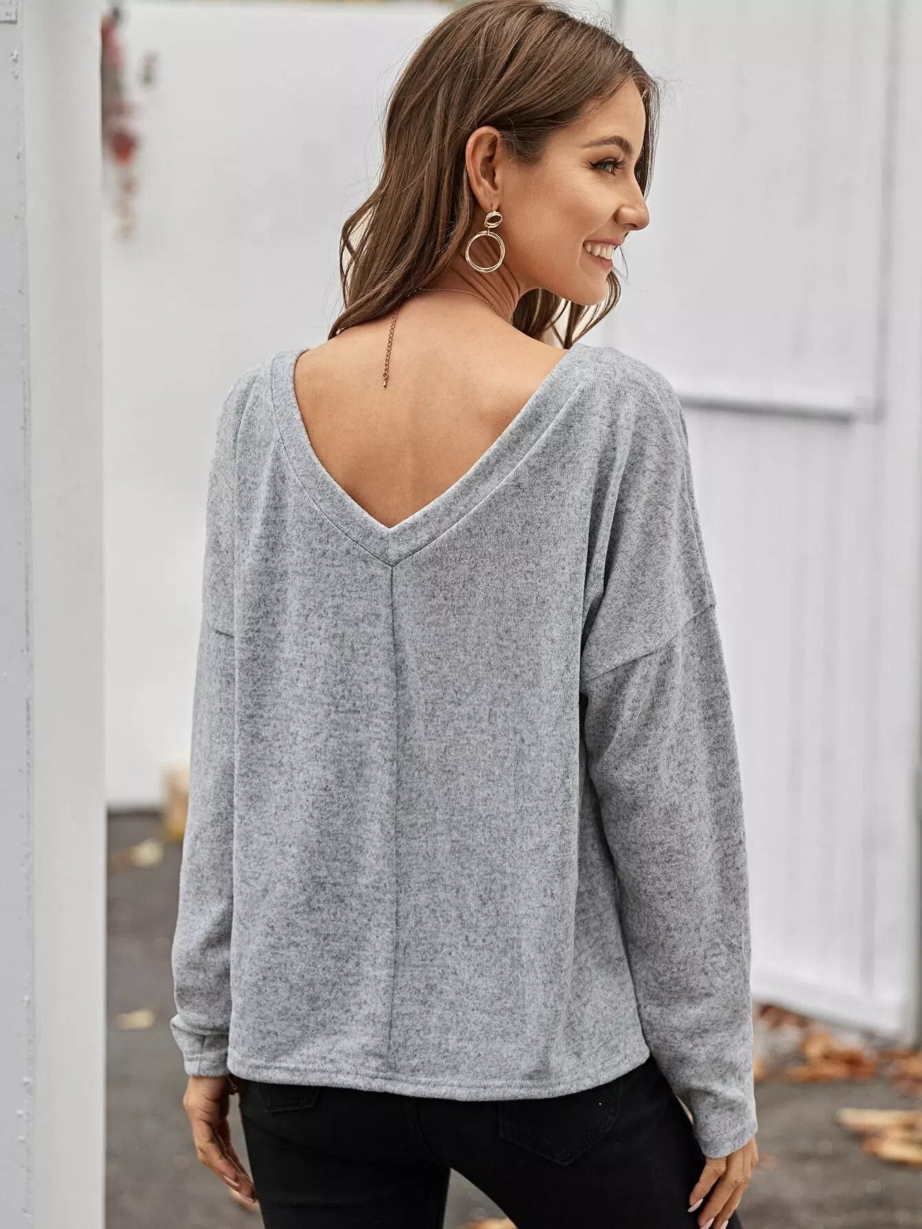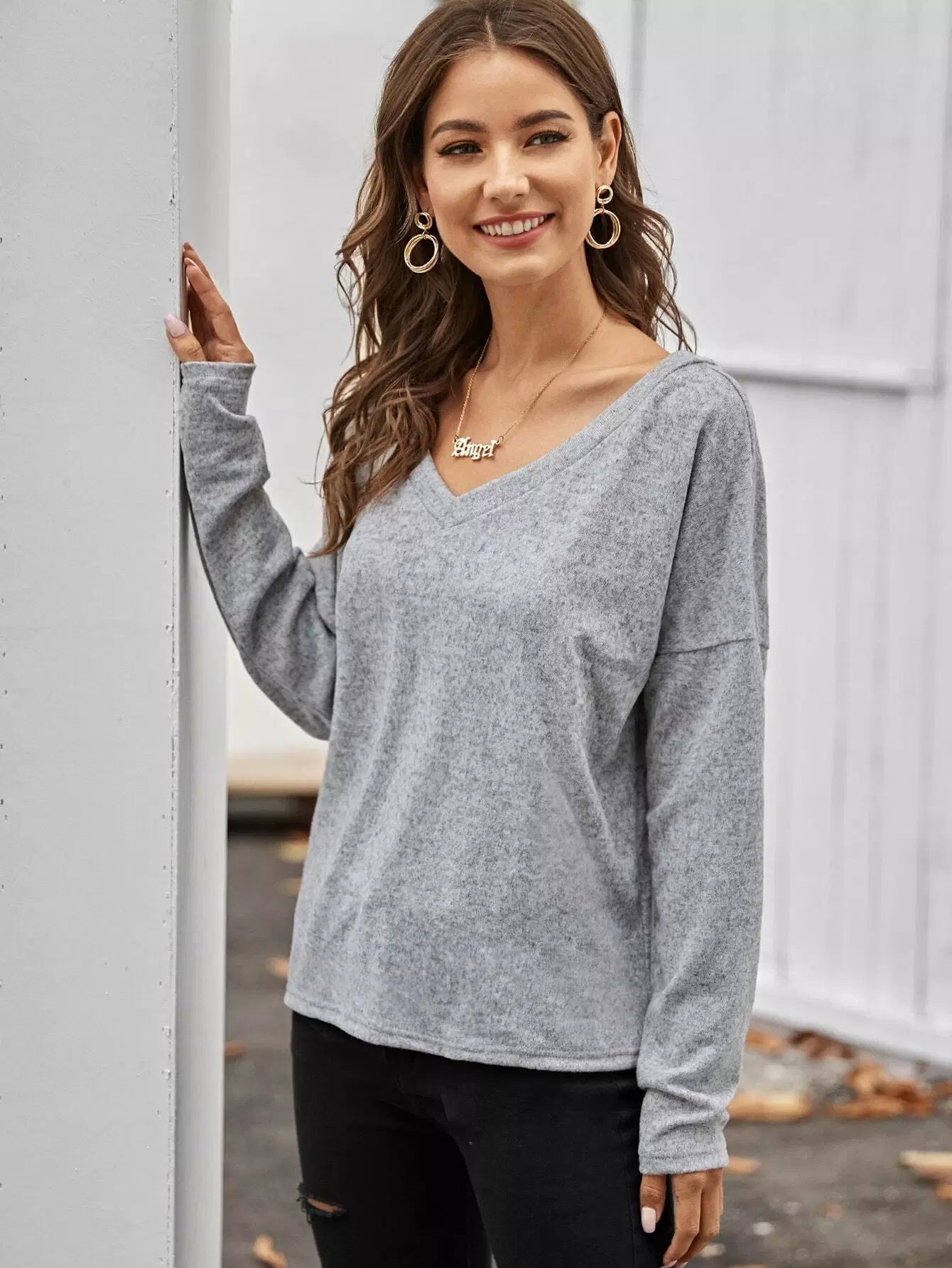 تي شيرت برقبة مزدوجة على شكل حرف V برقبة مزدوجة رمادي مطفأ