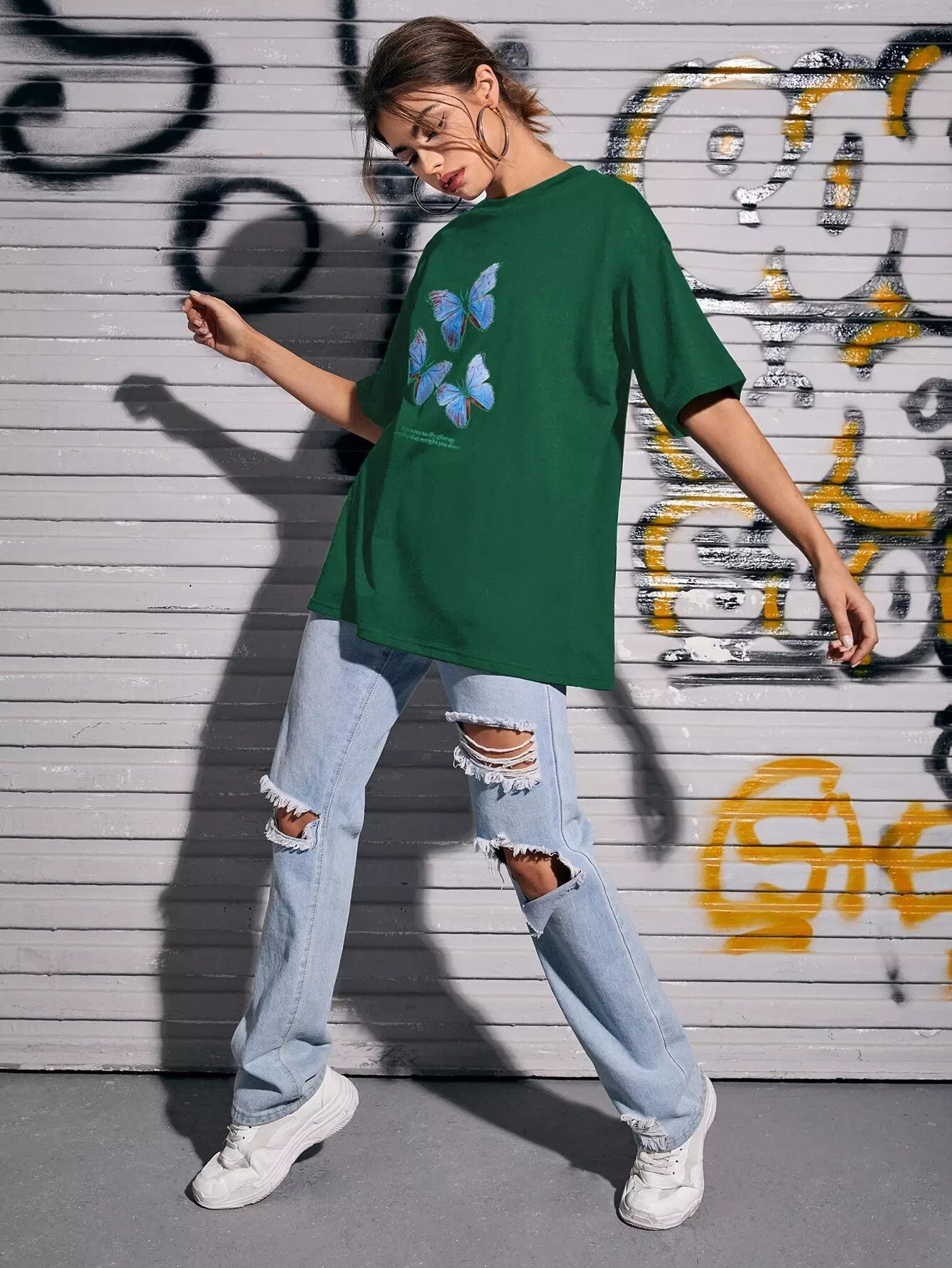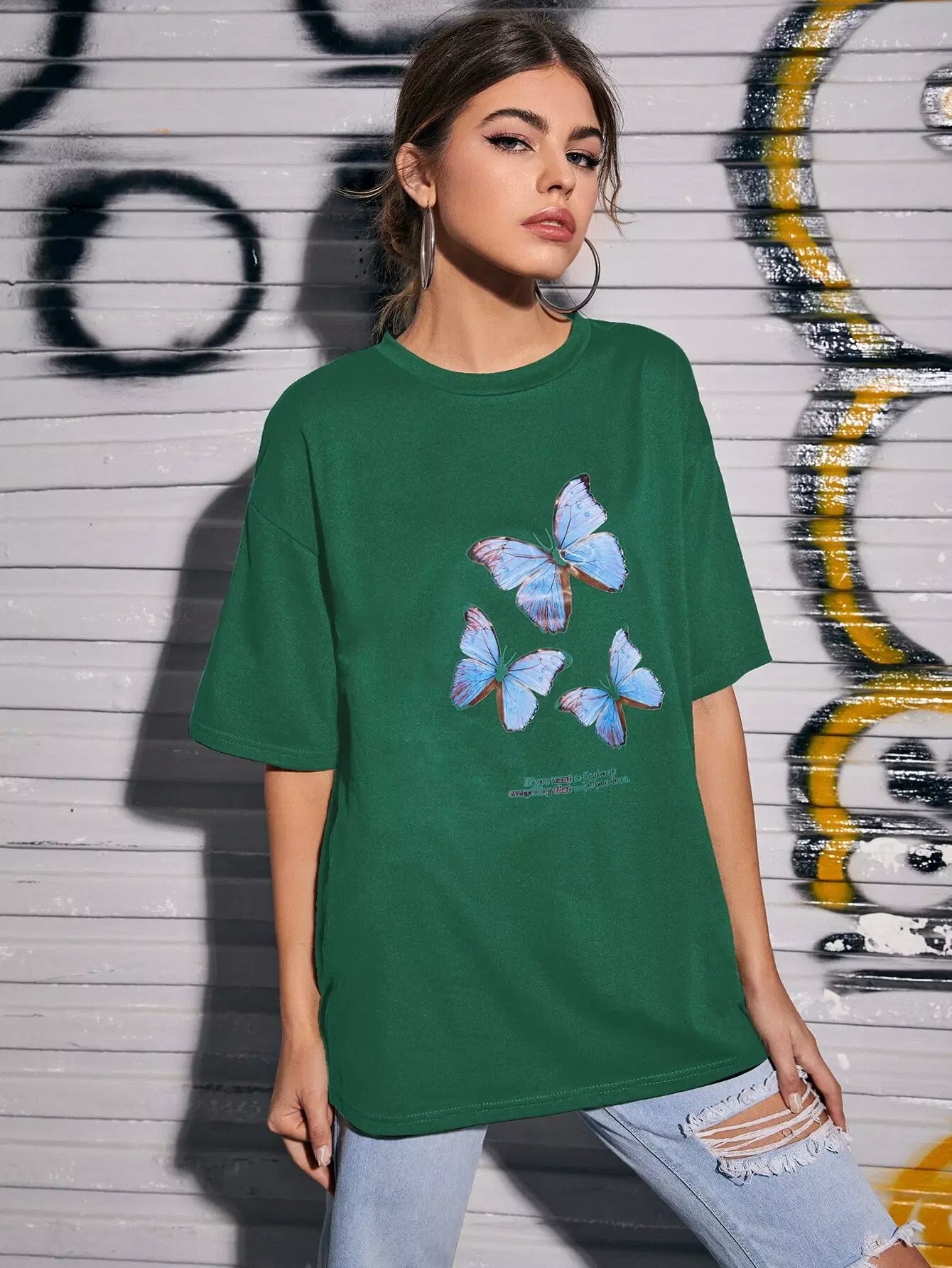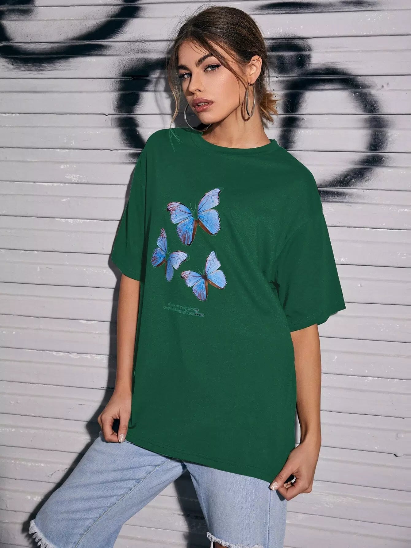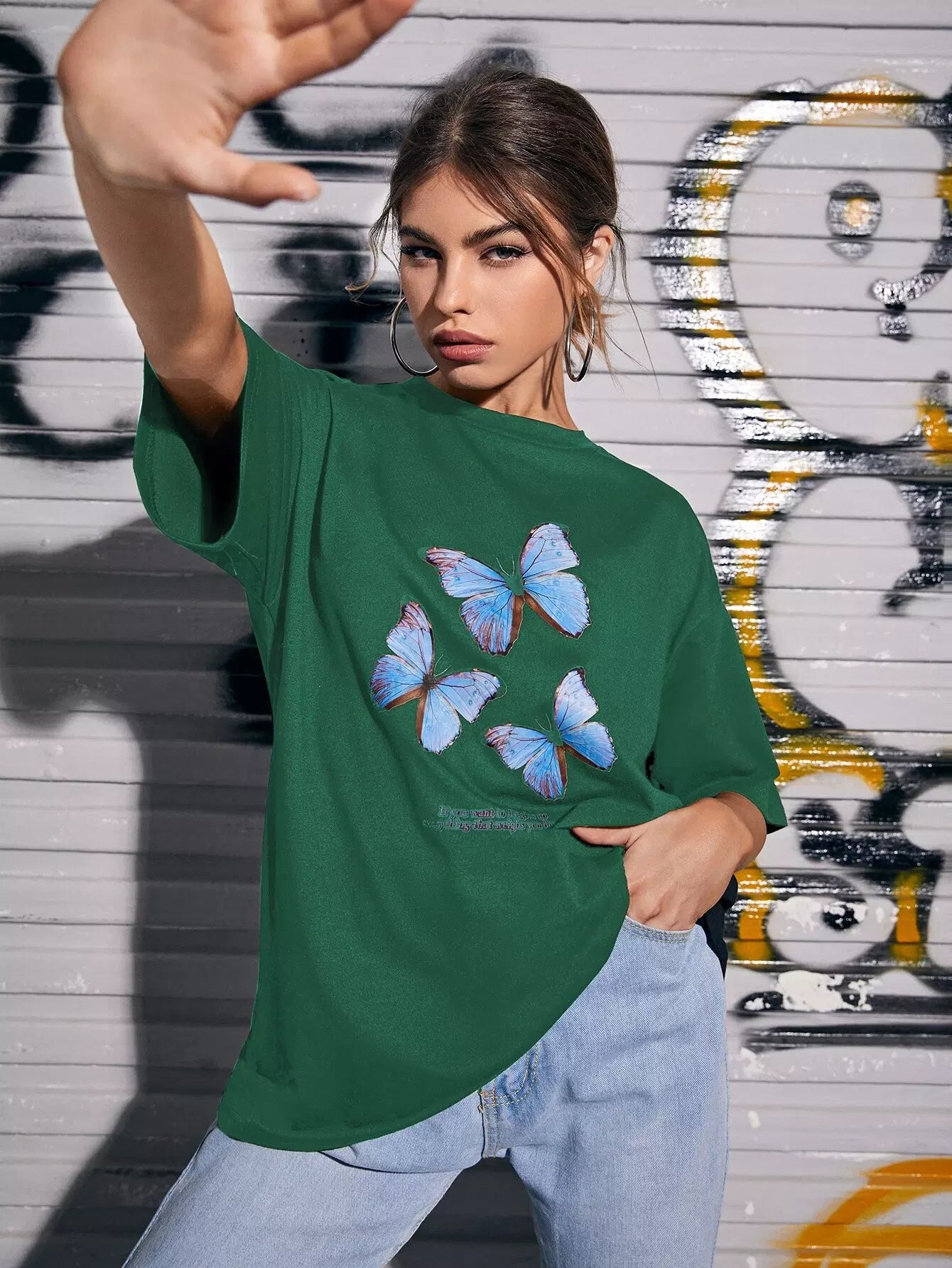 تي شيرت ذو أكتاف منسدلة بحروف ورسومات فراشة