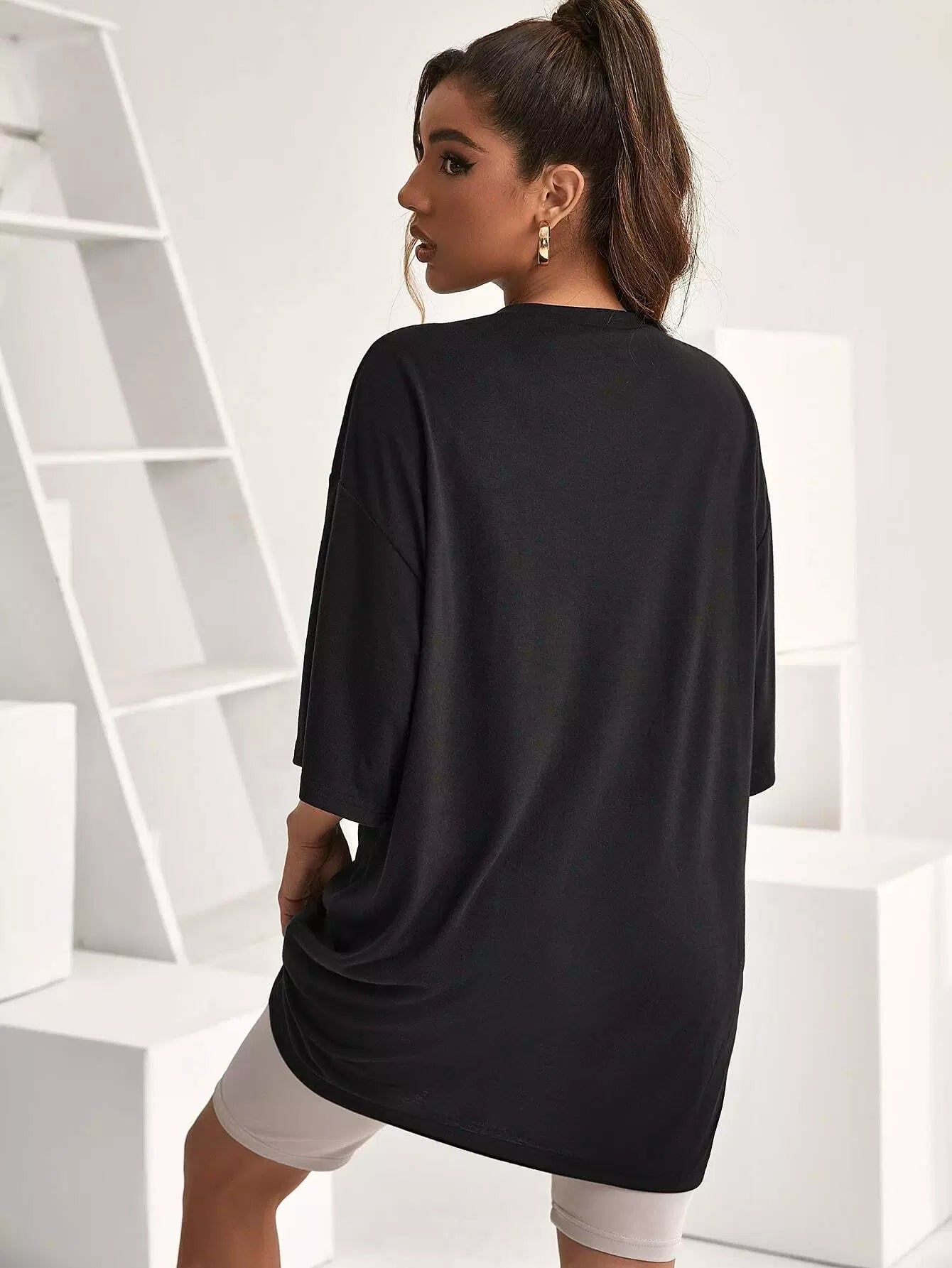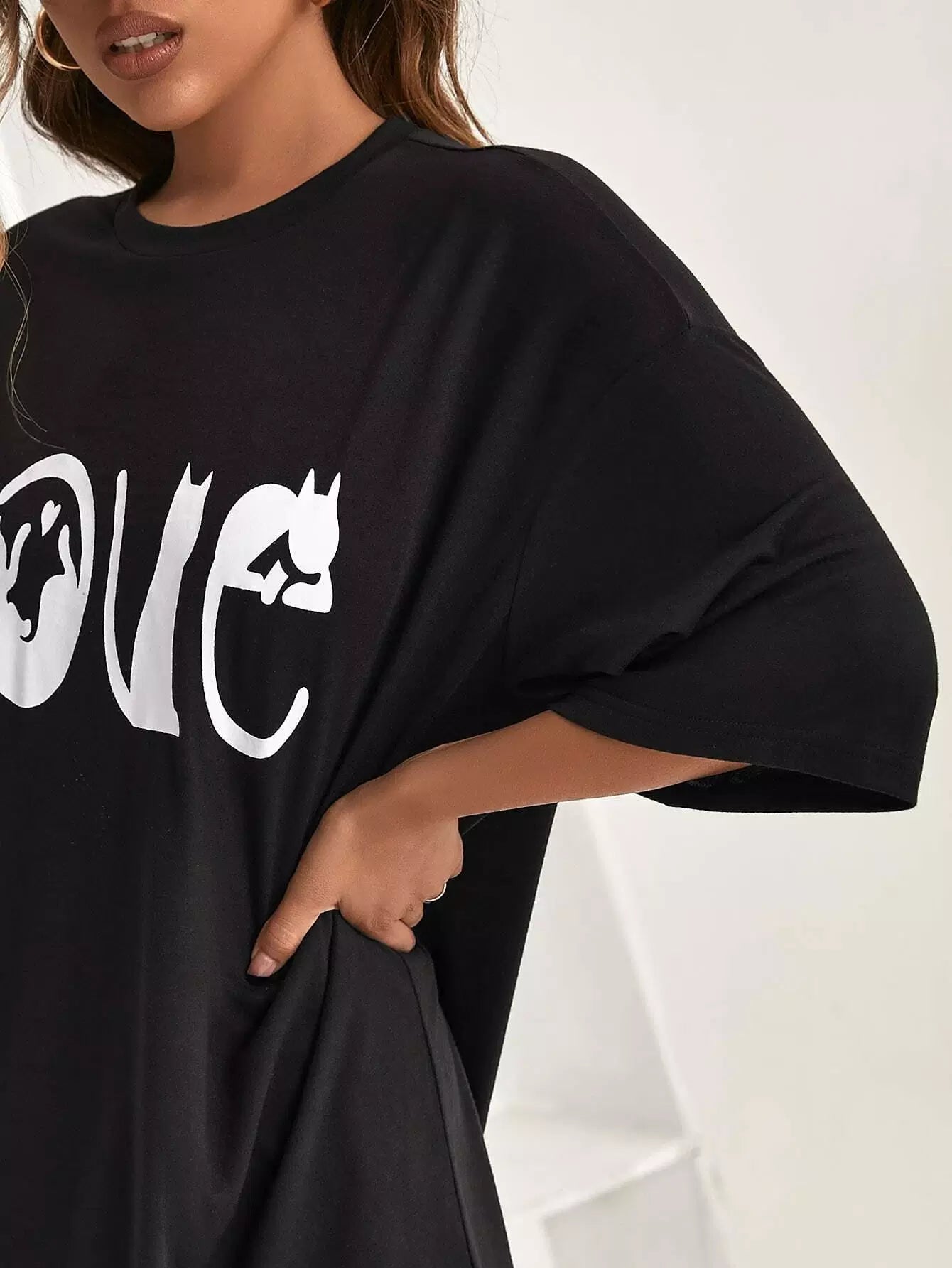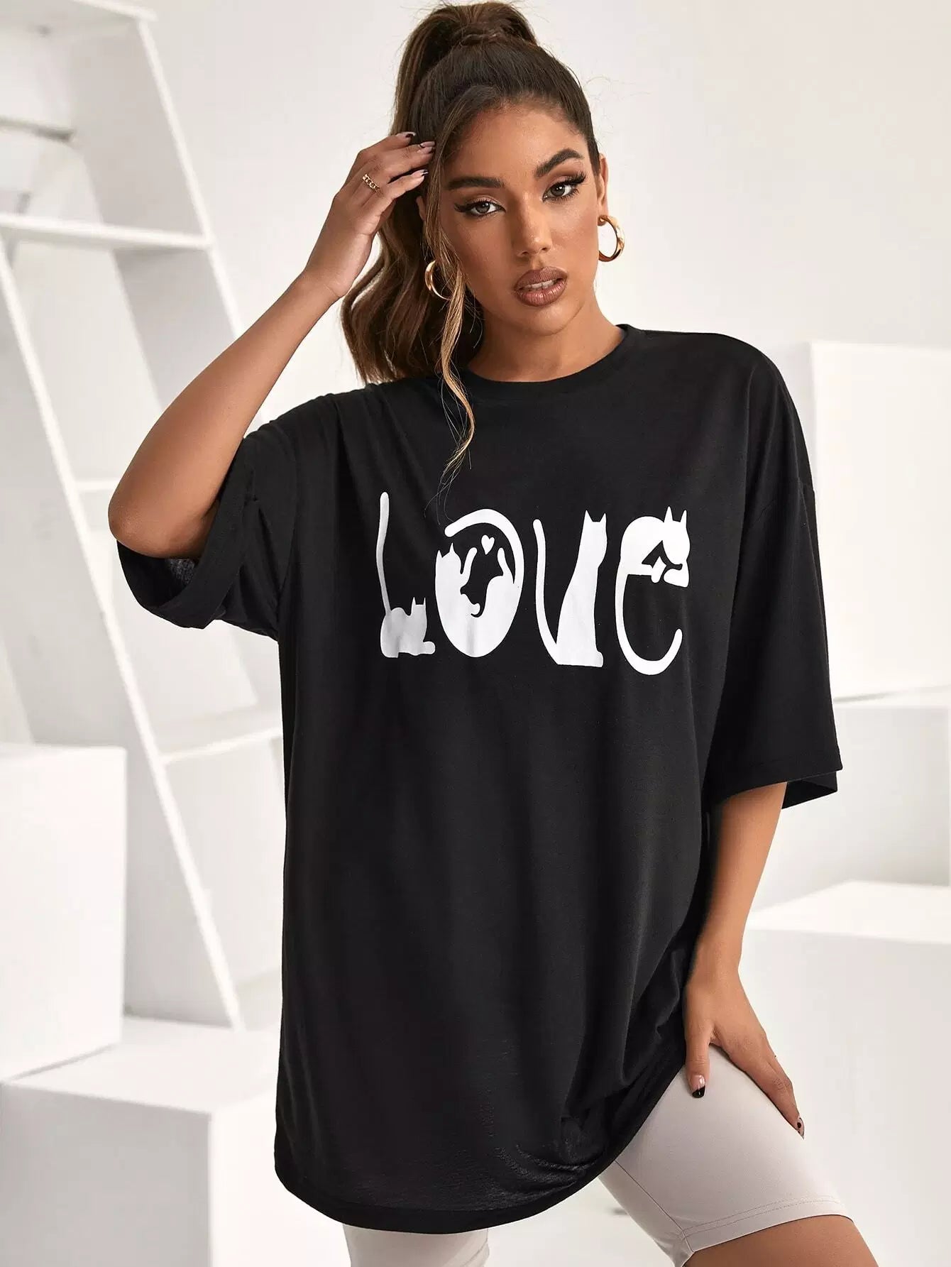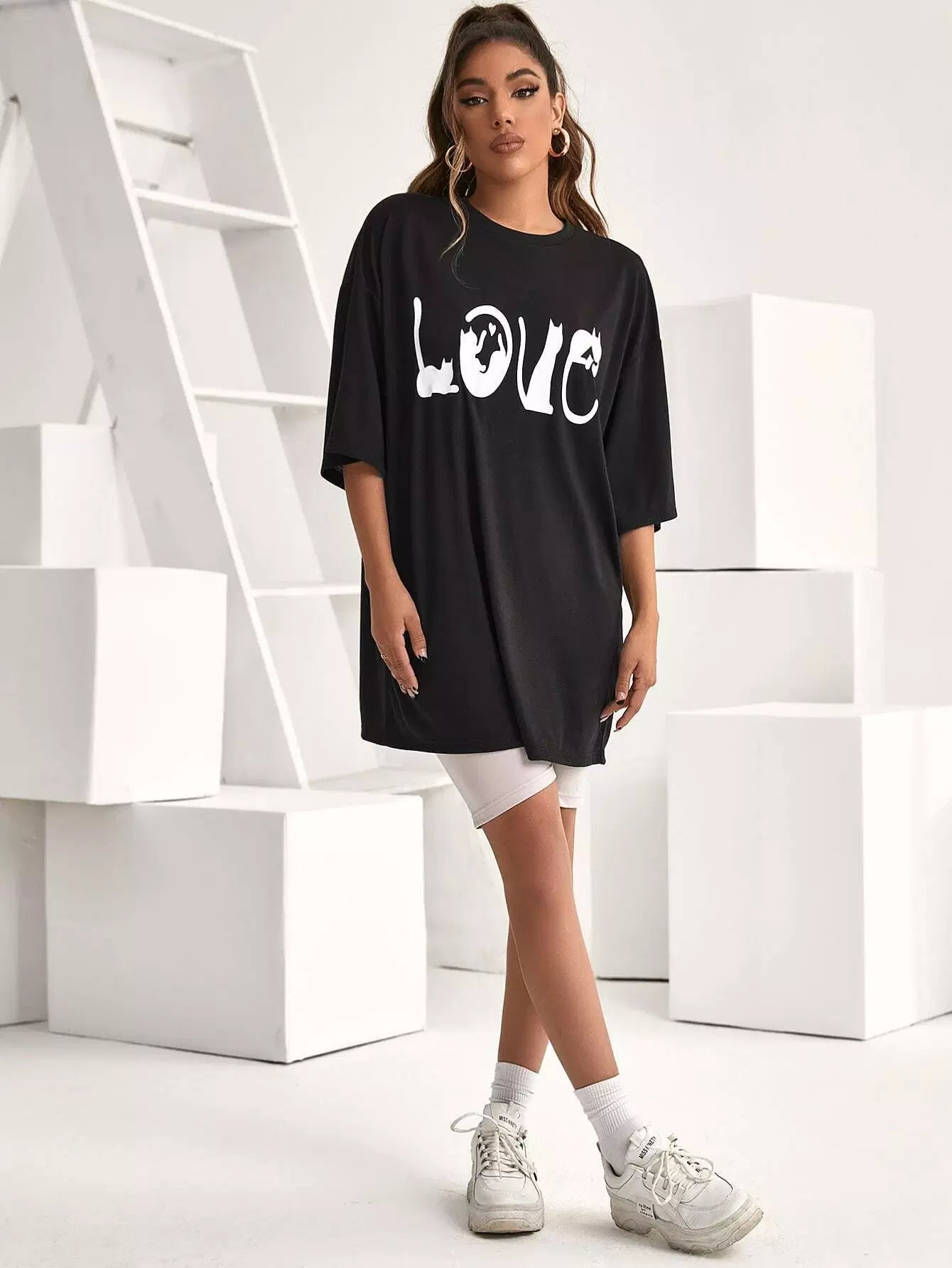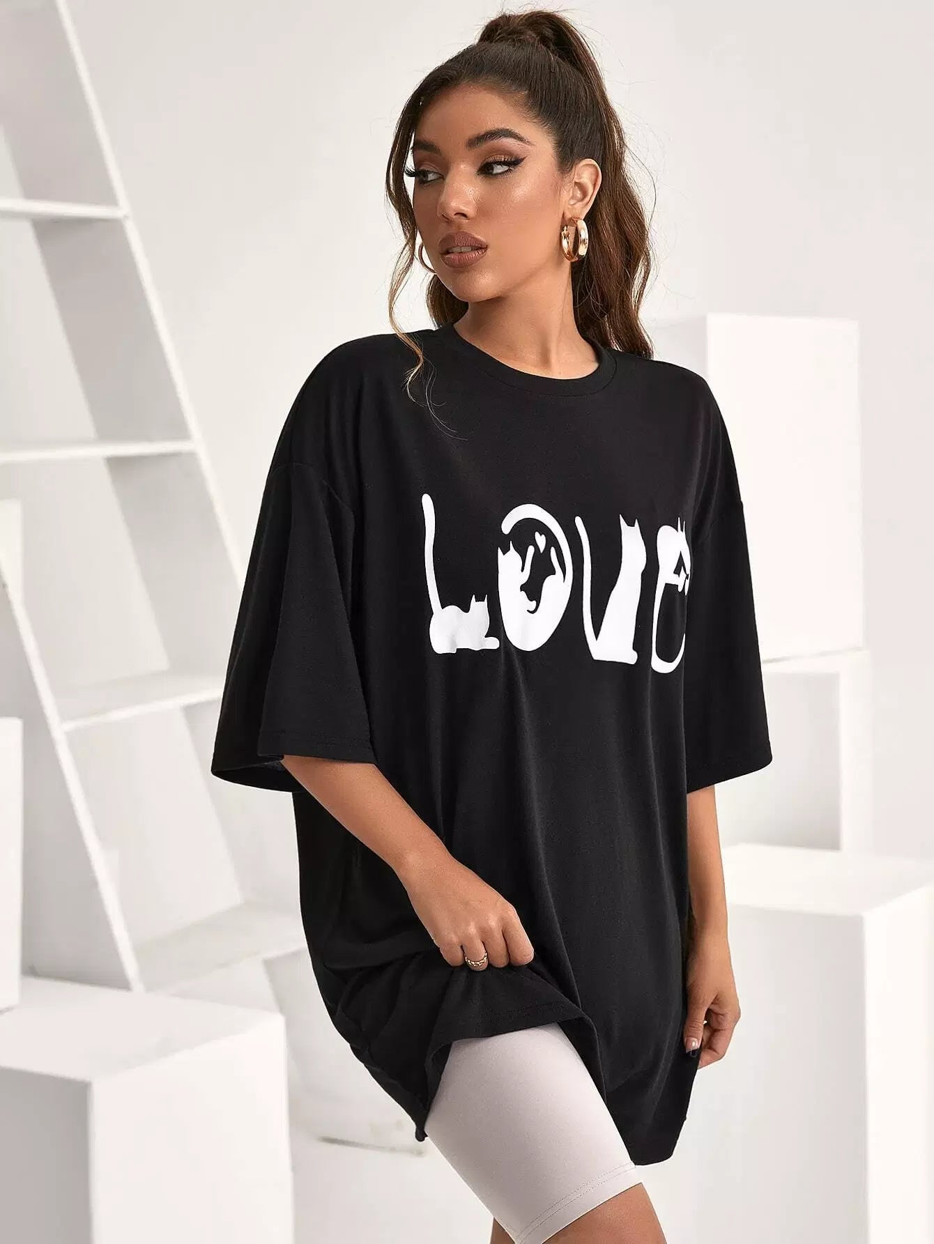 تي شيرت ذو أكتاف منسدلة بحروف ورسومات كارتونية طويلة