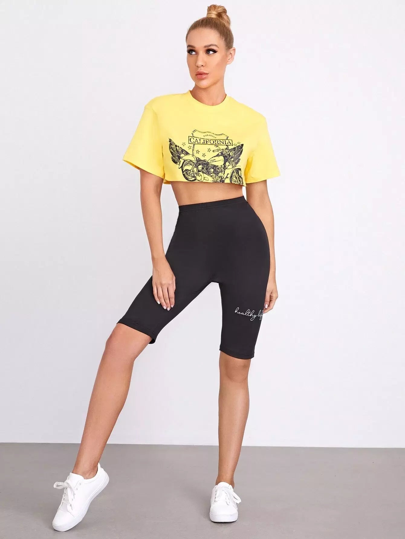تي شيرت قصير منسدل الكتفين برسومات على الأكتاف منسدلة