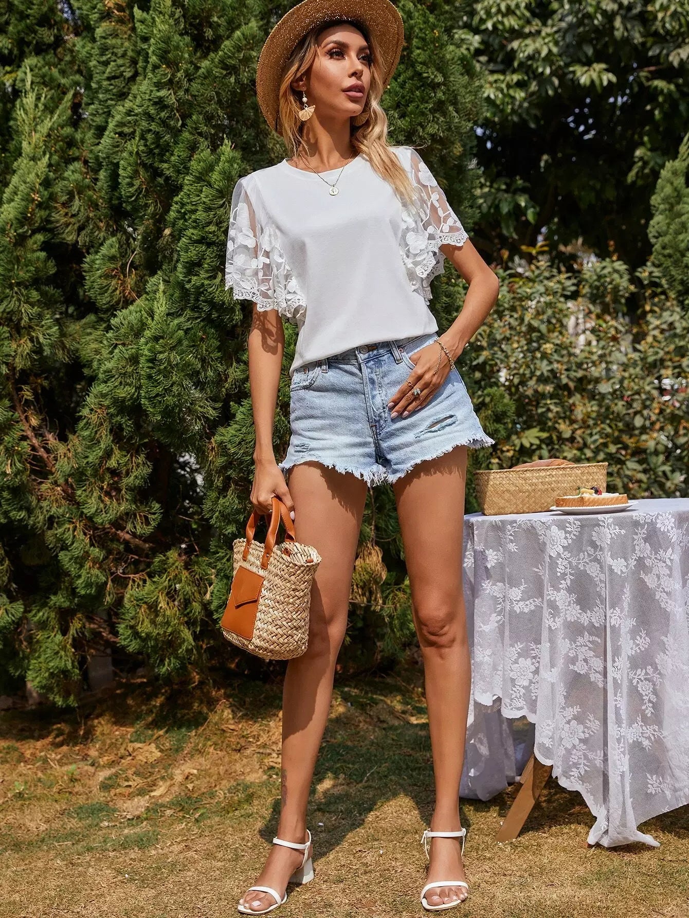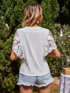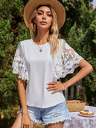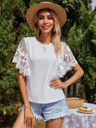 تي شيرت بأكمام تطريز شبكي بأكمام فراشة
