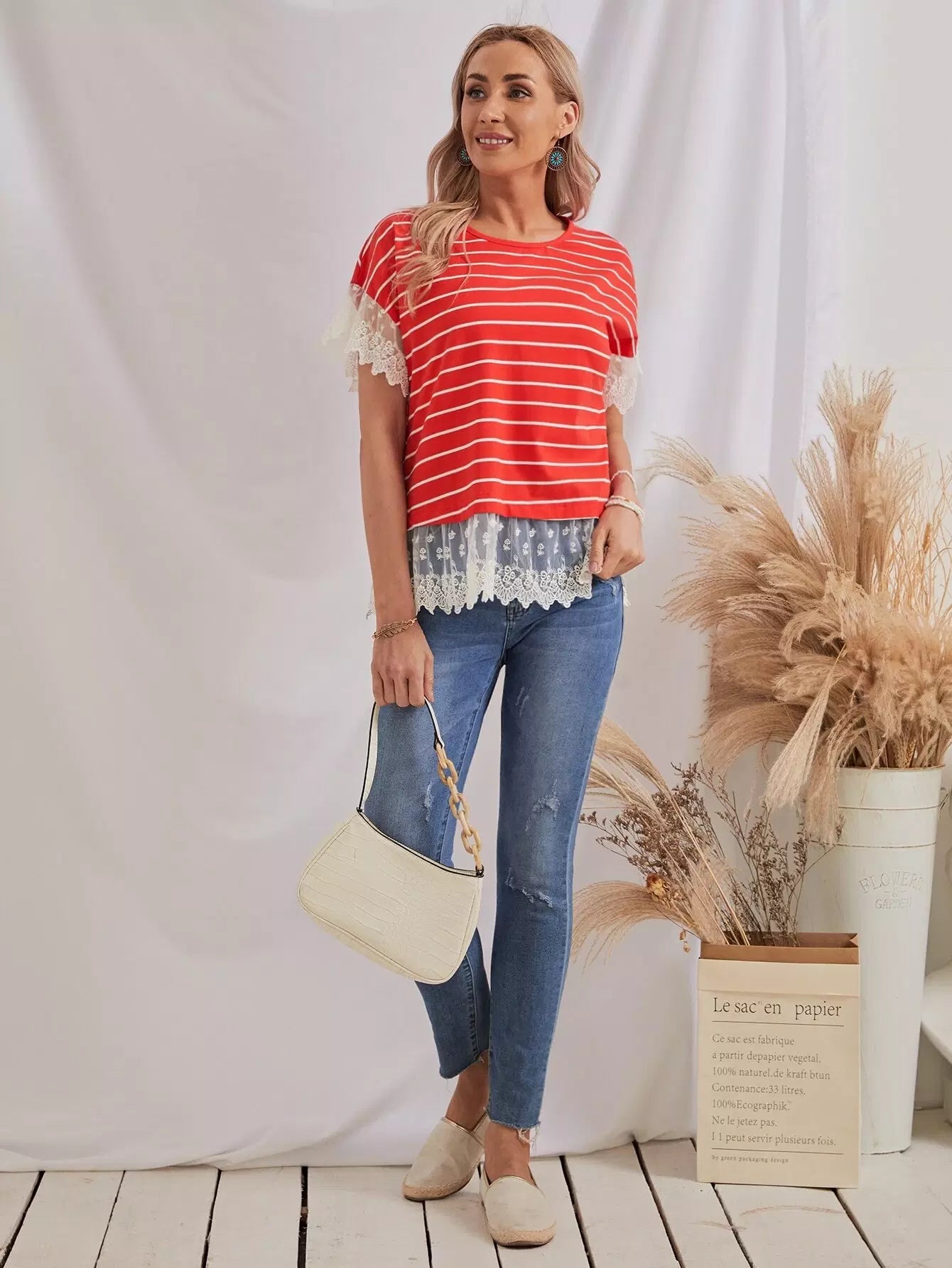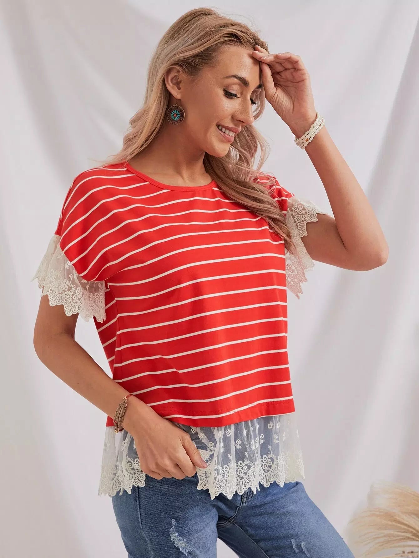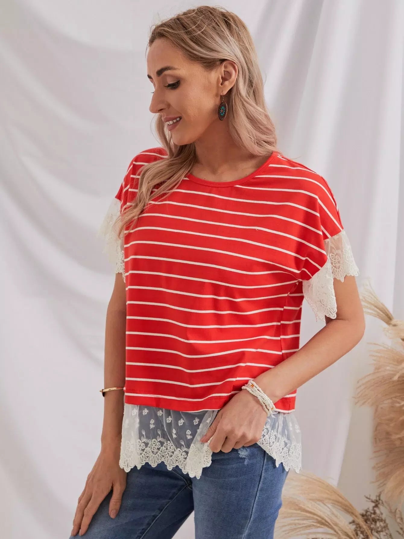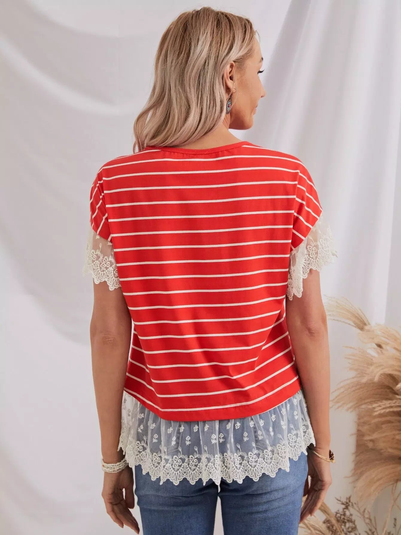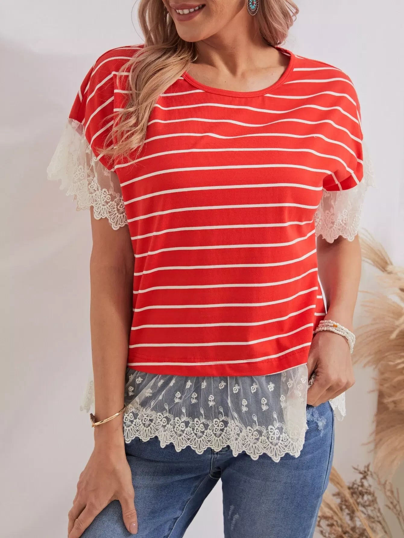 بلوزة مخططة بتطريز شبكي بحواف مخططة