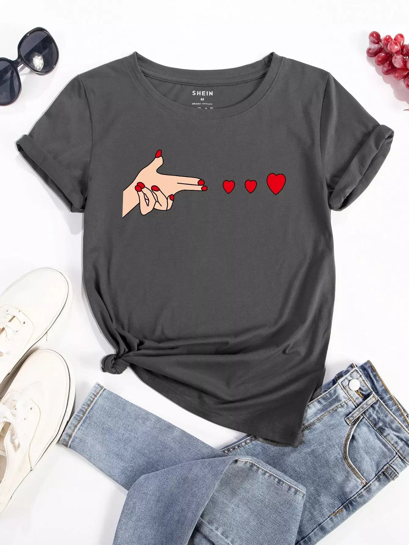 تي شيرت برقبة دائرية مطبوع عليه شكل وقلب