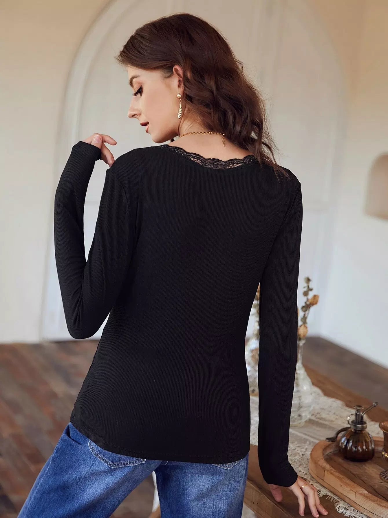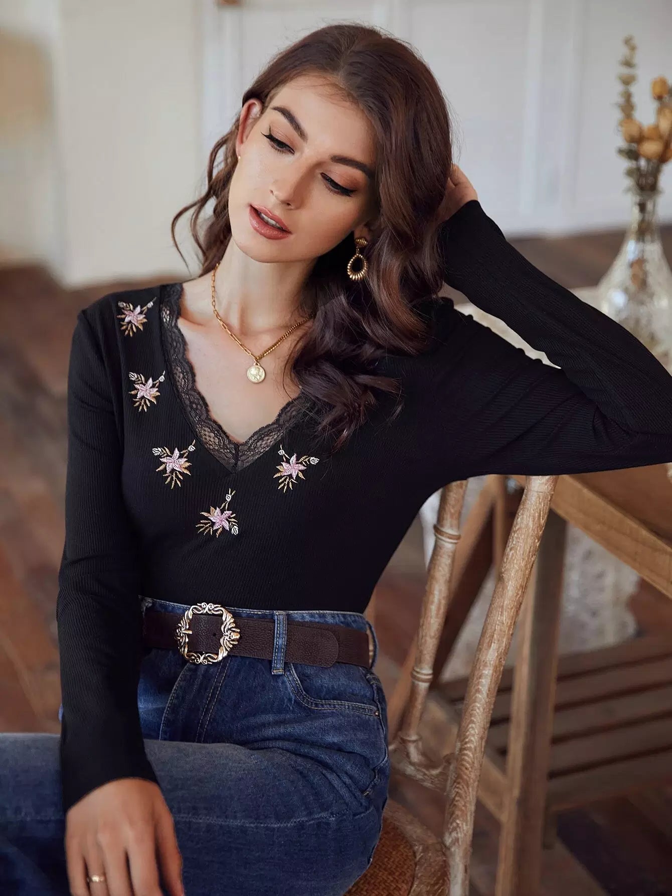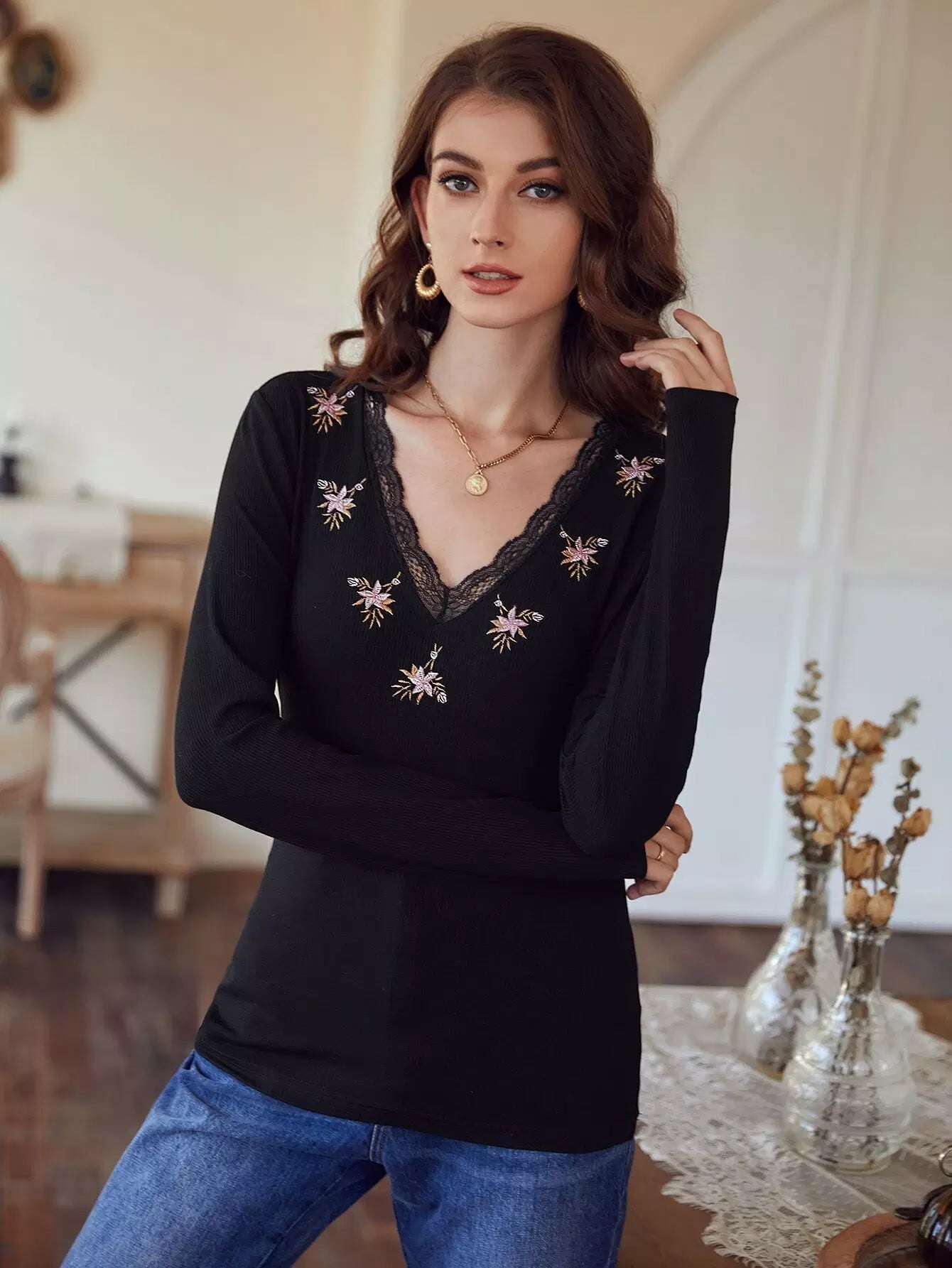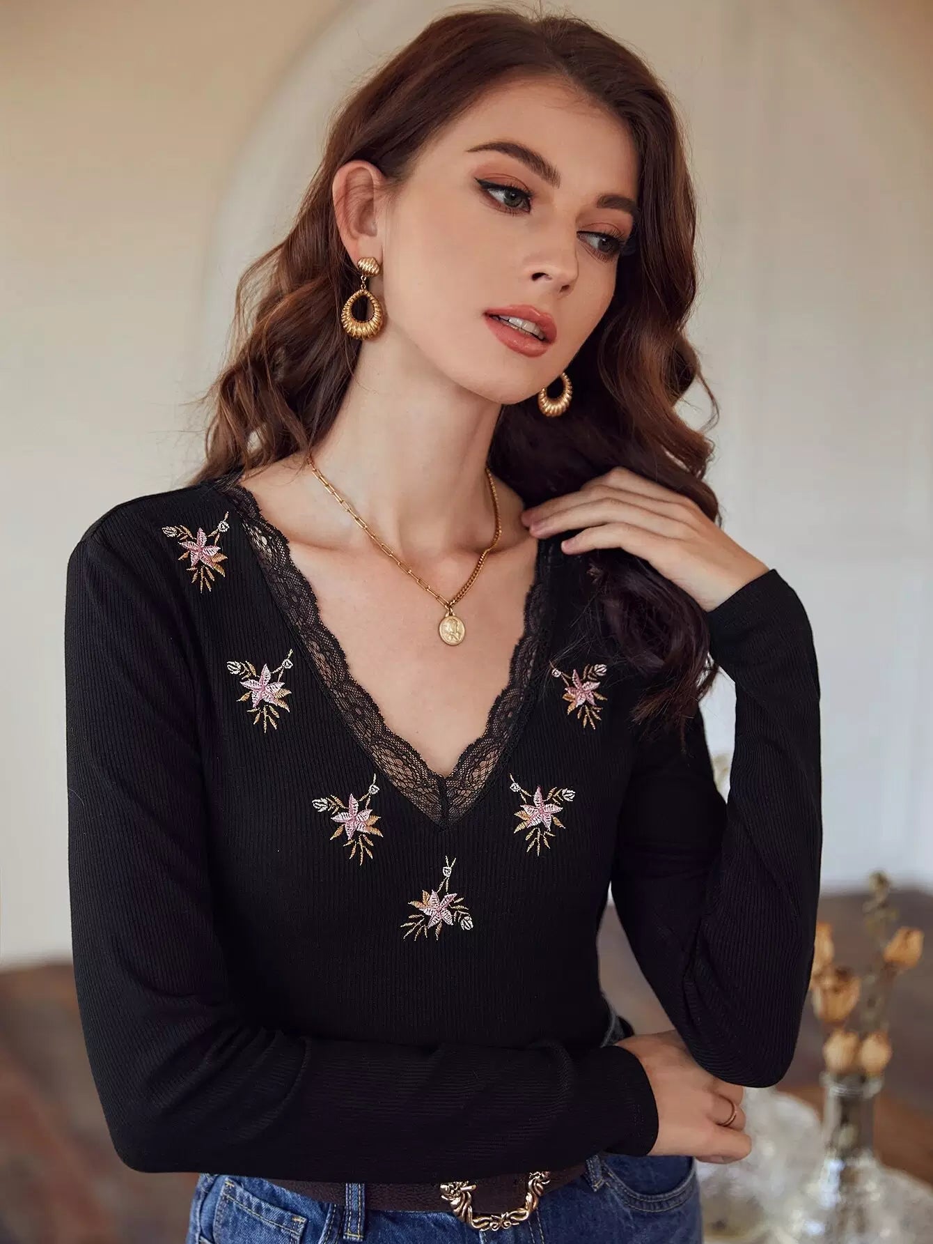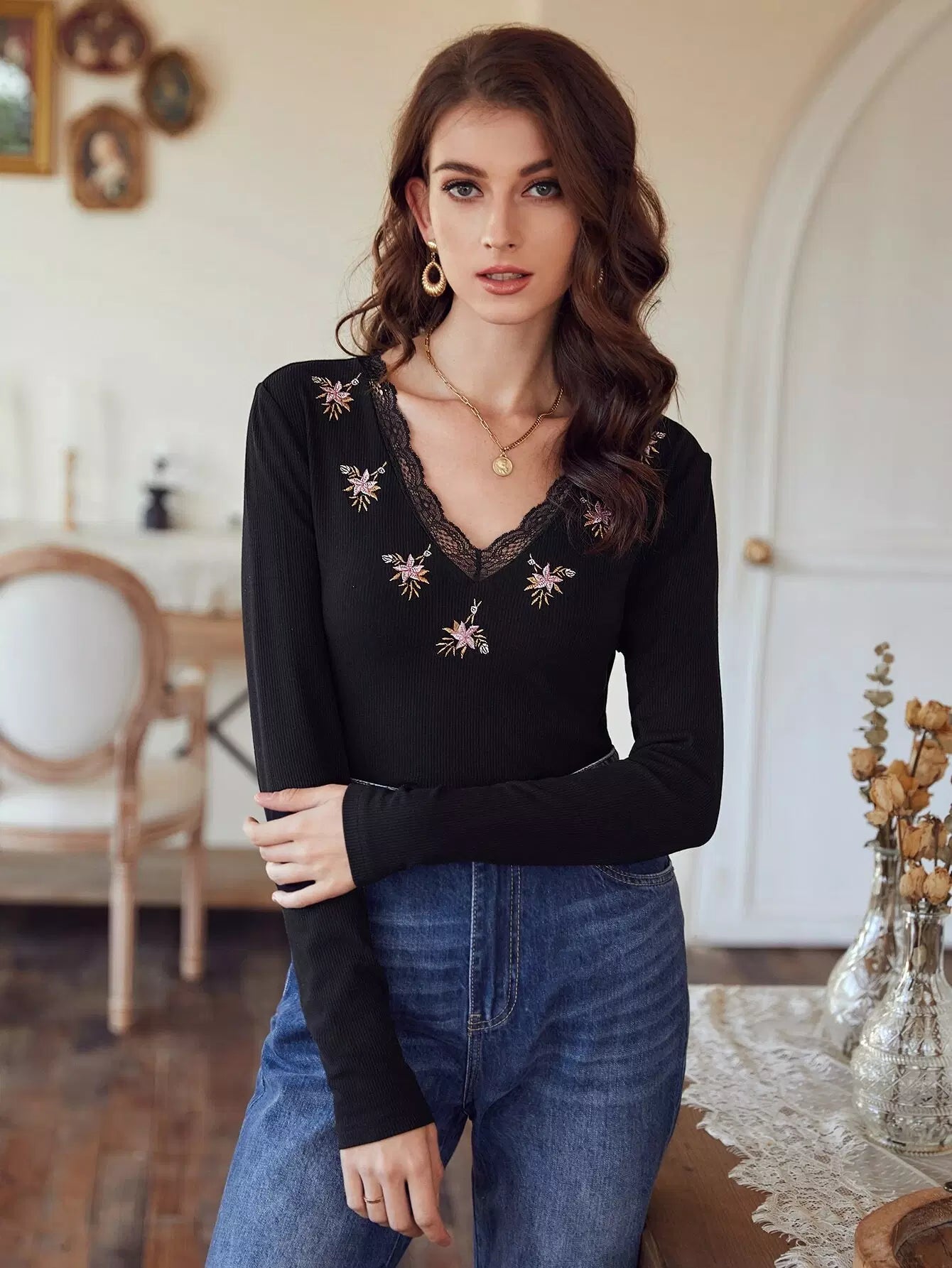 تي شيرت بحواف من الدانتيل المطرز بالزهور والدانتيل المحبوك على شكل ضلع
