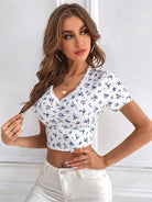 تي شيرت قصير قصير بطبعة زهور بطبعة زهرية مكشكشة على الصدر