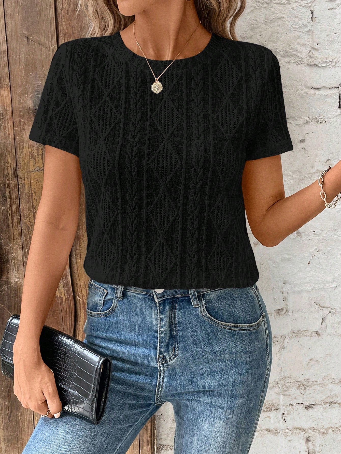 Frenchy Women Geometric Pattern Round Neck Casual Loose Fit Short Sleeve T-Shirt