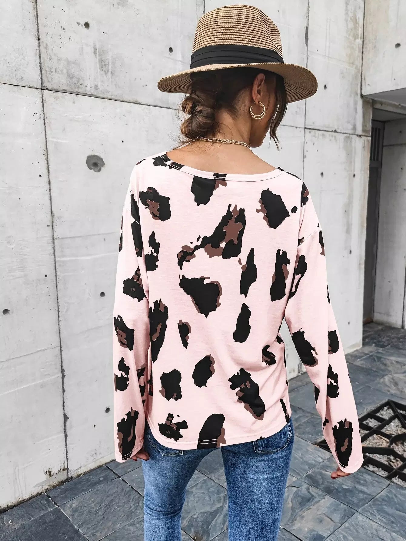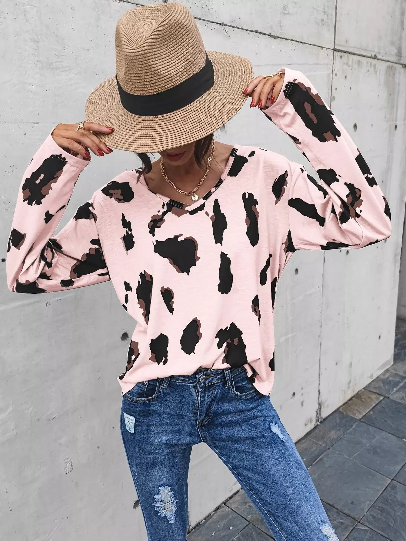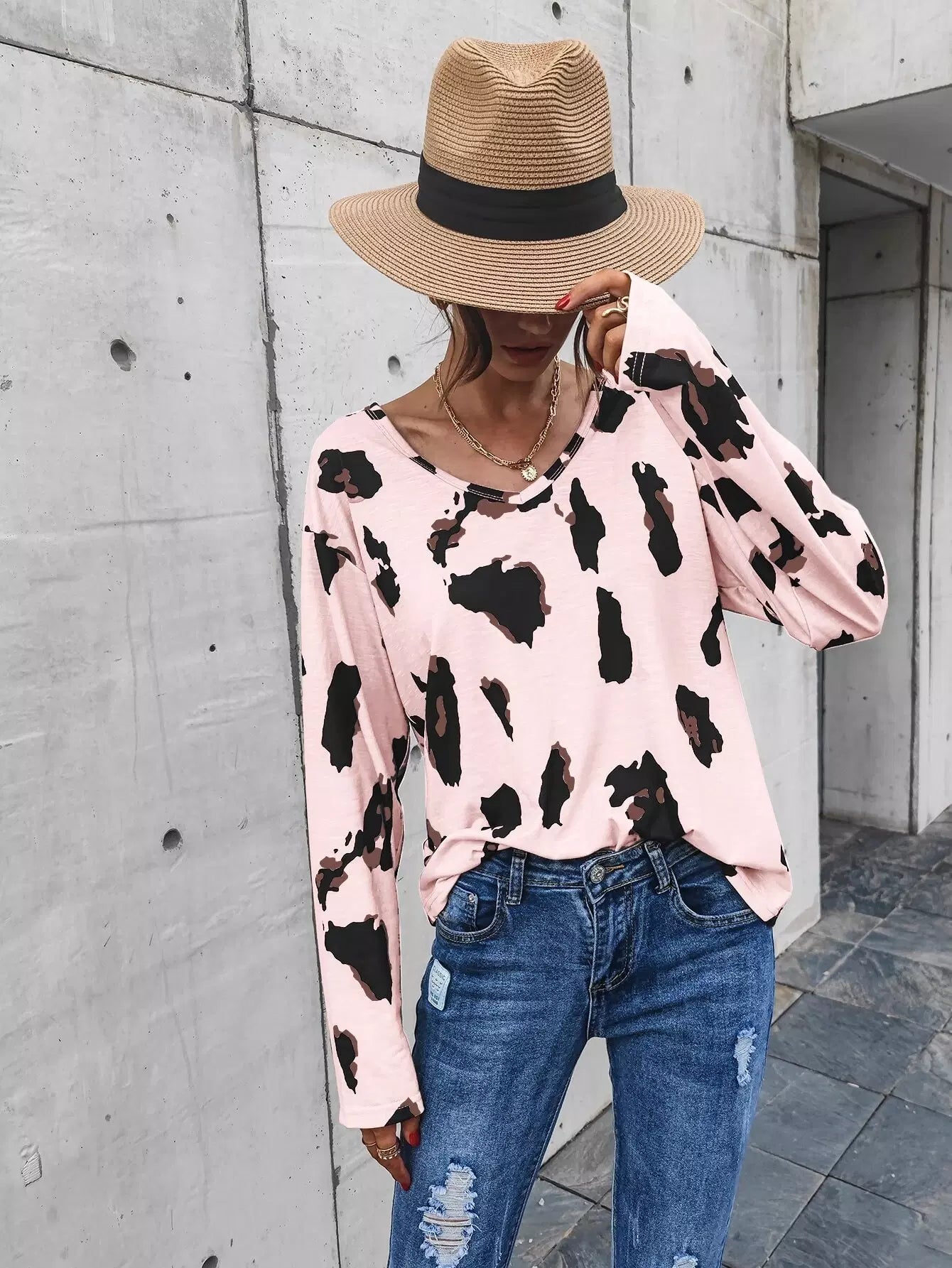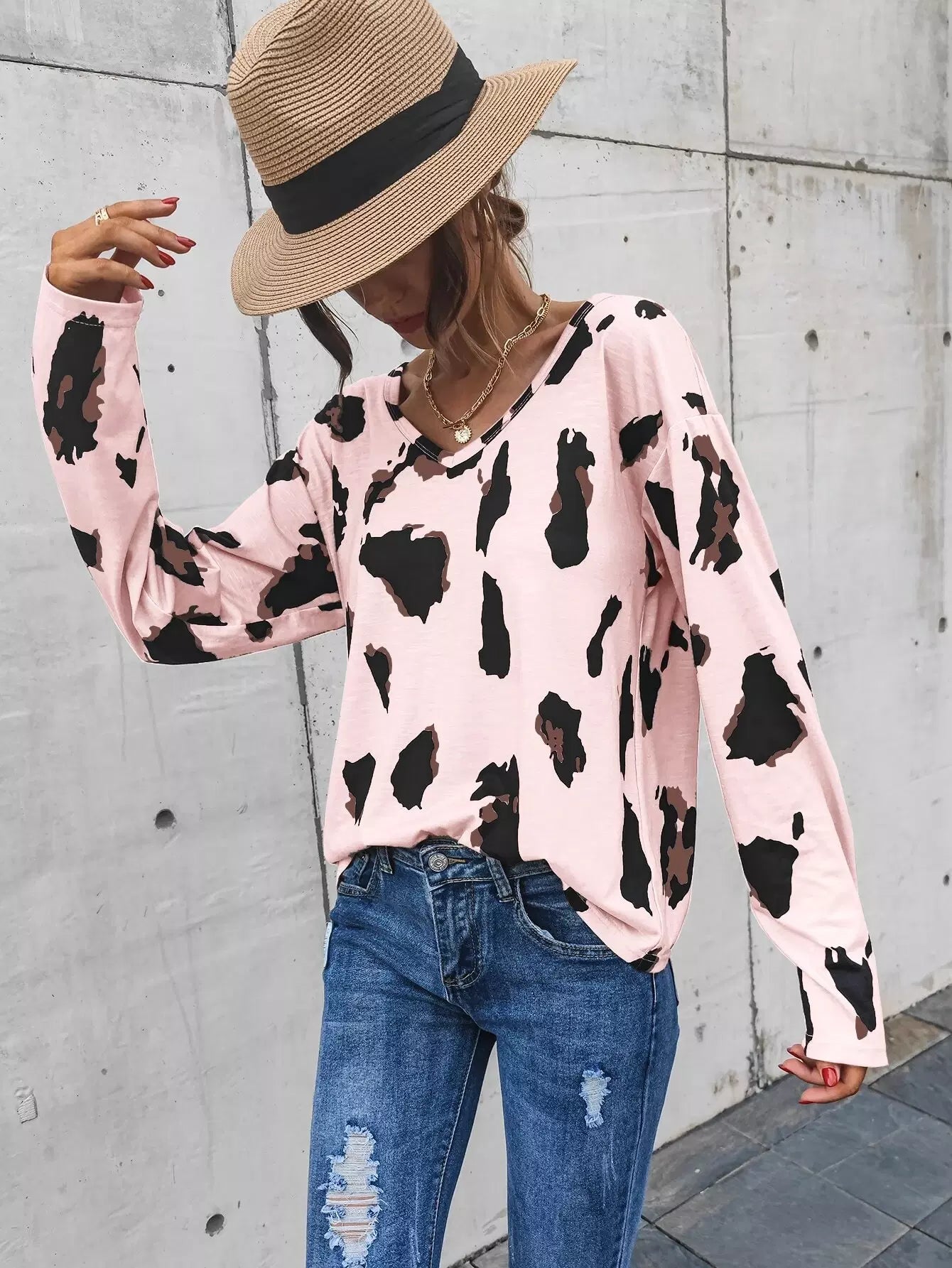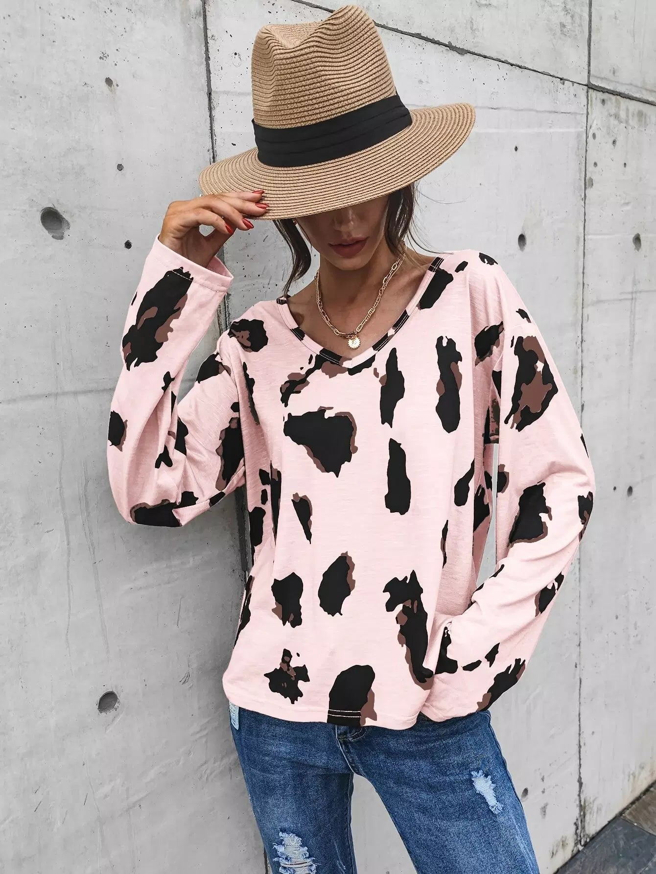 تي شيرت برقبة على شكل حرف V مطبوع عليه أكتاف منسدلة على شكل حرف V