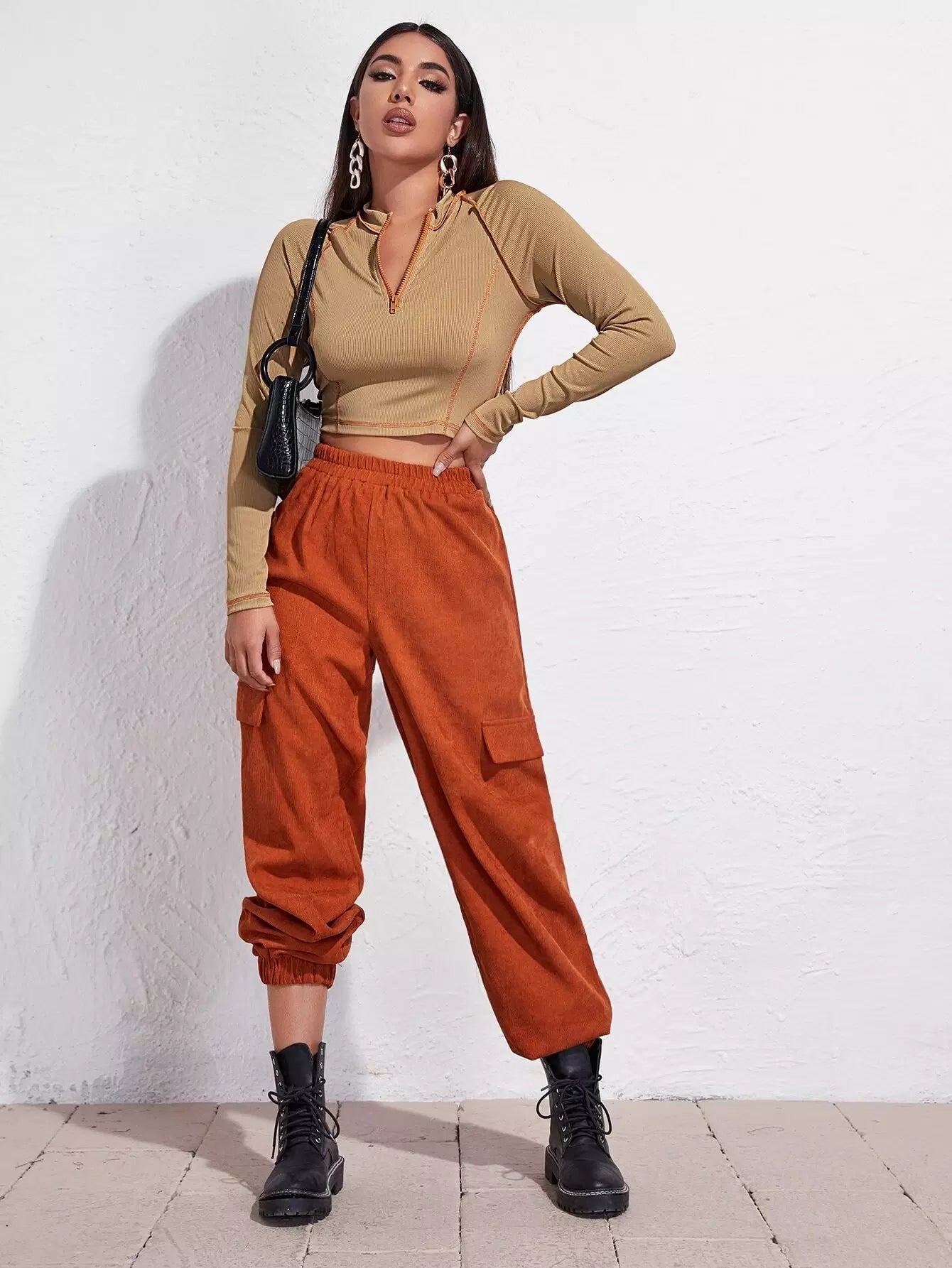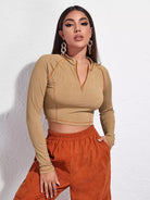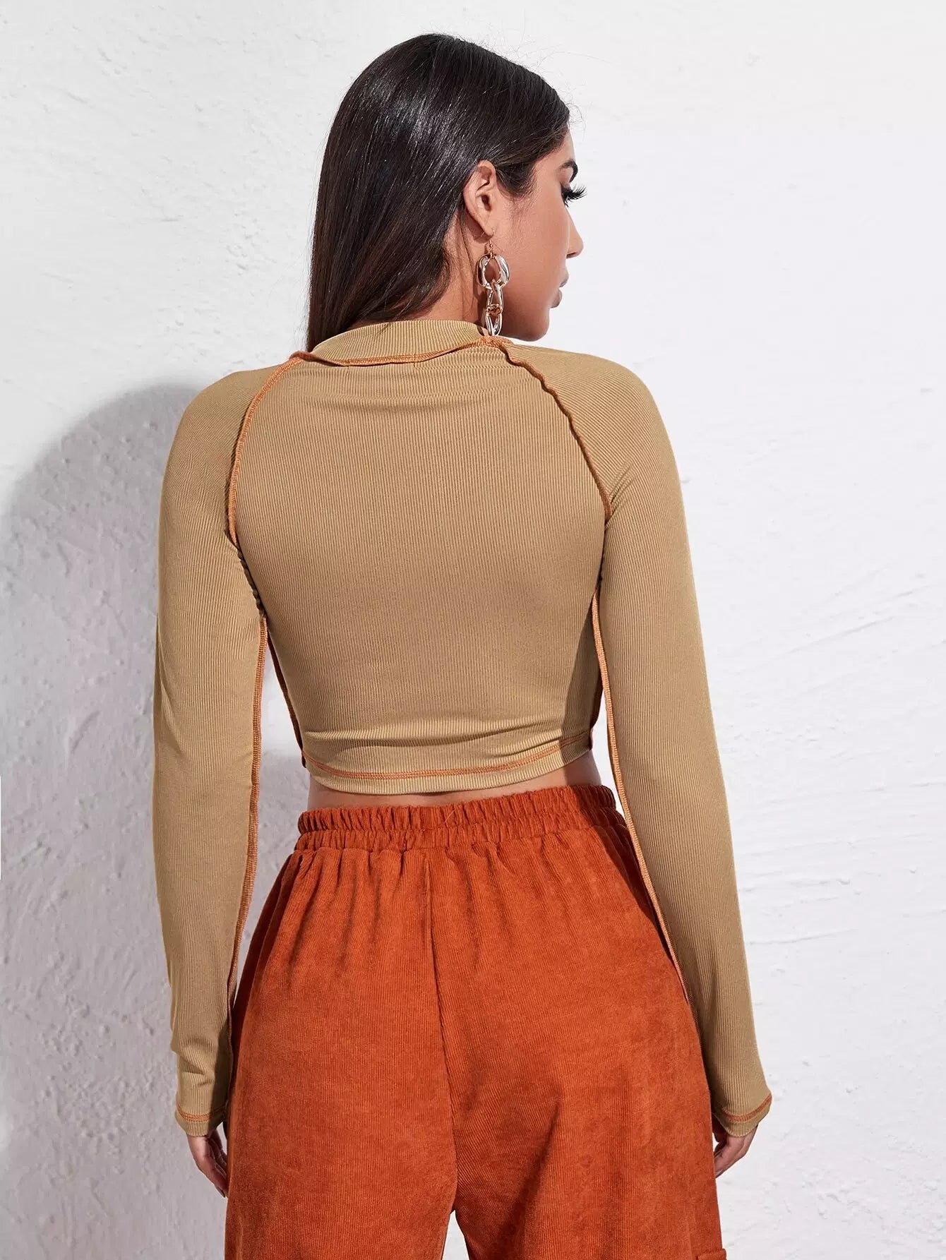 تي شيرت بأكمام ضيقة بنصف سحاب مزين بحواف مزينة بحواف ضيقة
