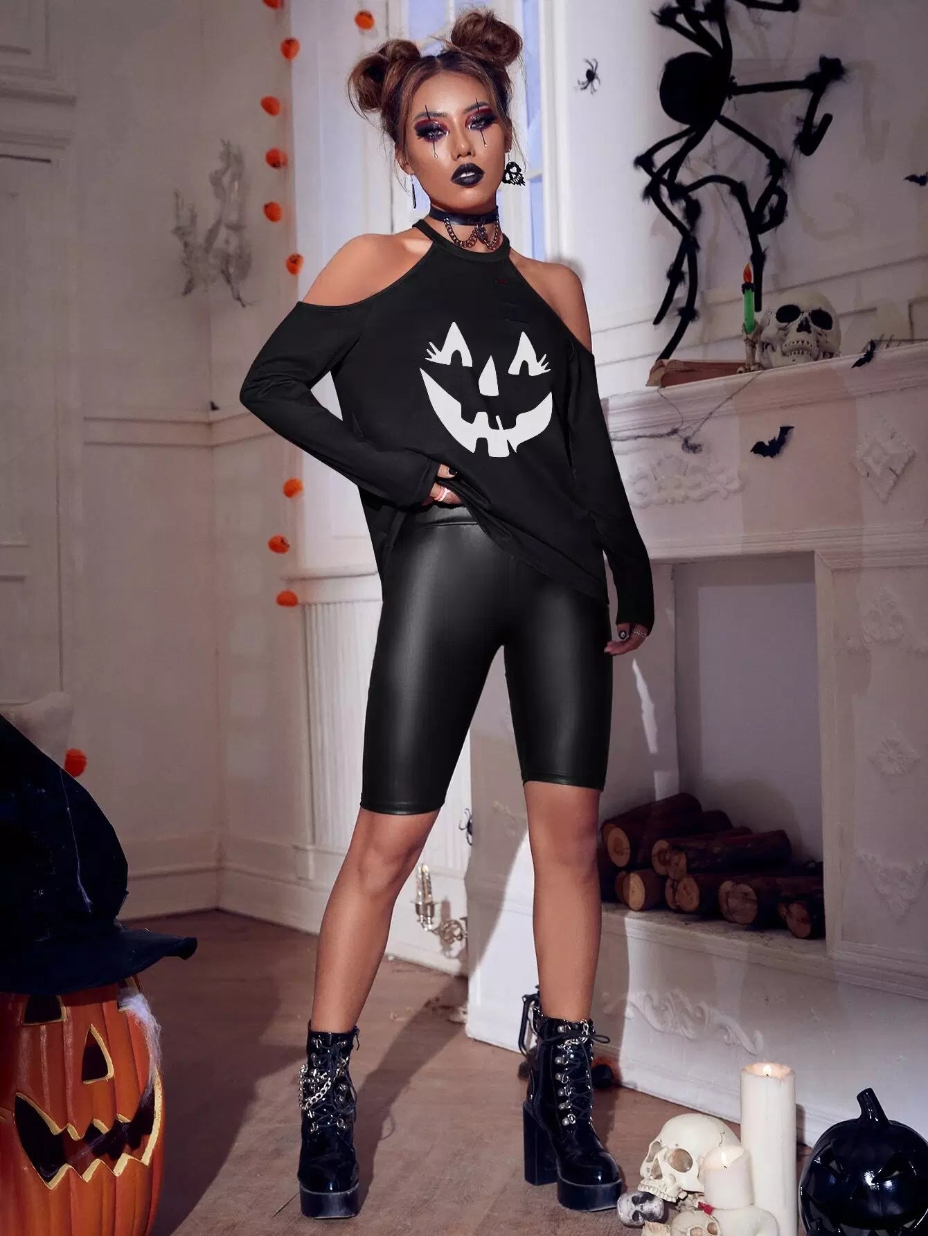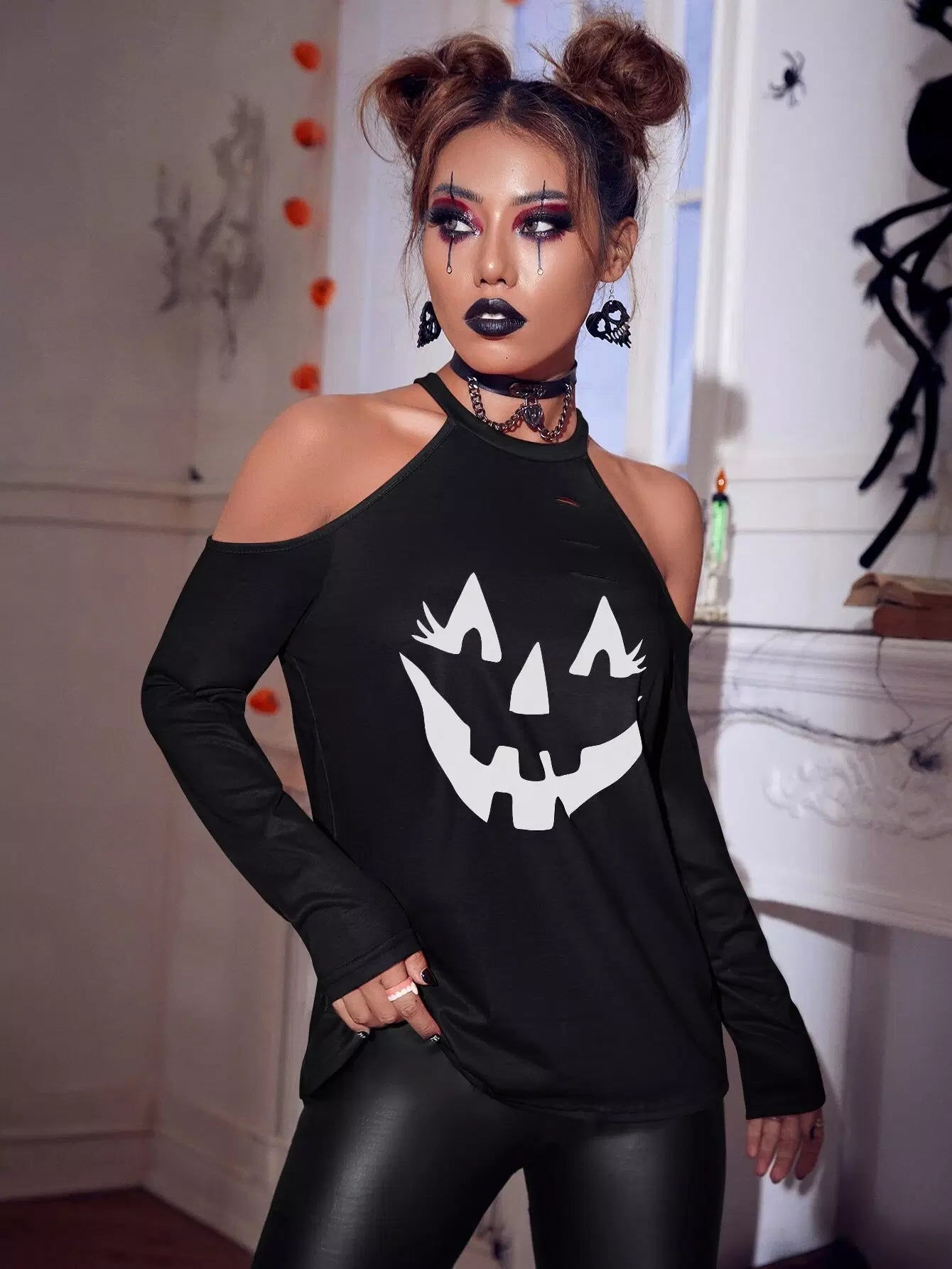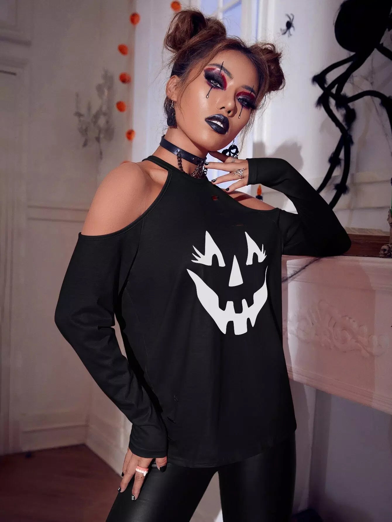 تي شيرت بأكتاف باردة مطبوع عليه طبعة هالوين