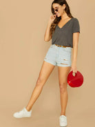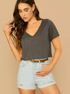 تي شيرت بياقة على شكل مربع محبوك على شكل حرف V برقبة على شكل مربع