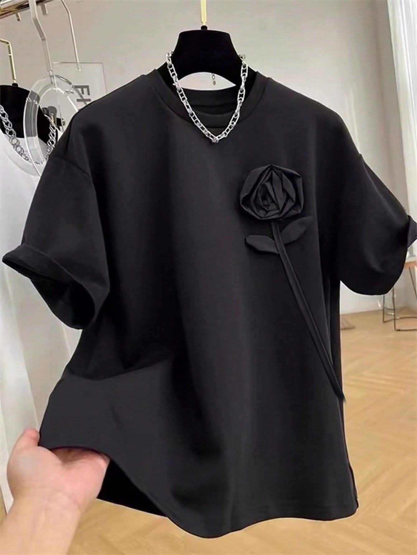تي شيرت نسائي كاجوال بأكمام قصيرة ورقبة دائرية وطبعة زهور ثلاثية الأبعاد من INAWLY
