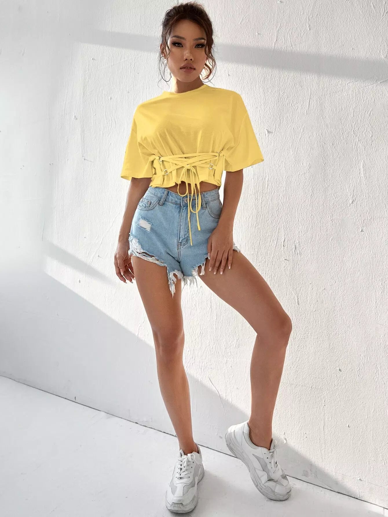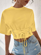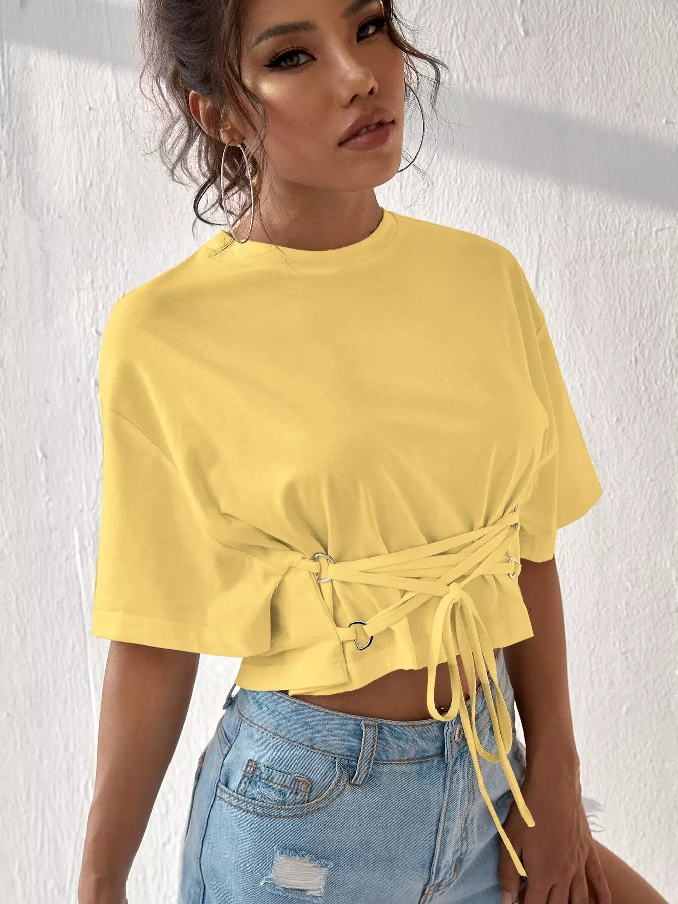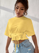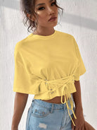 تي شيرت قصير منسدل الكتفين بعقدة منسدلة من الأمام