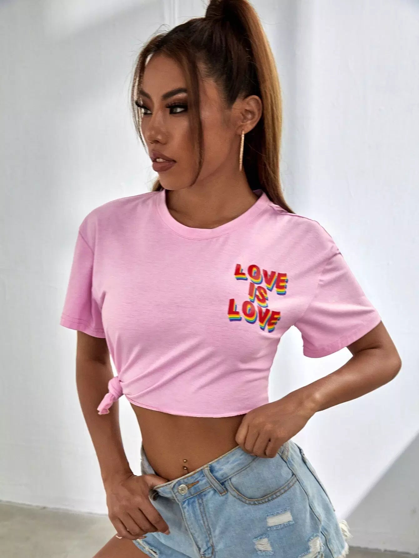 للنساء - تي شيرت برسومات شعار جانبي بعقدة