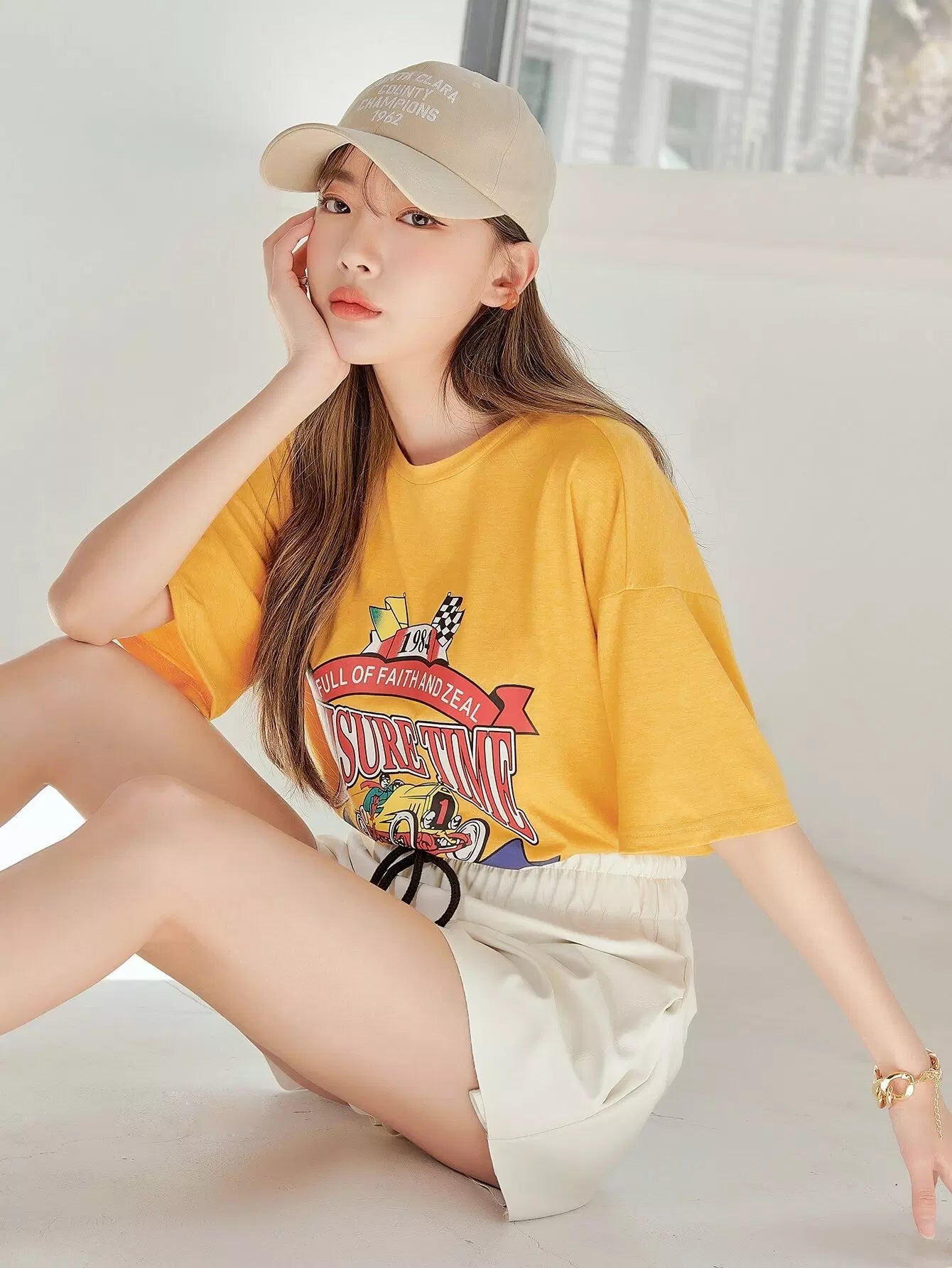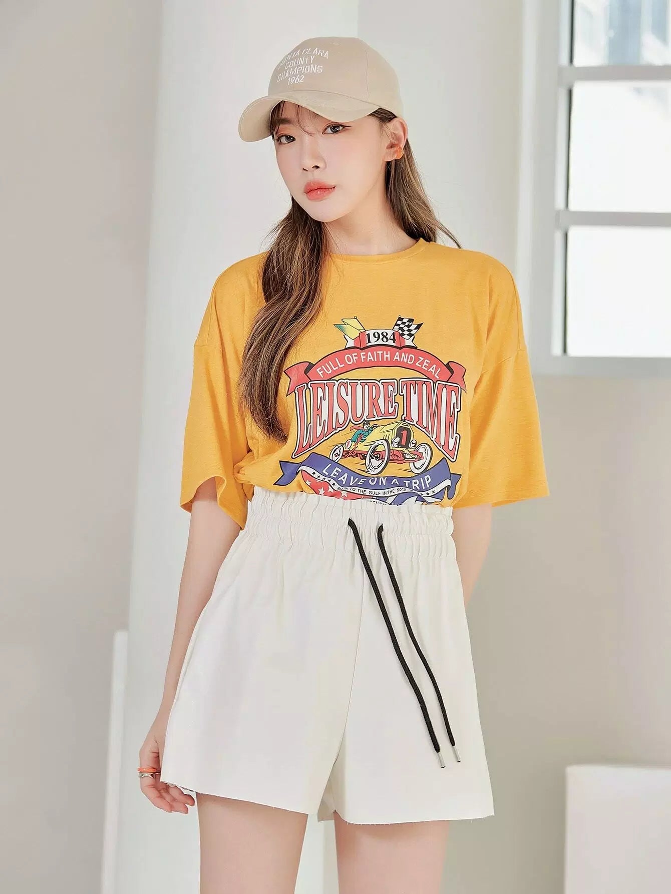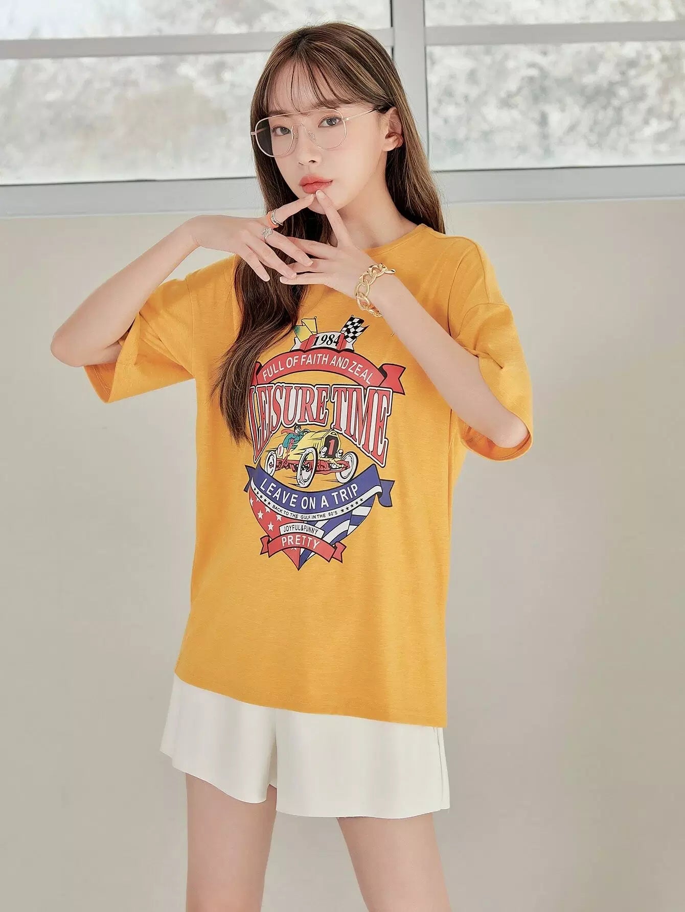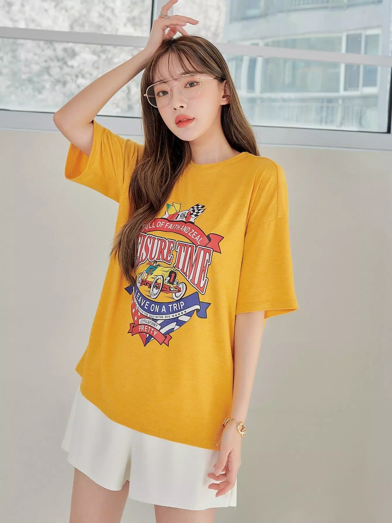 تي شيرت منسدل الكتف مطبوع عليه حروف وسيارة
