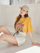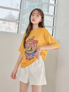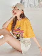 للنساء - تي شيرت بأكتاف منسدلة مطبوع عليه حروف وسيارة