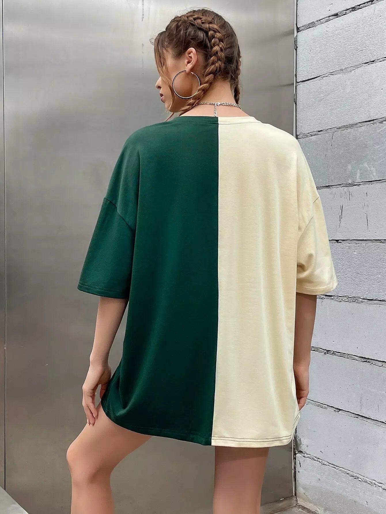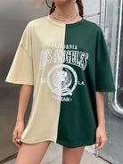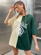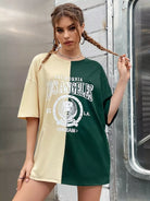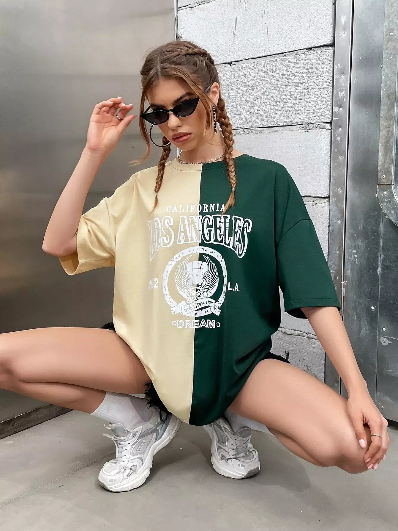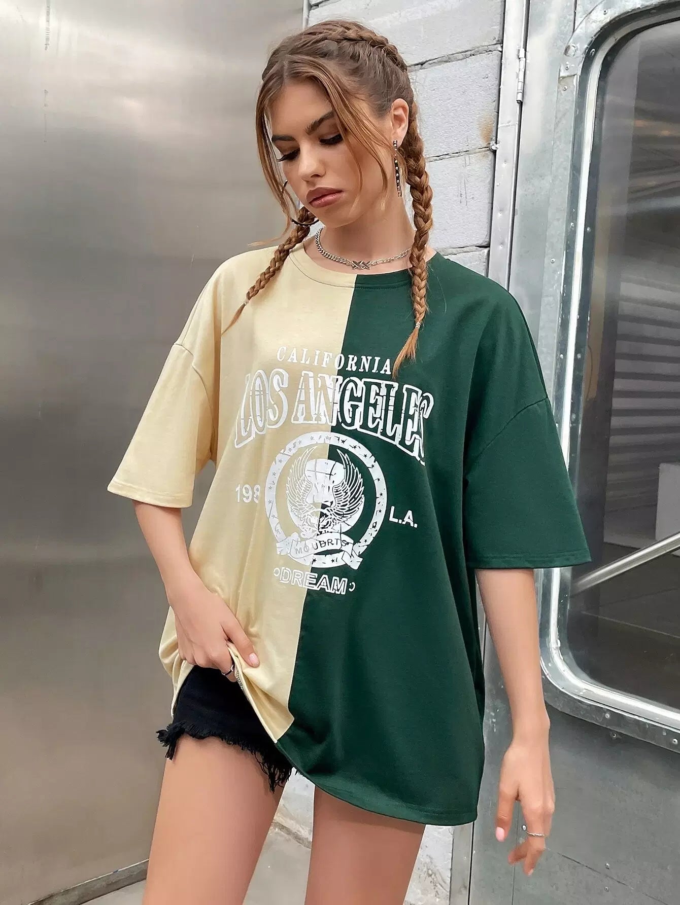 تي شيرت بطبعة الحروف والنسر بلونين مع كتف منسدلة
