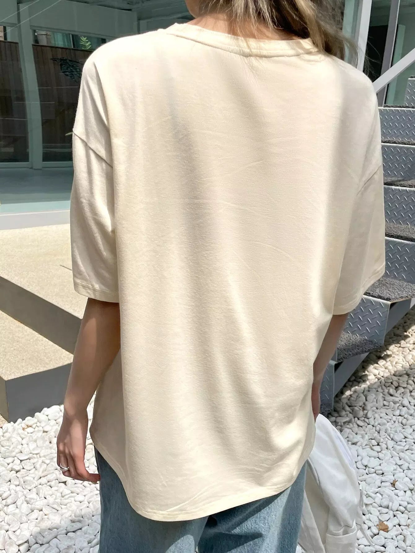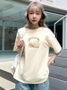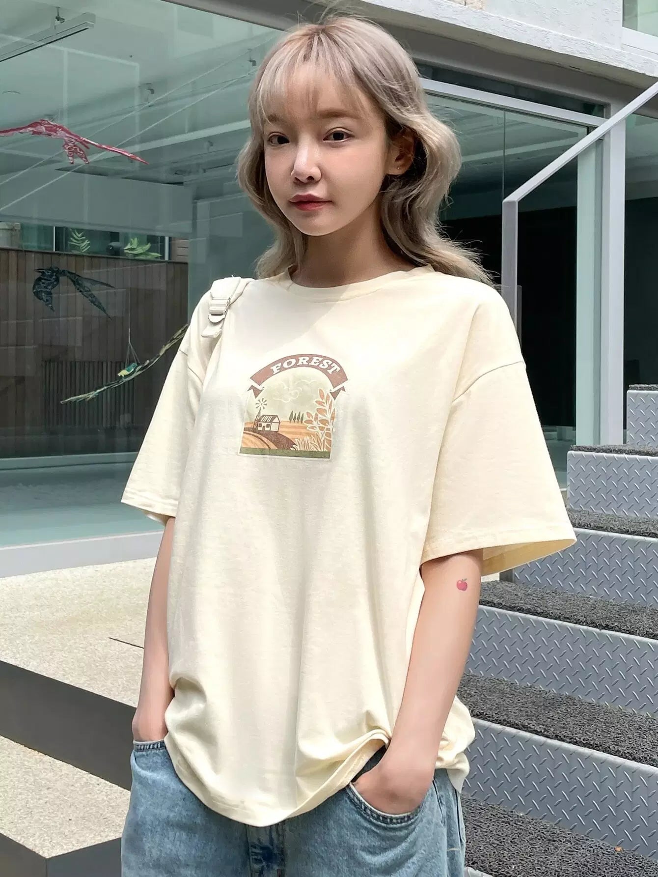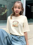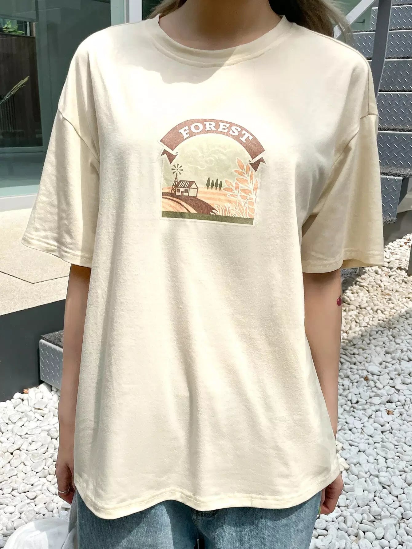 تي شيرت منسدل الكتف مطبوع عليه حروف ورسوم كرتونية