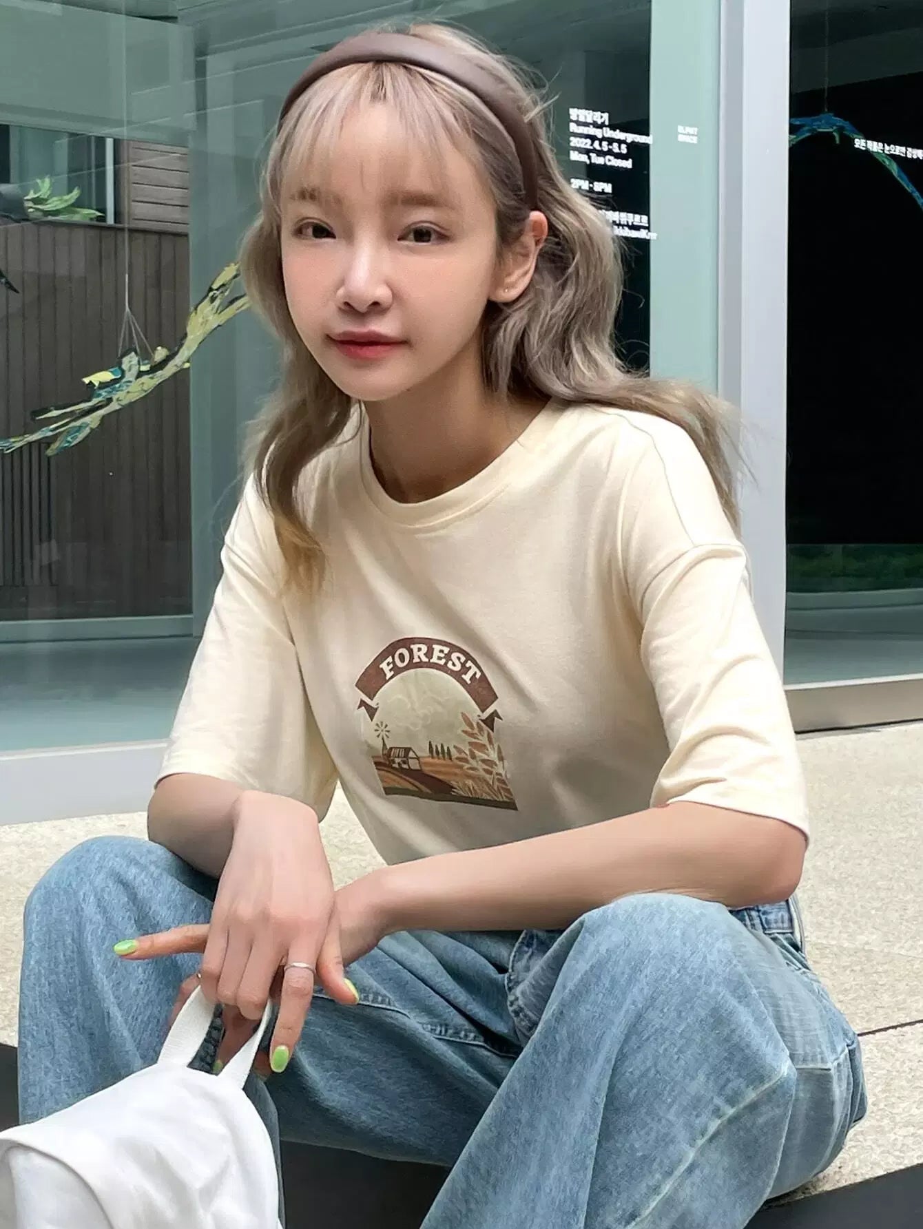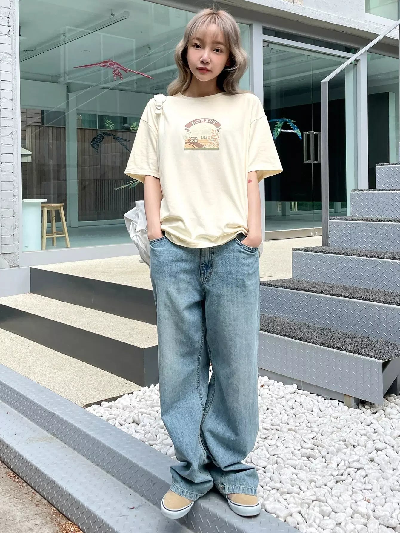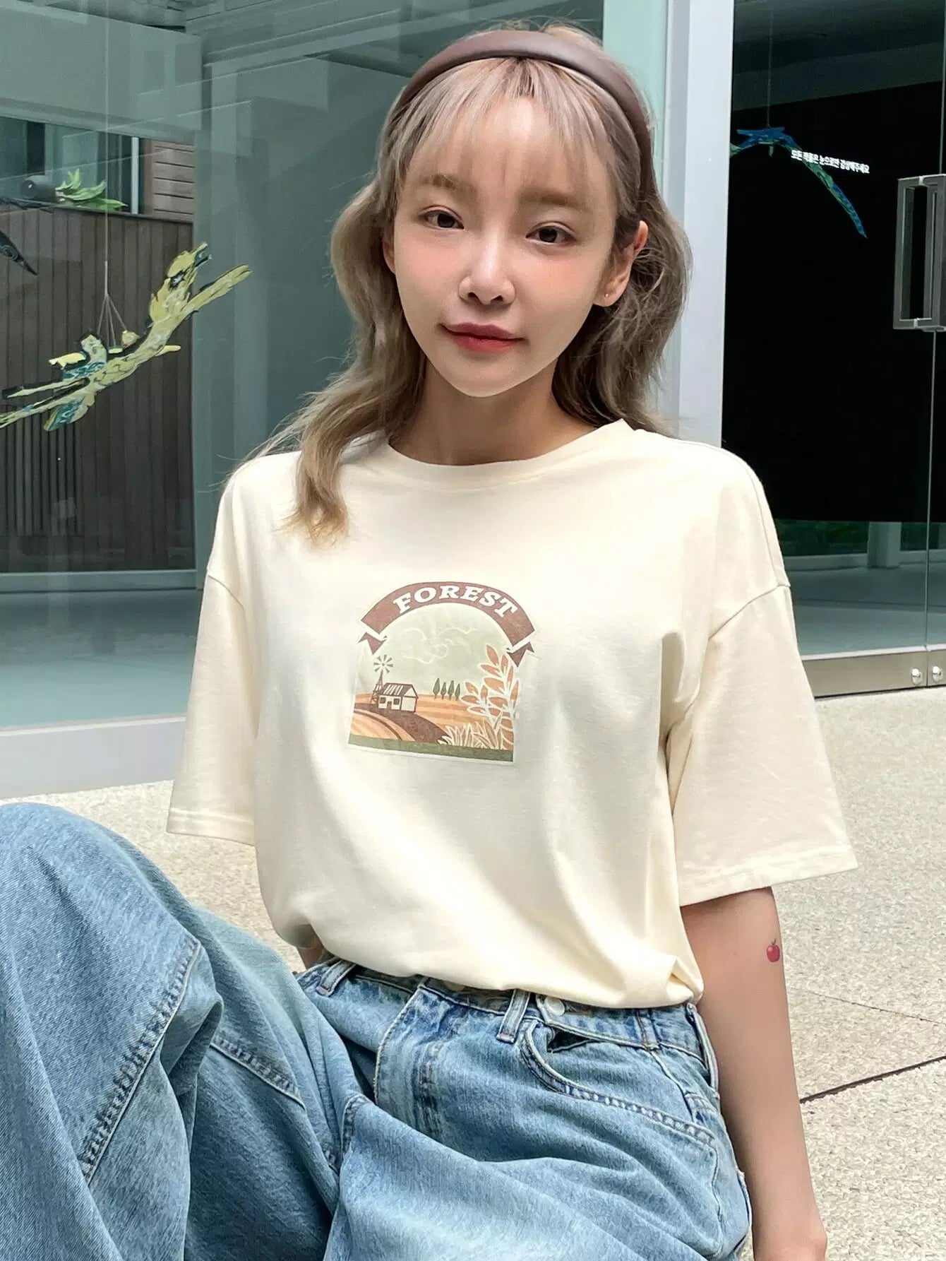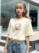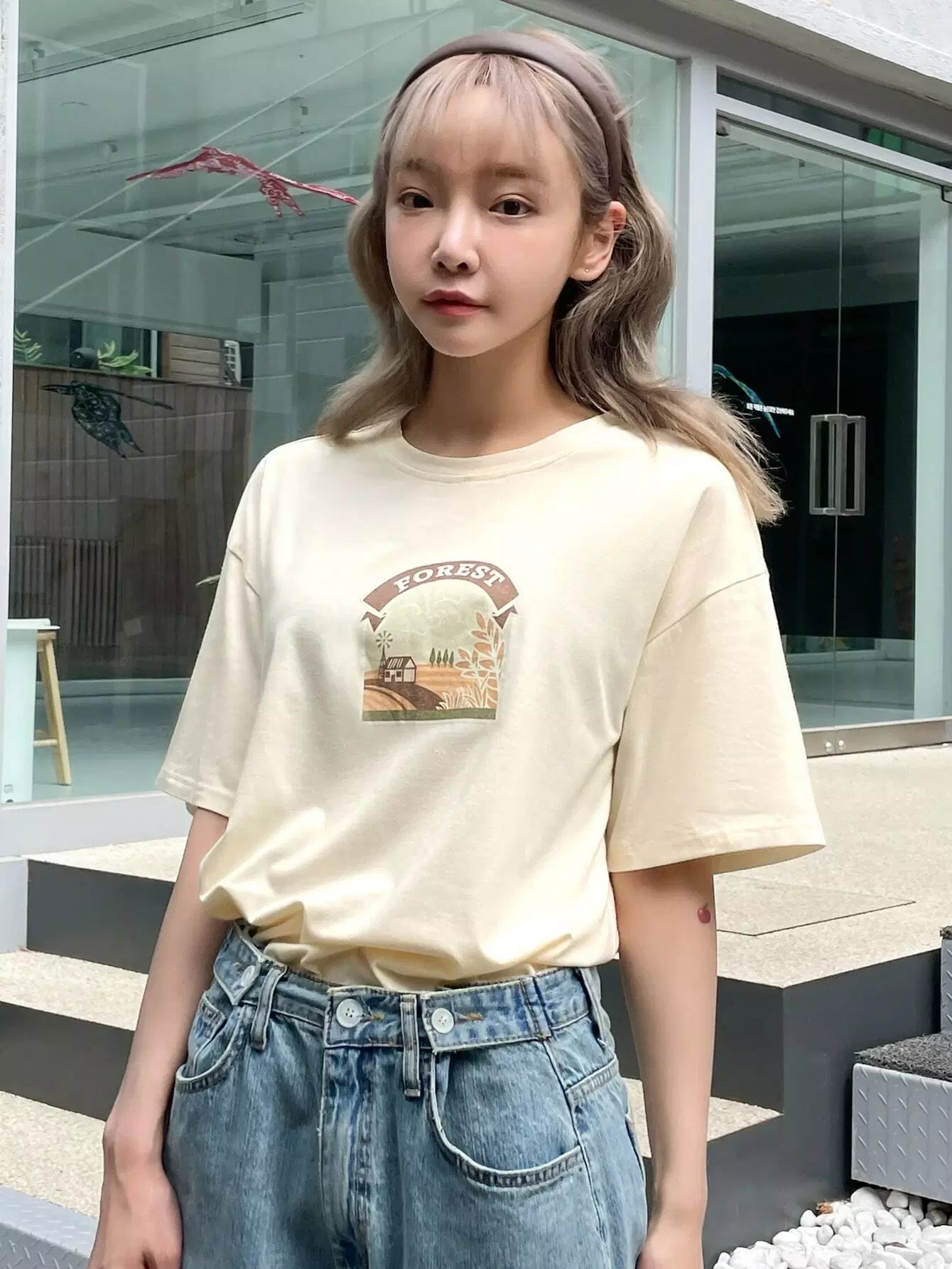 تي شيرت منسدل الكتف مطبوع عليه حروف ورسوم كرتونية