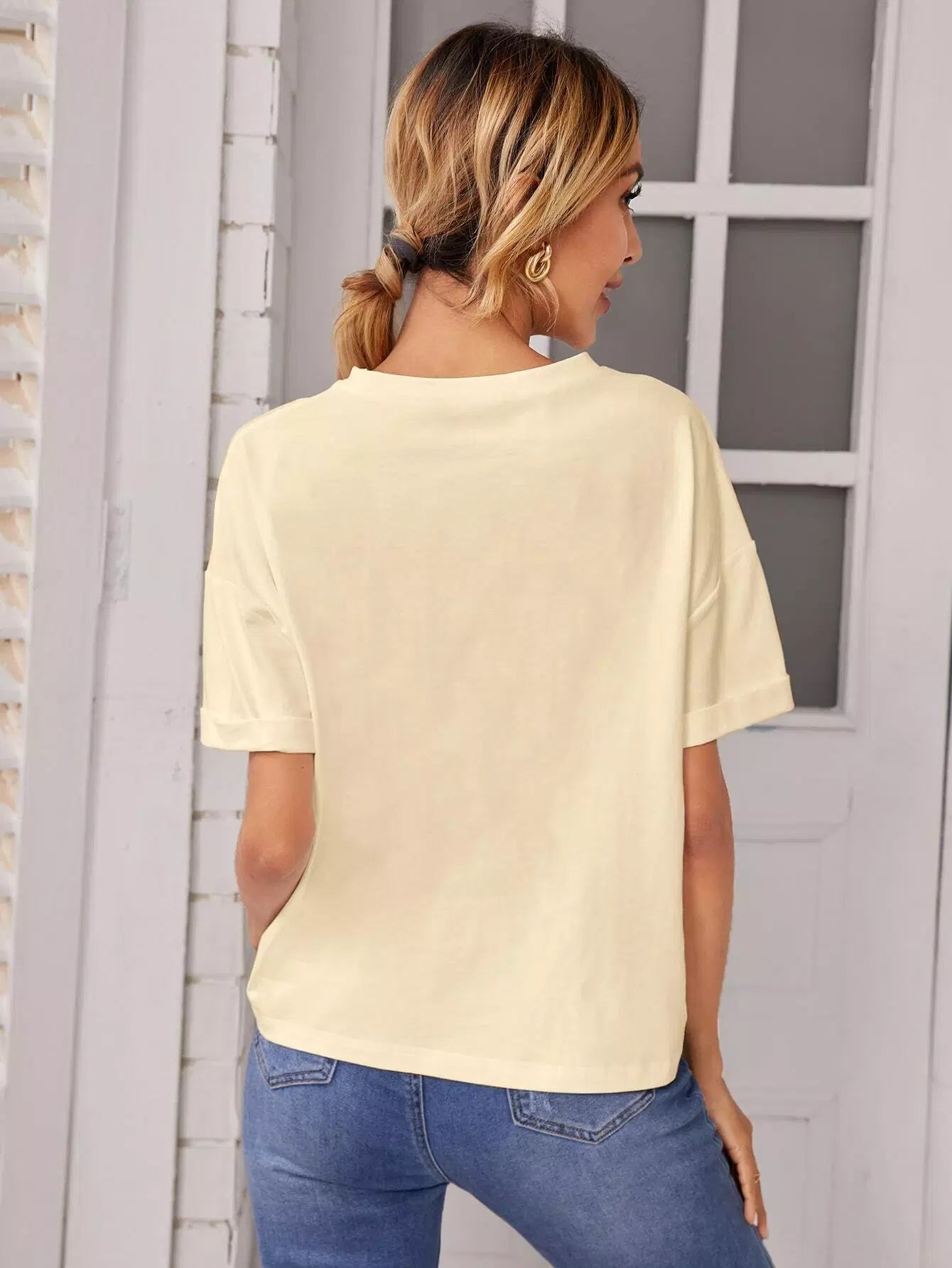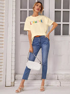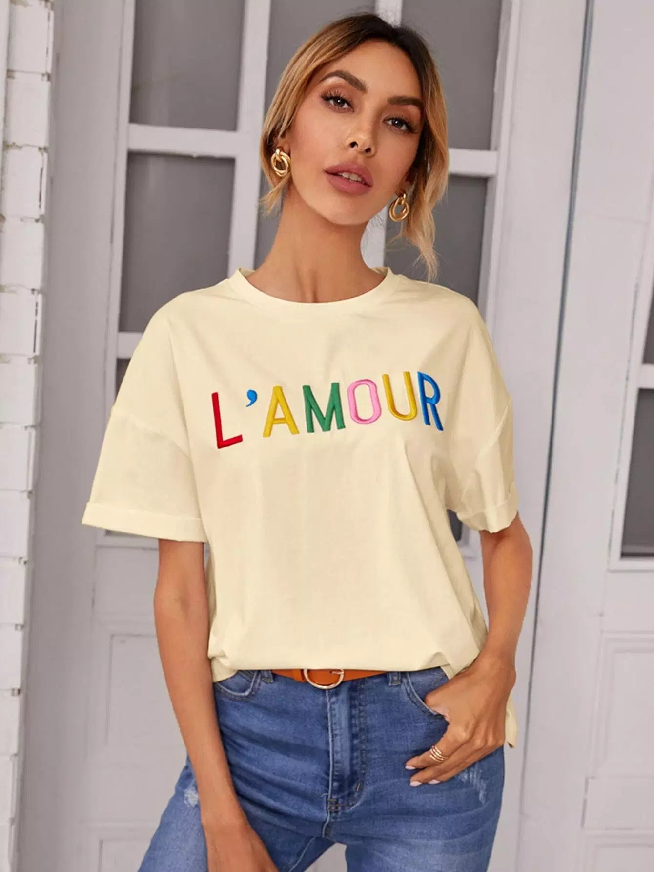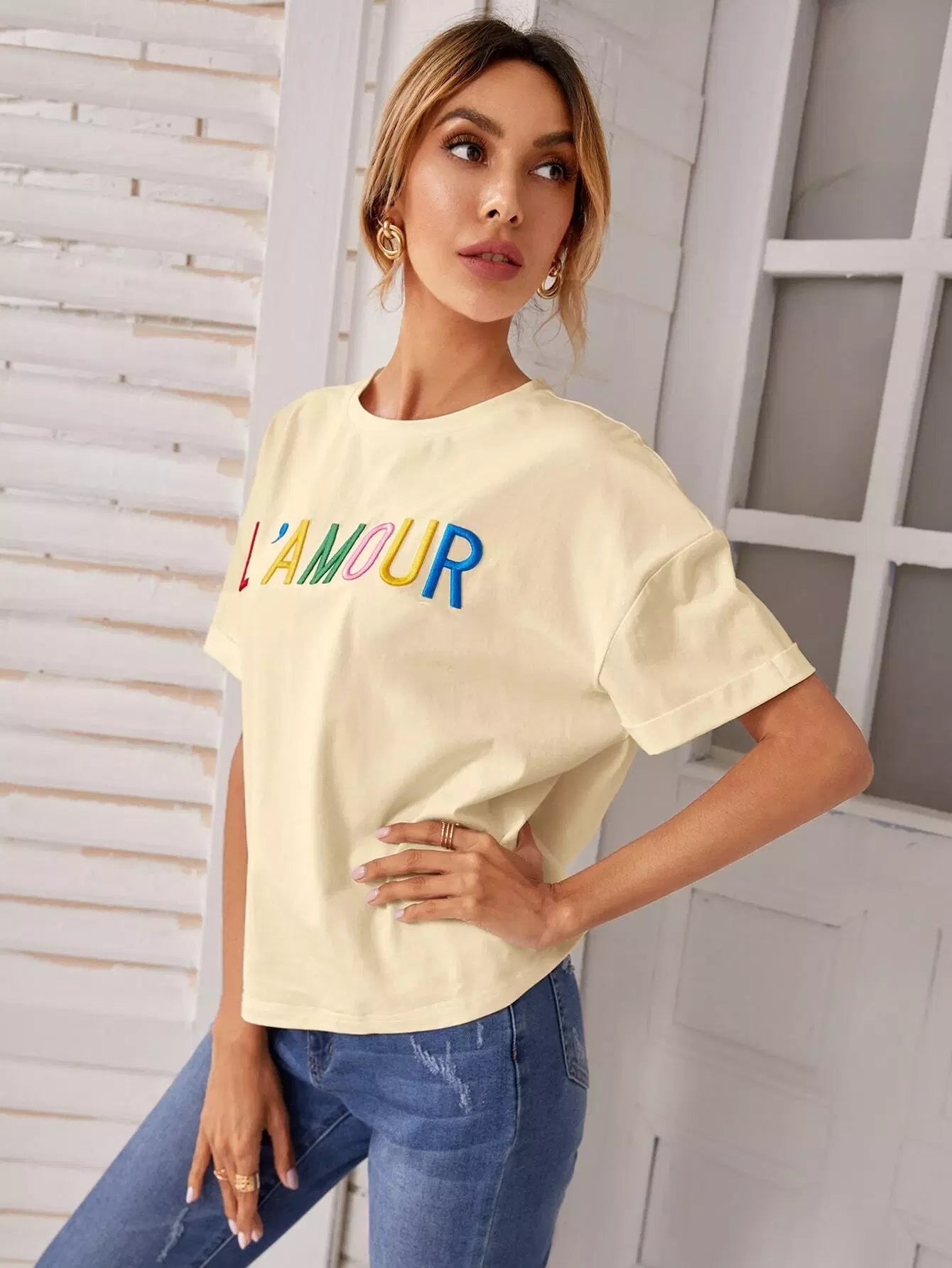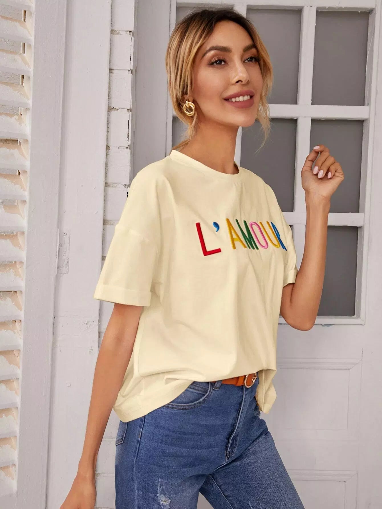 تي شيرت منسدل الكتف مطرز بتطريز حروف