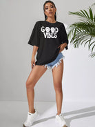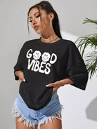 تي شيرت منسدل الكتف مطبوع عليه حروف وتعبيرات