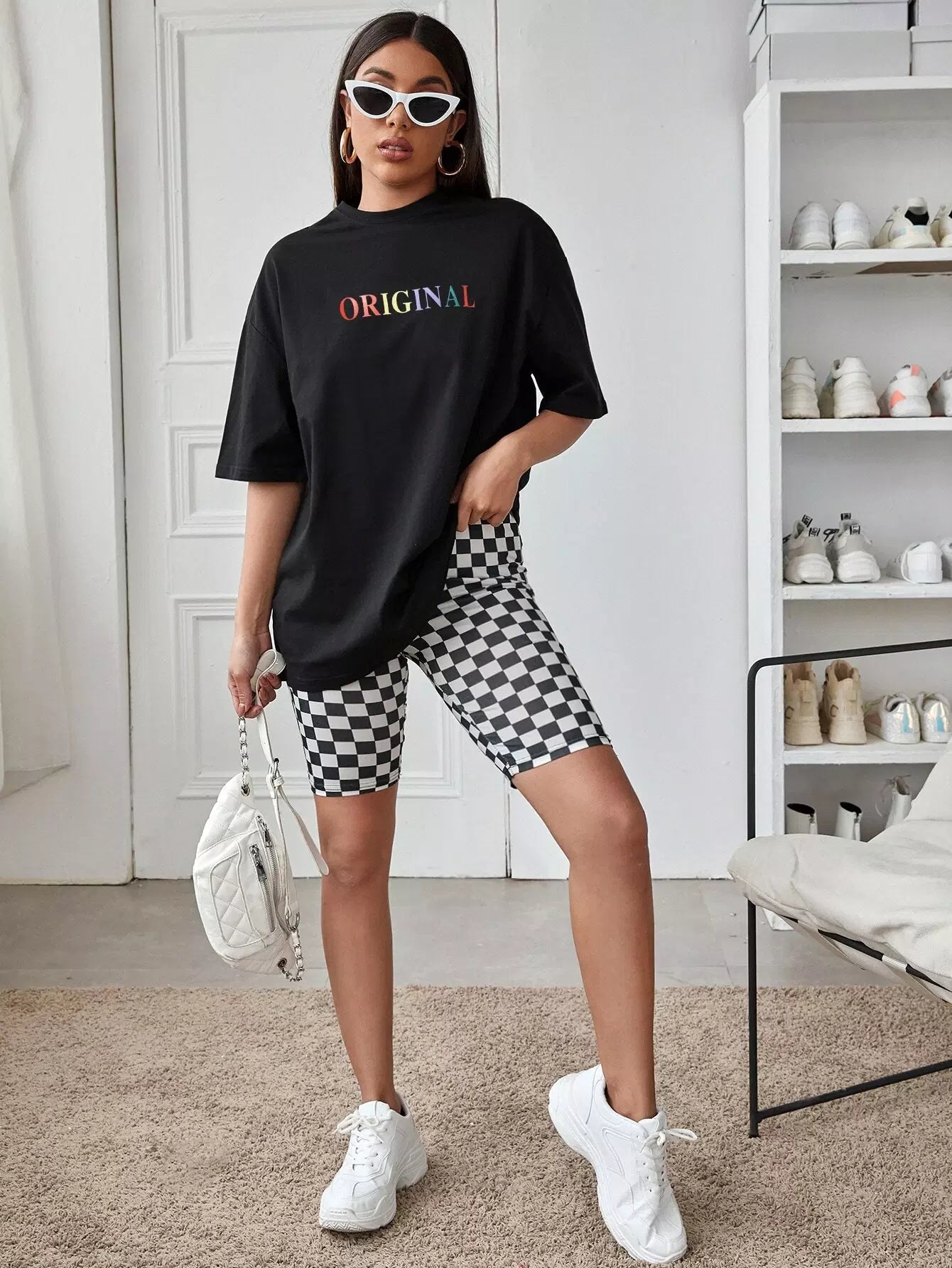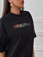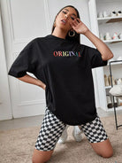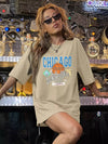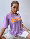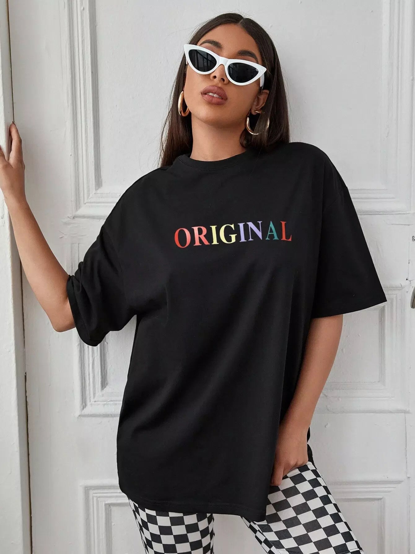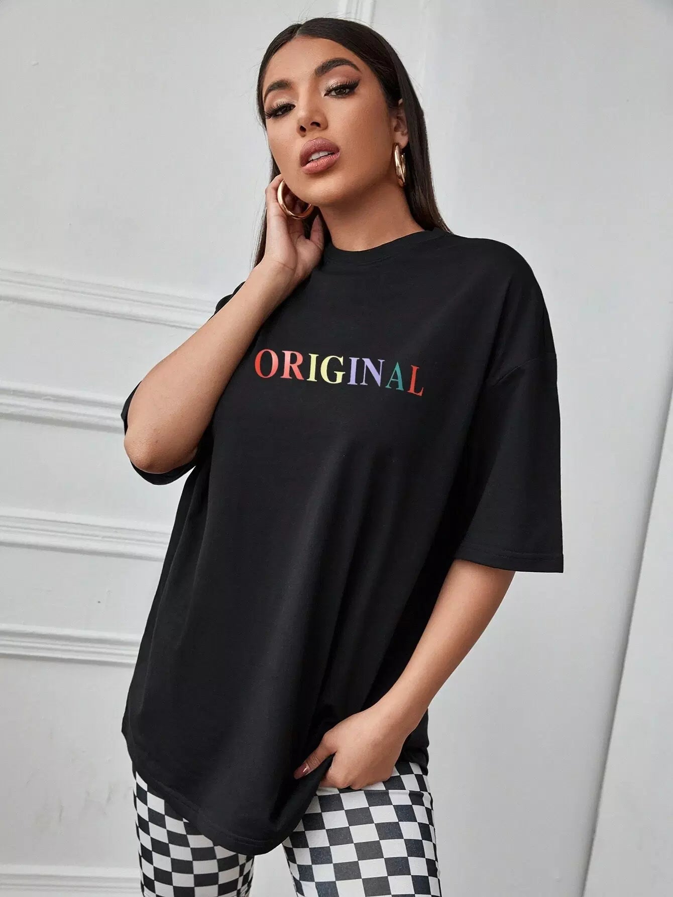 للنساء - تي شيرت كبير الحجم بكتف منسدل وجرافيك على شكل حرف