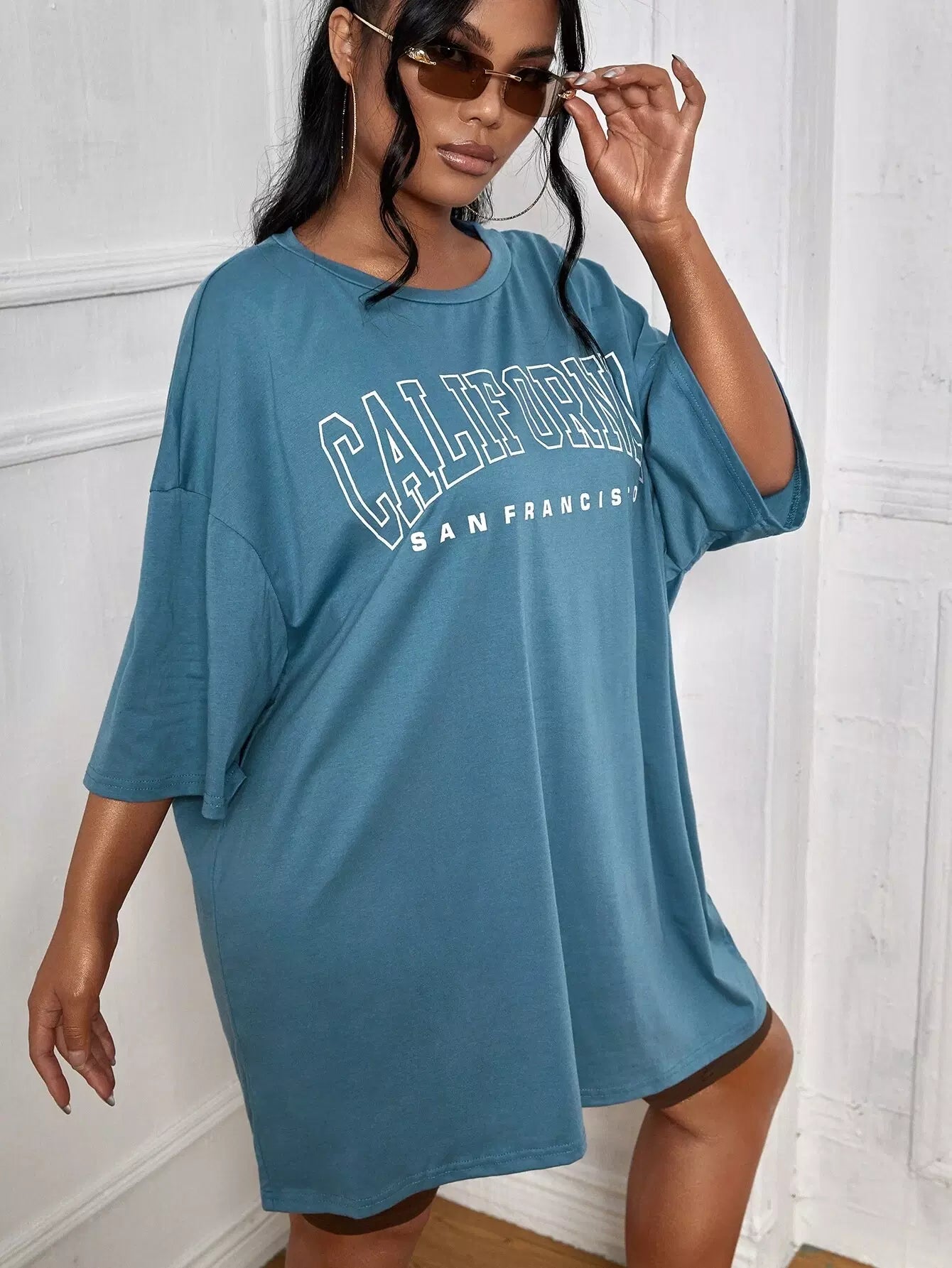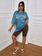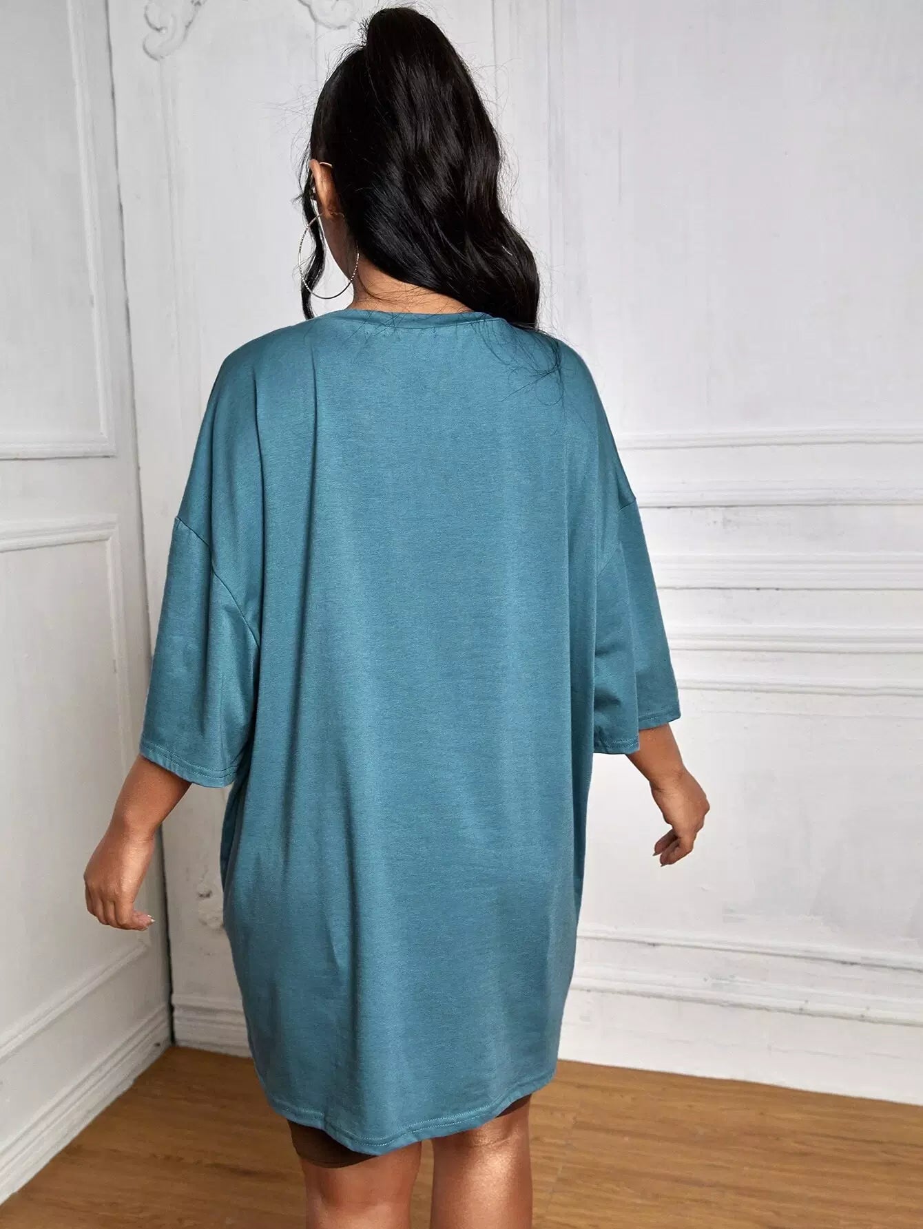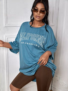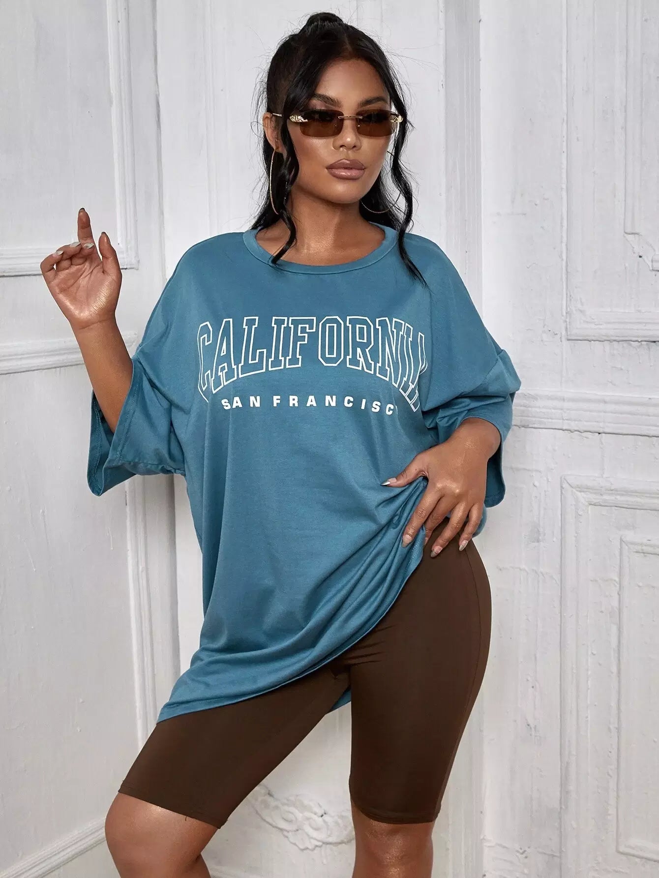 تي شيرت منسدل الكتف برسومات على شكل حرف