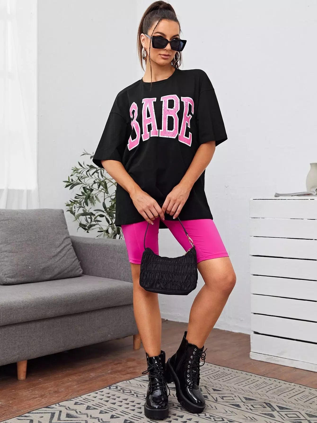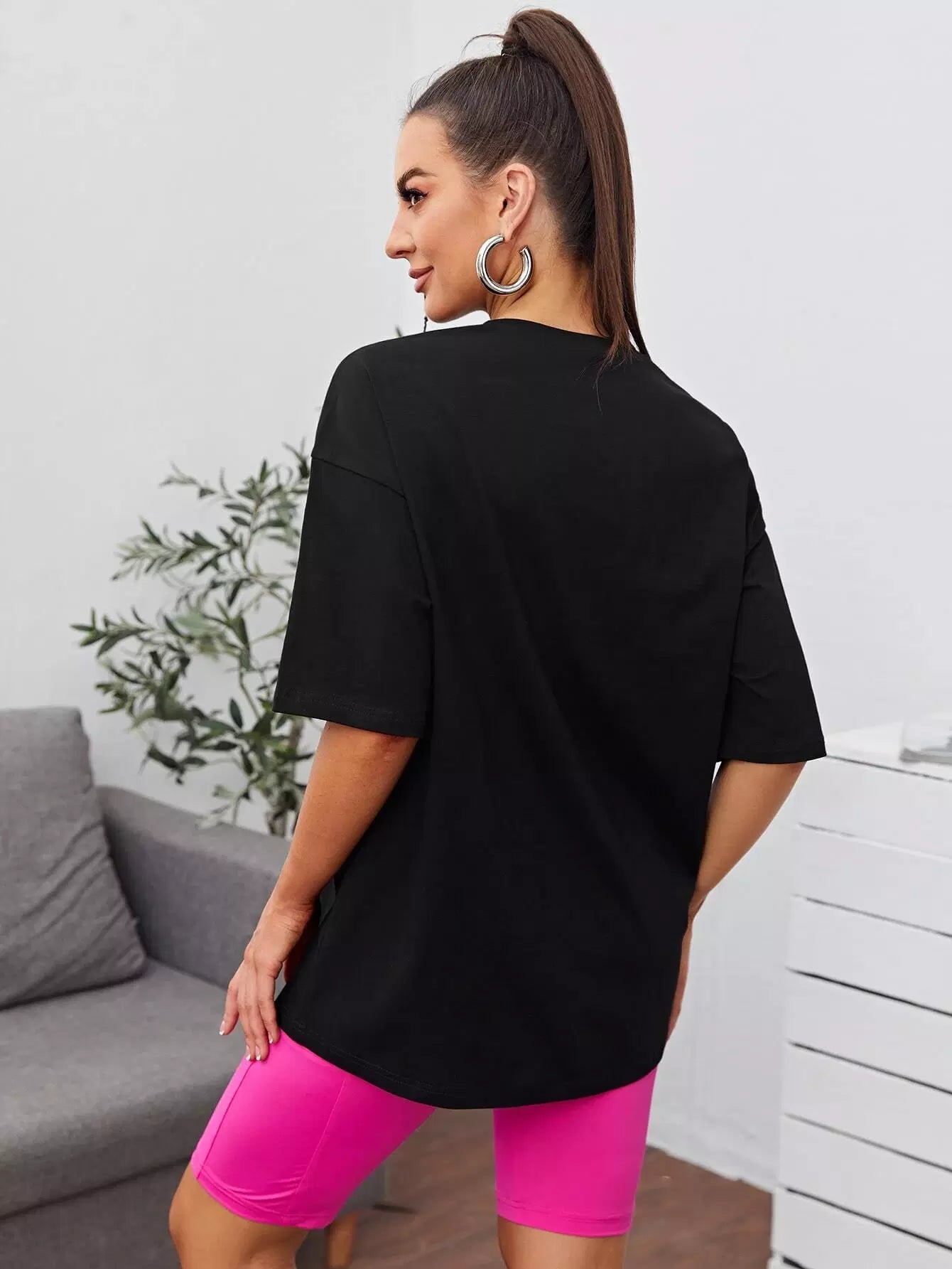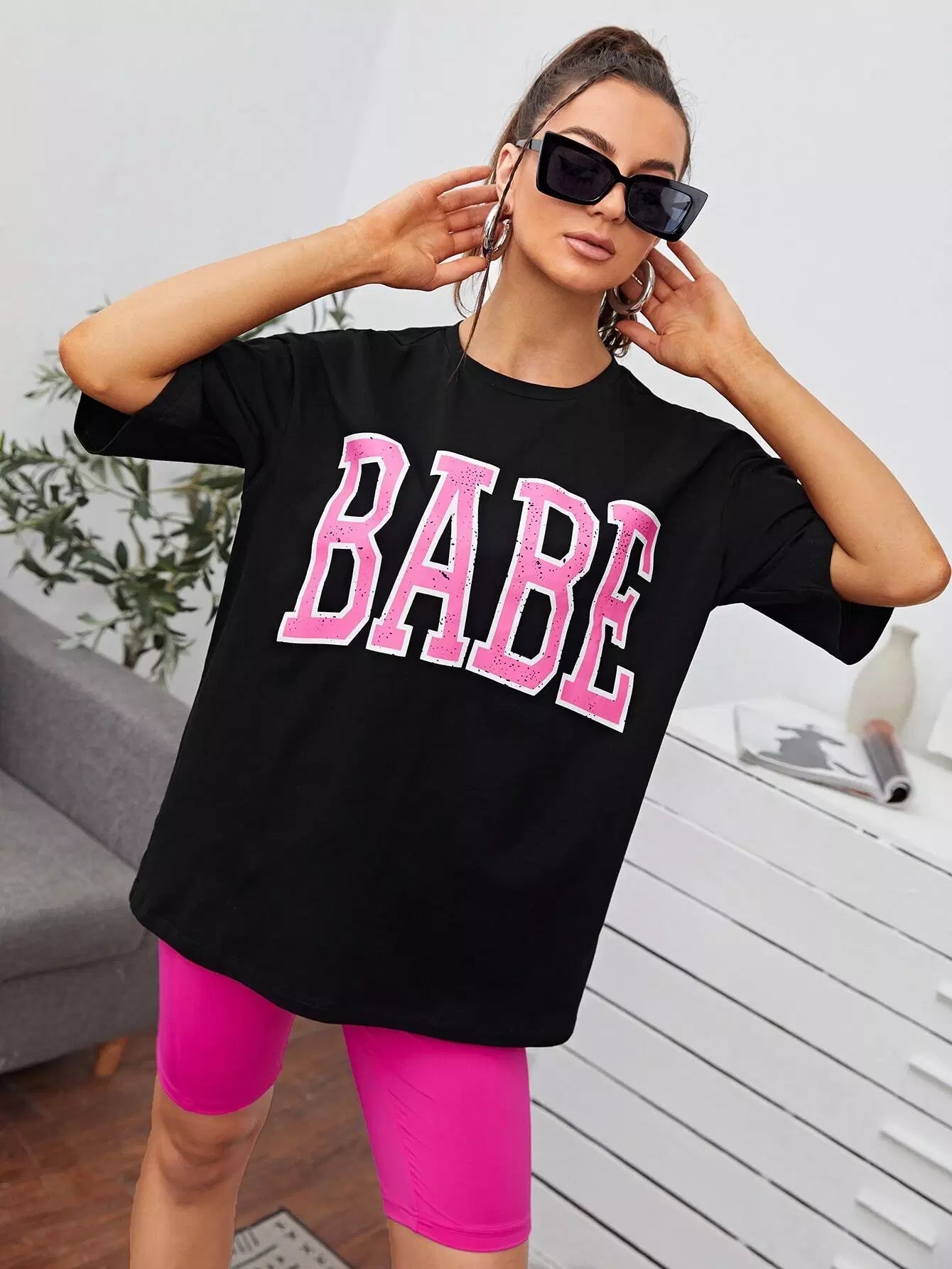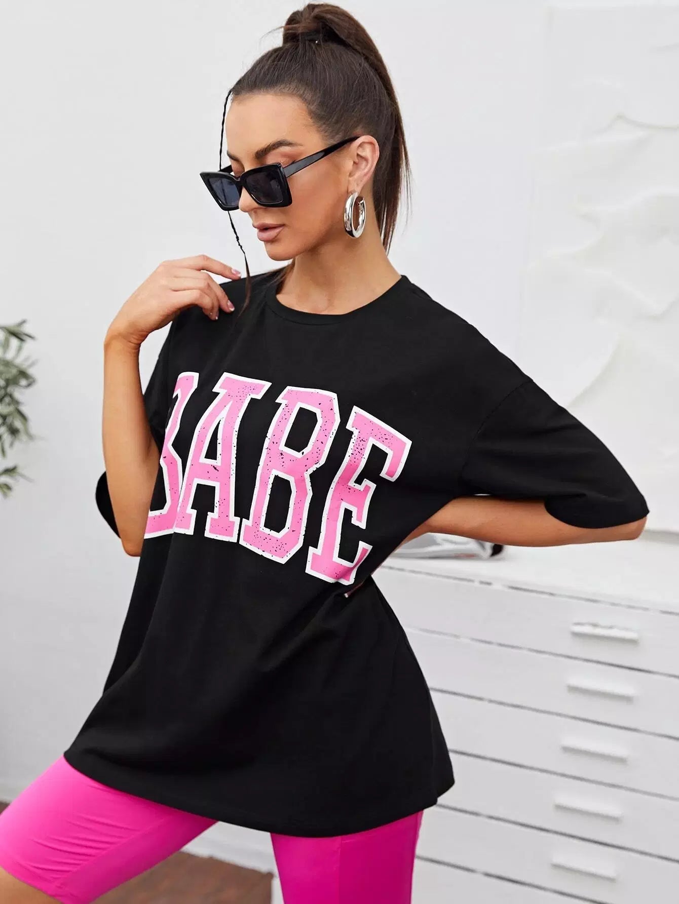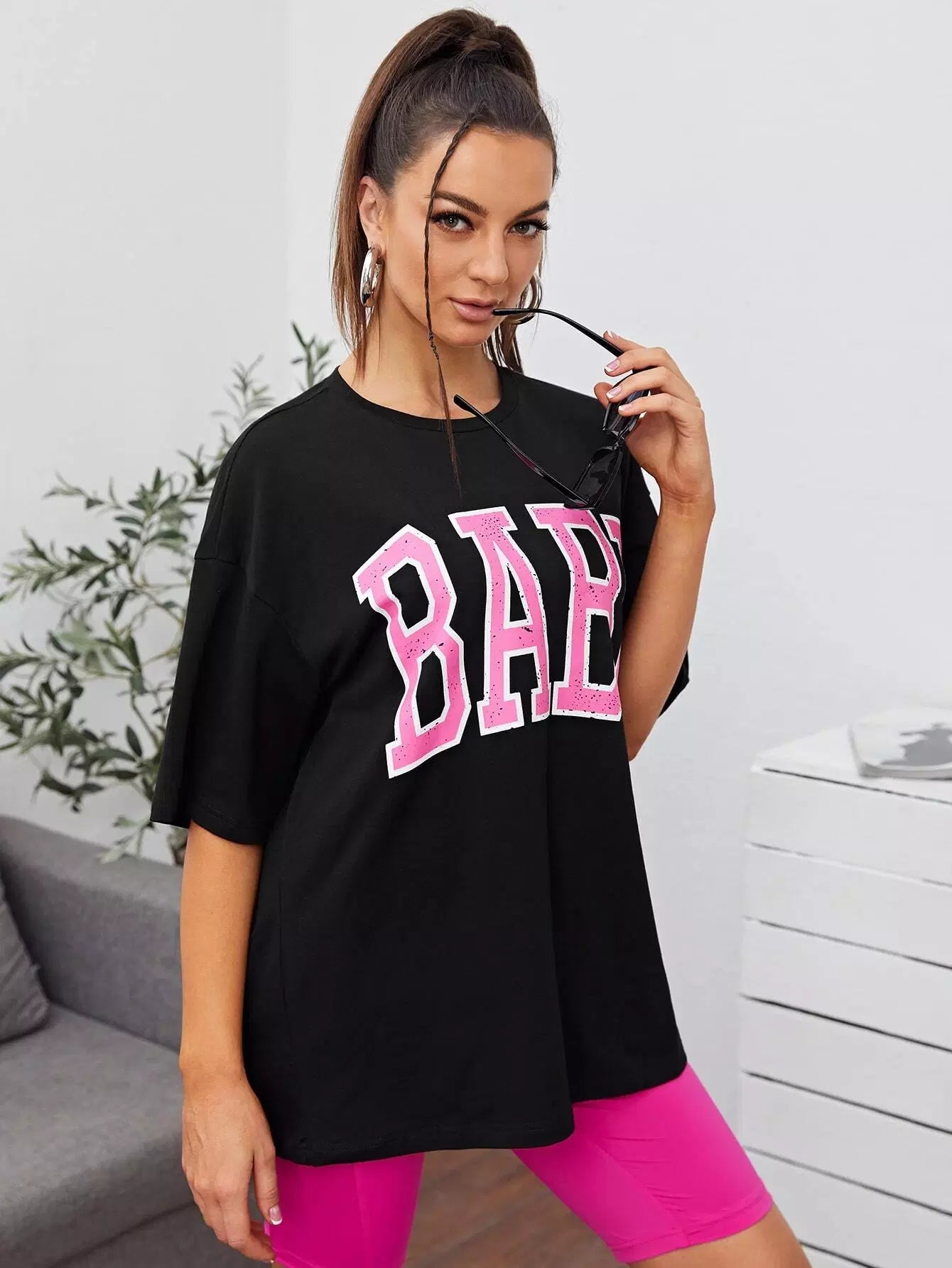 للنساء - تي شيرت بكتف منسدل ورسومات الحروف