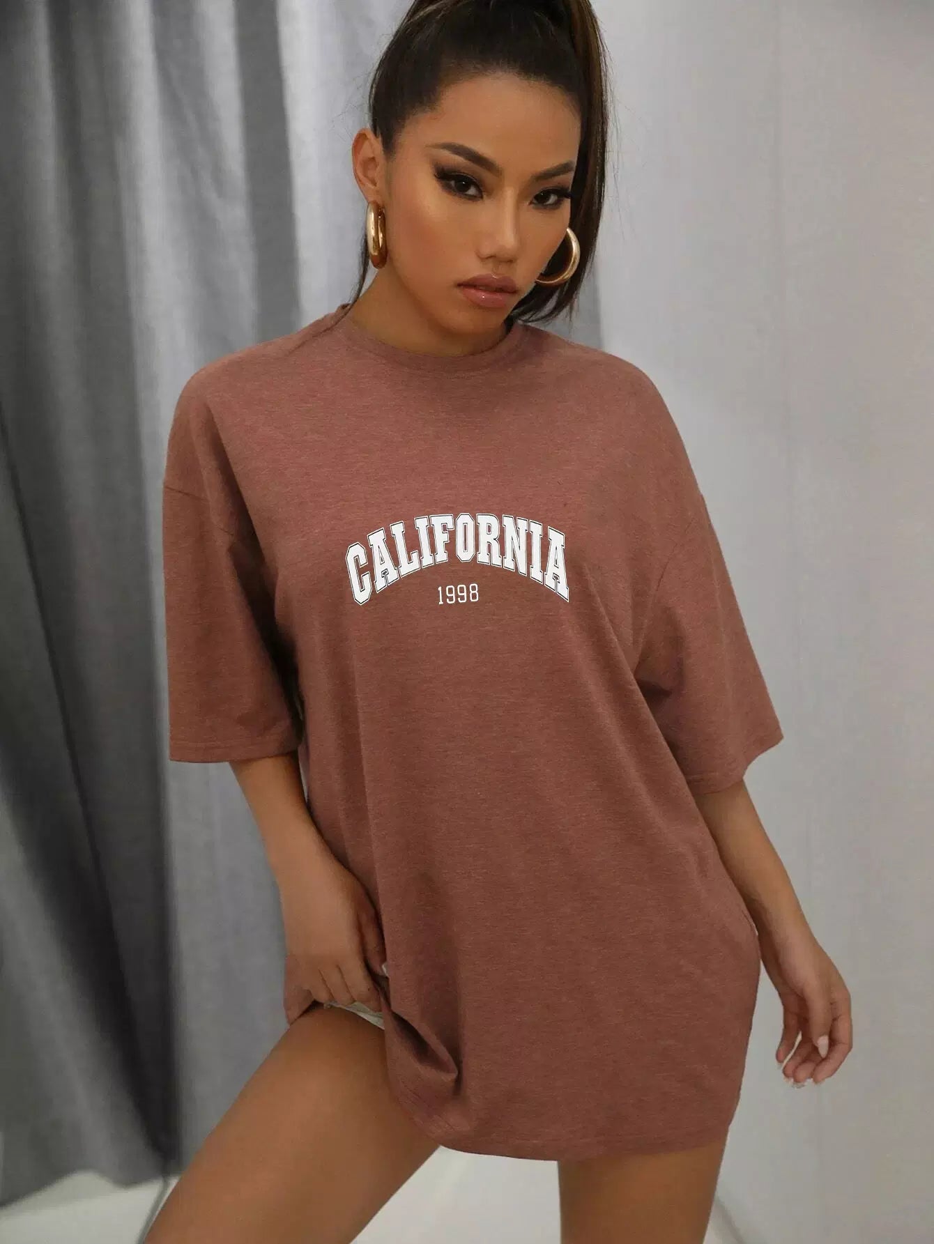 تي شيرت منسدل الكتف برسومات على شكل حرف