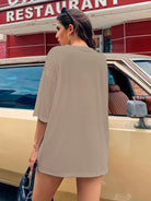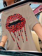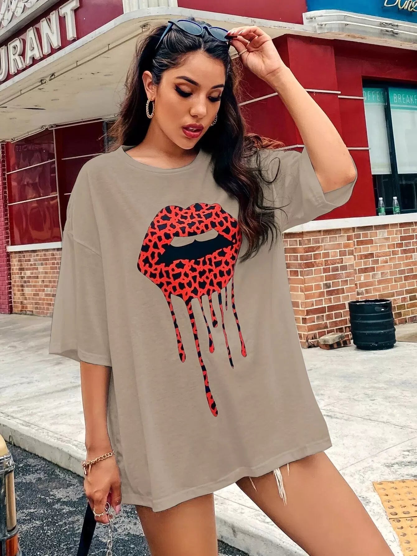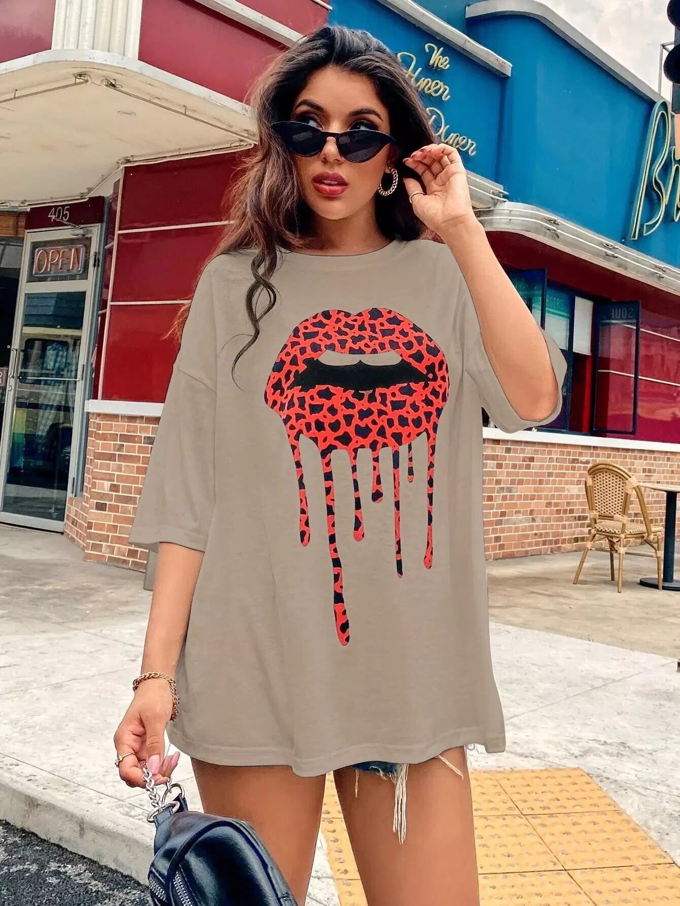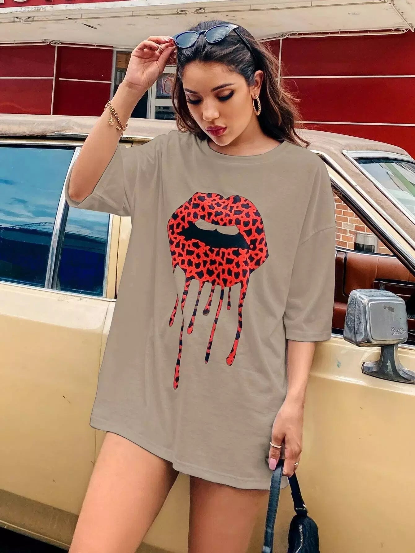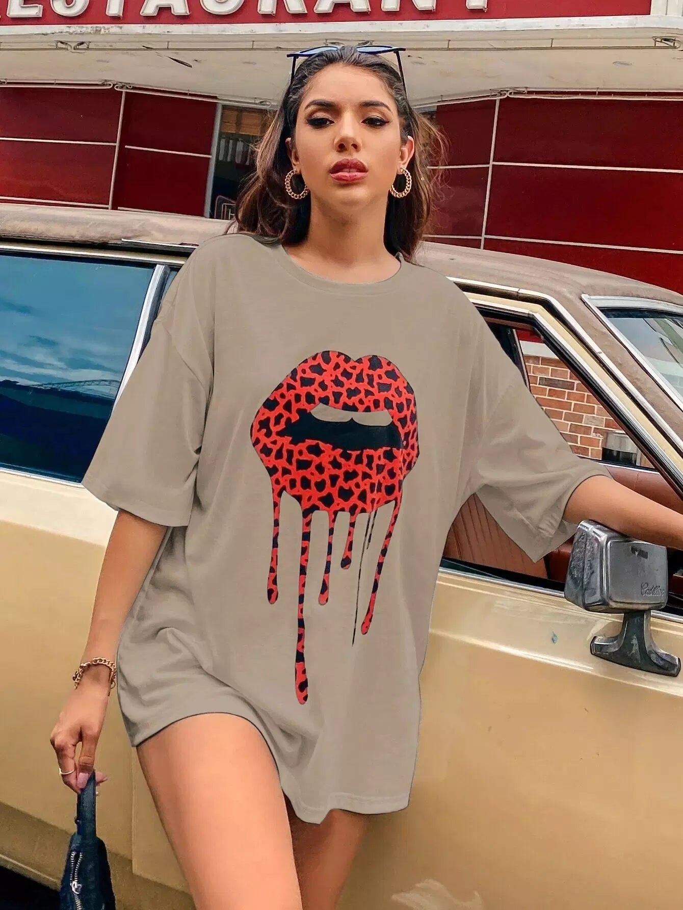 للنساء - تي شيرت كبير الحجم بطباعة الشفاه وأكتاف منسدلة