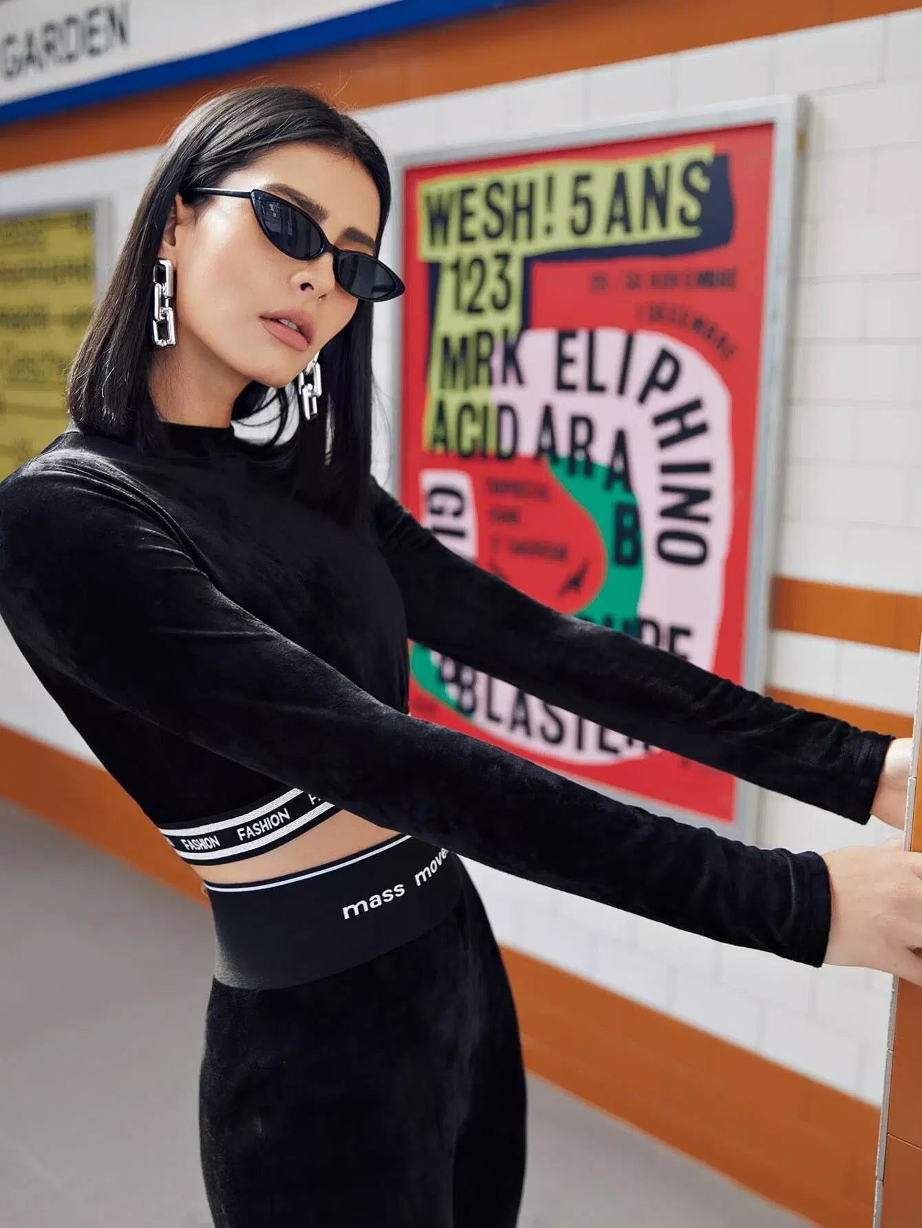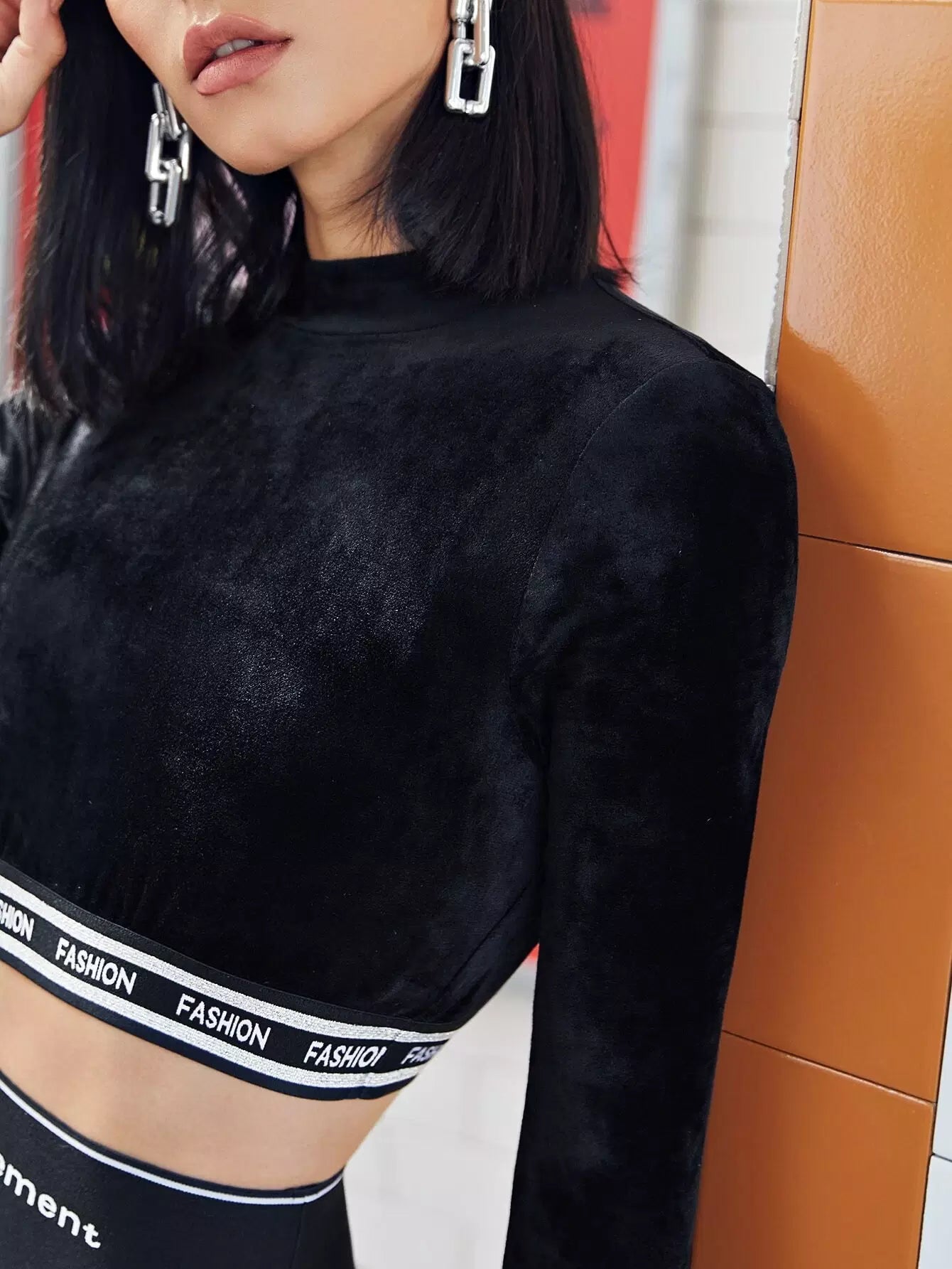 بلوزة مخملية قصيرة برقبة وهمية بحاشية شريطية على شكل حرف
