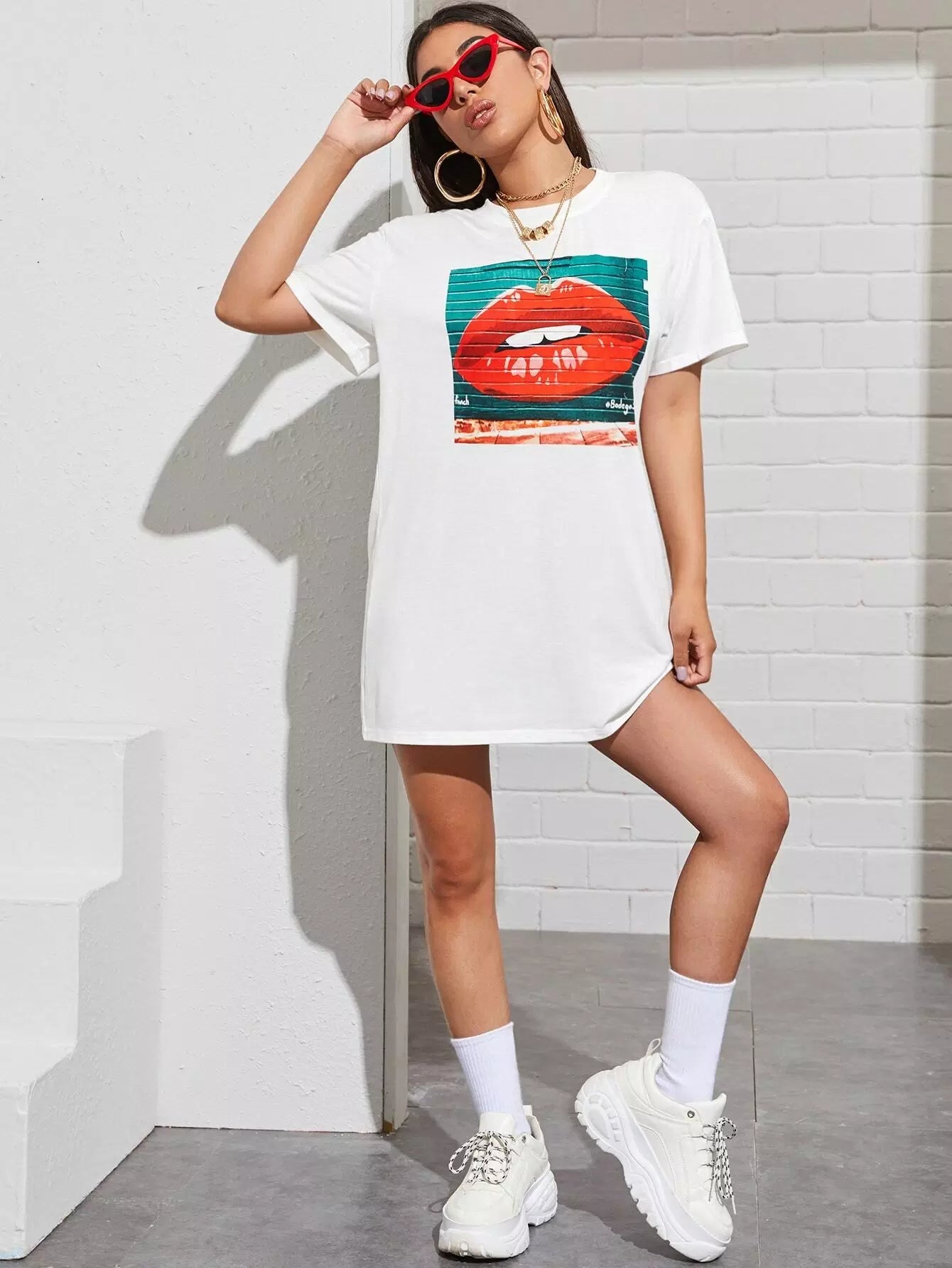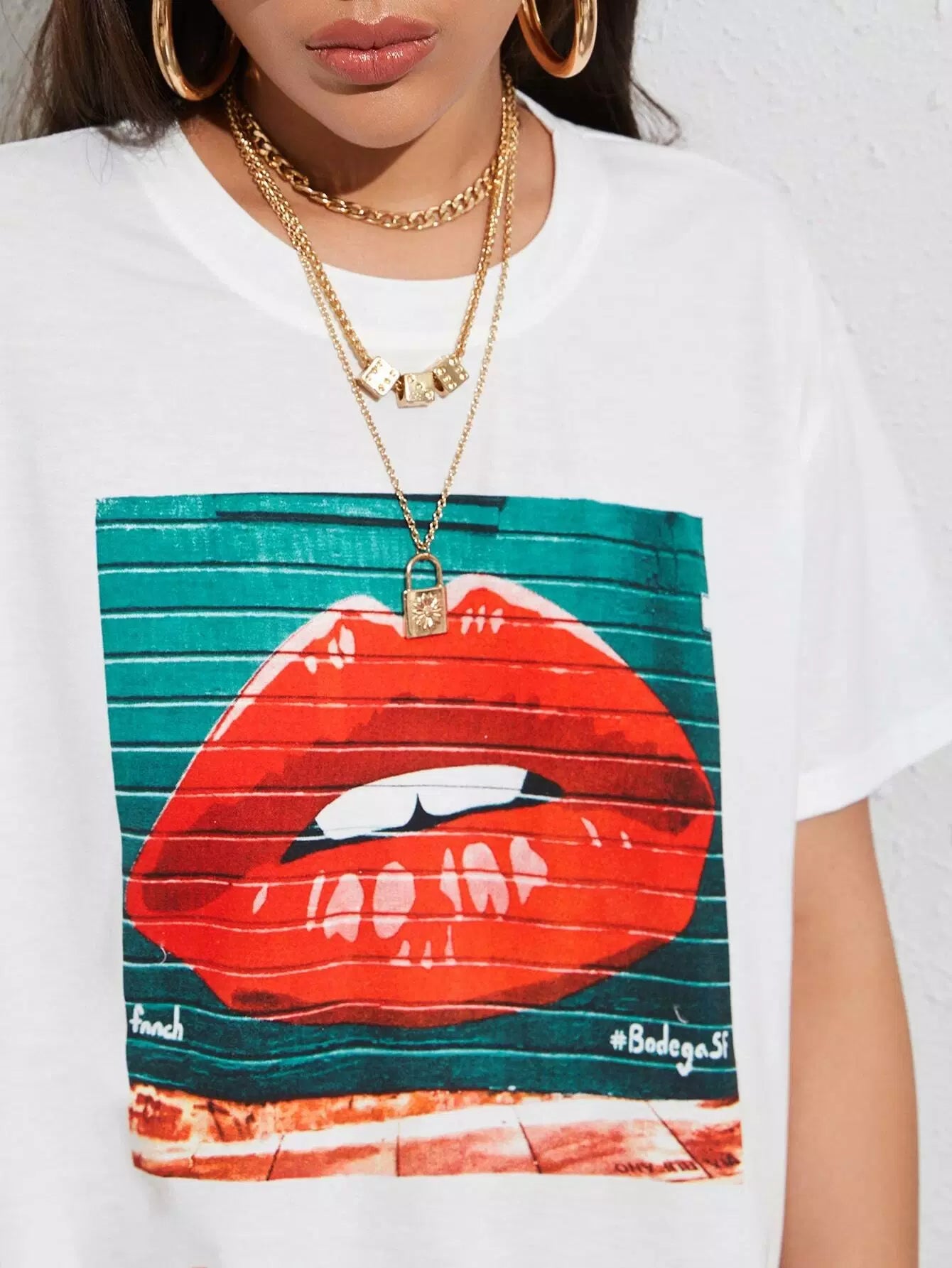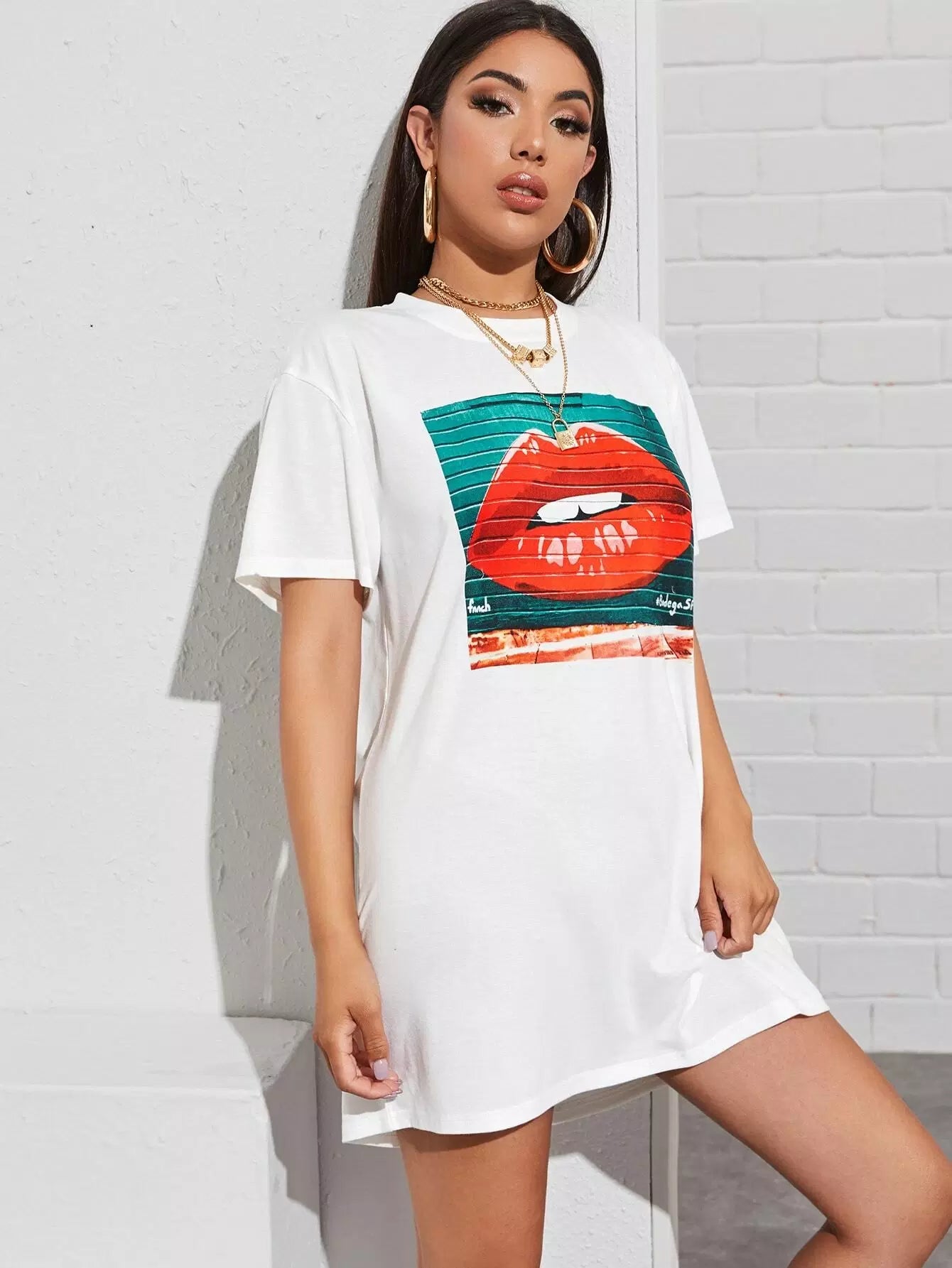 تي شيرت بطبعة فم مطبوع عليه خط طويل
