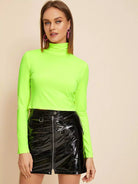 تي شيرت بياقة عالية الرقبة باللون الأخضر النيون
